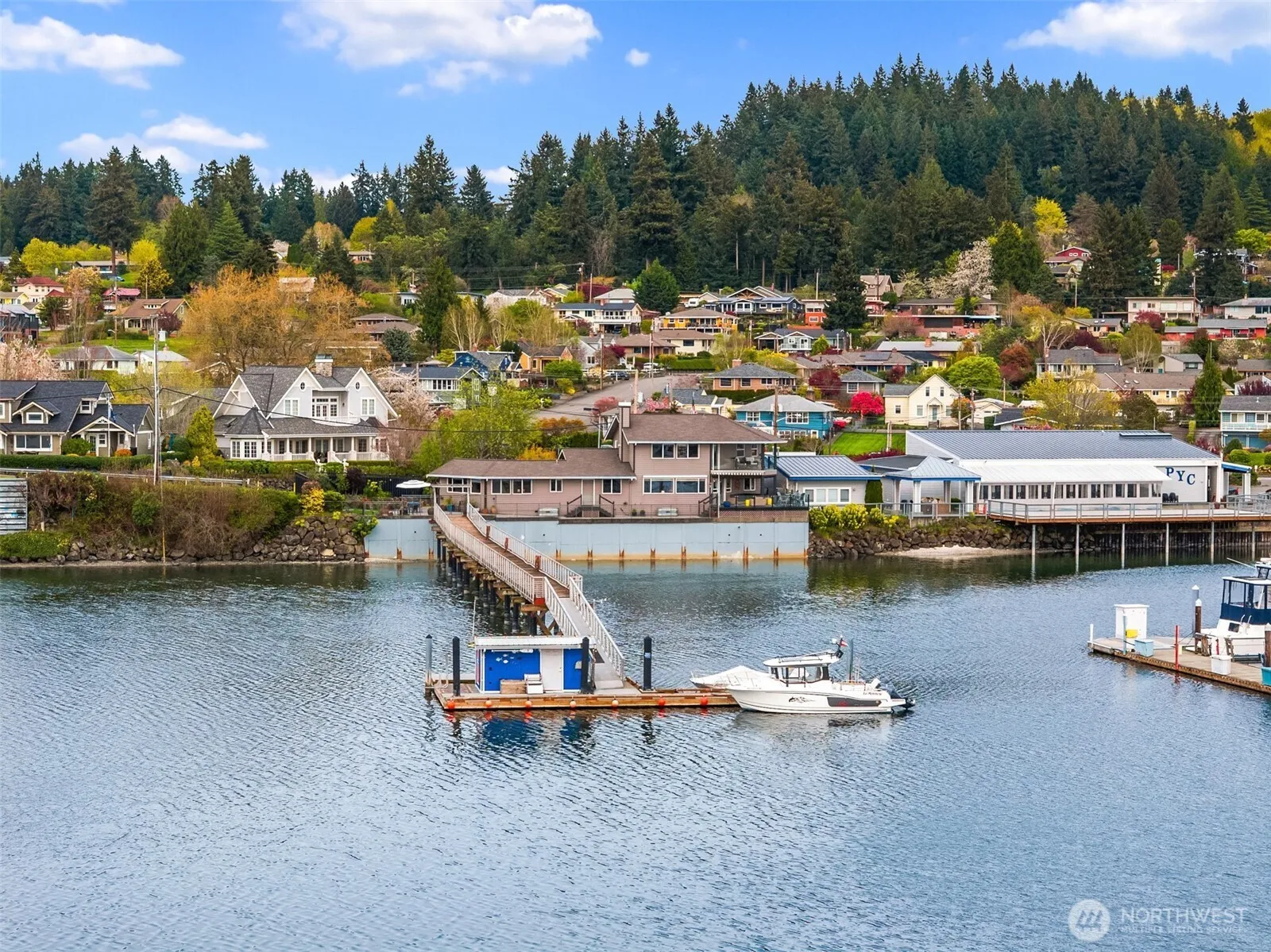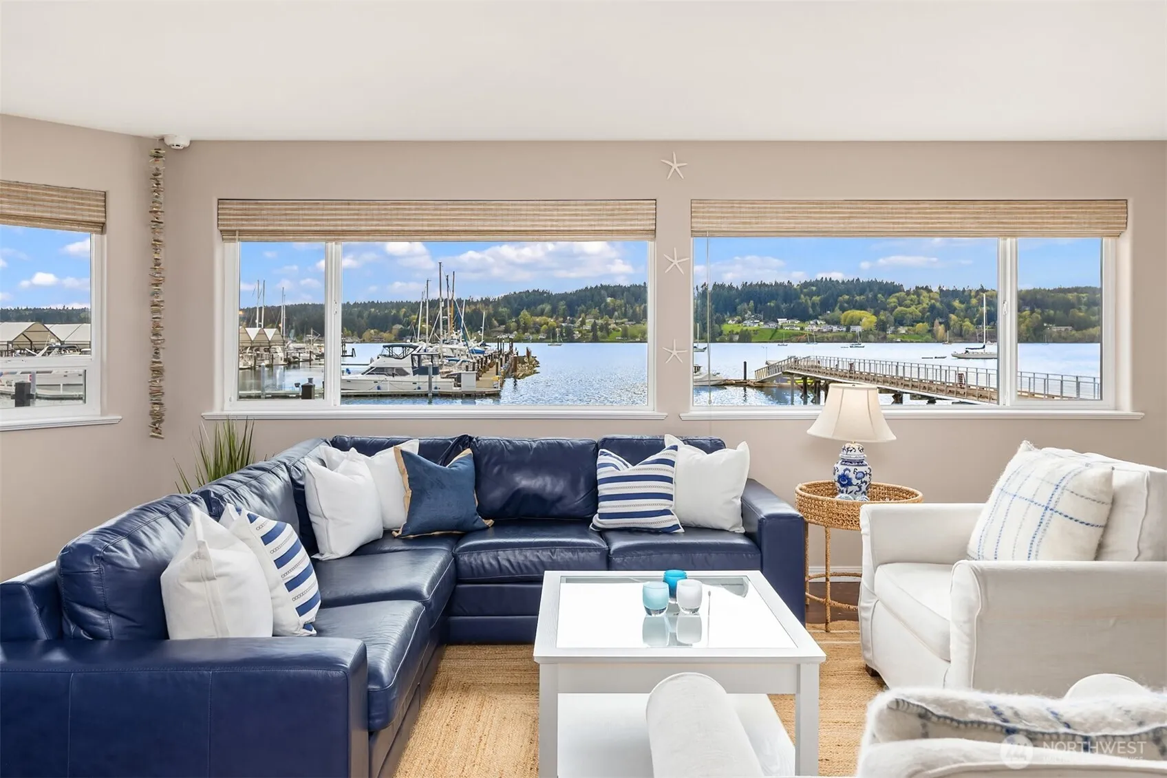 Truly one-of-a-kind, this exceptional Poulsbo waterfront treasure offers 142′ of coveted Liberty Bay frontage with a 280′ pier and a 65′ deep-water dock—a true boater’s dream. Enjoy sweeping views of Liberty Bay, the Olympic Mountains, magnificent sunsets, and Poulsbo’s picturesque yacht club marina from nearly every vantage point. Extensively remodeled with quality finishes, the home blends comfort and character with thoughtful improvements throughout. The main level’s living room, kitchen, and dining area flow seamlessly and open to a covered deck that lives like an outdoor living room, complete with new retractable awnings—ideal for year-round enjoyment as boats glide by. The expansive primary suite, with a new spa like en-suite bath, is a private retreat with its own deck overlooking the water. An attached ADU offers flexibility for guests or multi-generational living. Fully fenced with an automatic gate, the beautifully designed outdoor spaces and mature landscaping create a serene, park-like setting. A stylish art studio with French doors adds versatility for creative pursuits or workspace. Just a short stroll to charming downtown Poulsbo, shops, dining, and waterfront amenities. A rare opportunity to own a truly special legacy waterfront property.