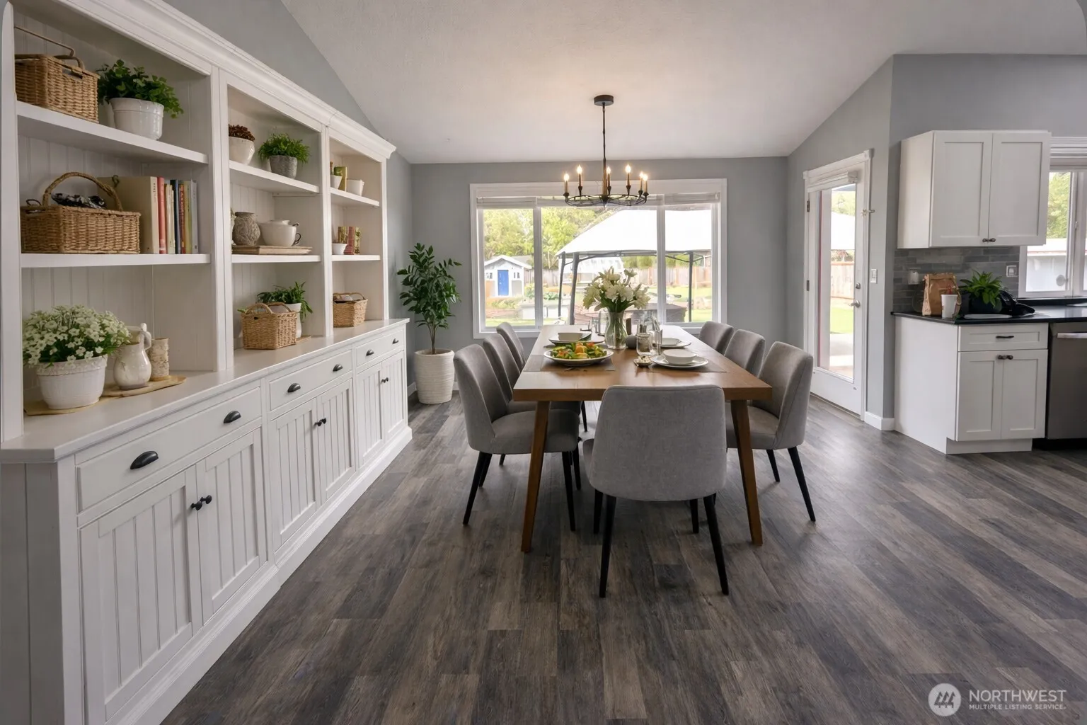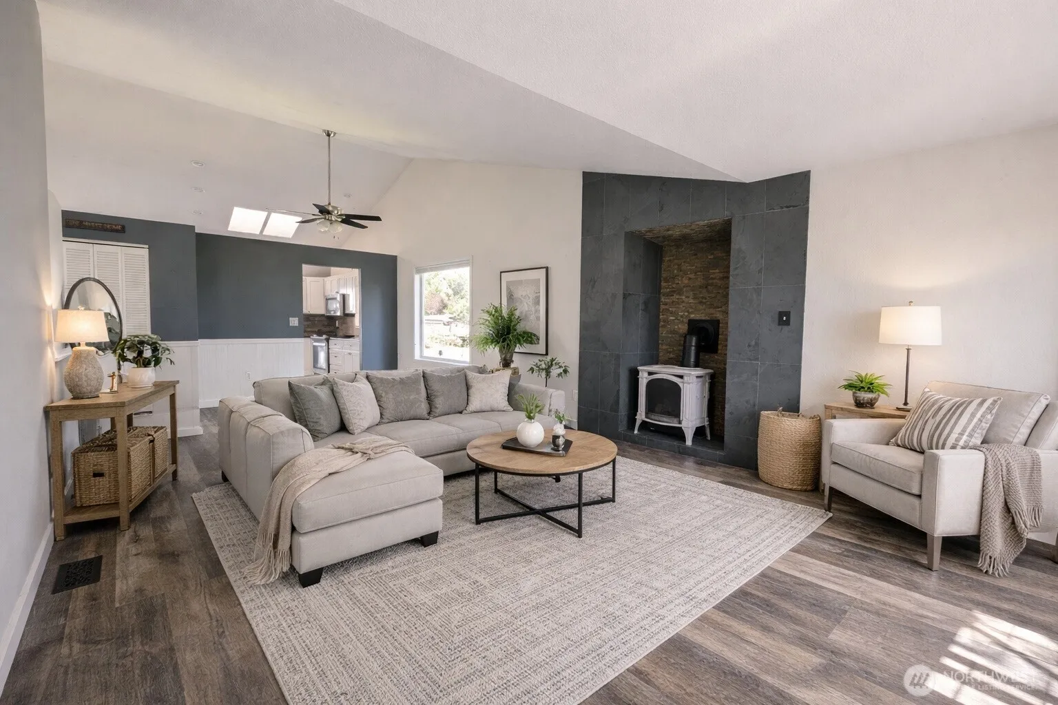 Elegantly updated and move-in ready, this single-level 3 bedroom, 2 bath rambler is perfectly positioned on a spacious corner lot in a highly desirable and tranquil Rochester neighborhood. Vaulted ceilings, warm laminate flooring, and a fireplace with a refined tile surround that create an inviting, elevated living space. The kitchen is thoughtfully designed with white cabinetry, slab countertops, stainless steel appliances, and a stylish tile backsplash, offering both beauty and functionality. The primary suite features a walk-in closet and a tastefully remodeled en-suite with a gorgeous tiled walk in shower, while the hall bath includes upgraded finishes and an oversized soaking tub. Year-round comfort with central A/C. The expansive, fully fenced backyard is a true outdoor retreat, complete with a hot tub, fire pit, extended patio and additional storage. This garden oasis includes an oversized and completely fenced in garden with greenhouse, garden shed, water and electricity. Home has wonderful extras including ample parking with an attached two-car garage and extended driveway, wired for generator, RV parking with electrical hookups. Conveniently located near trails, hunting, fishing, horse back riding, shopping and I-5. This property offers a seamless blend of comfort, style, and livability. *Home is virtually staged.*