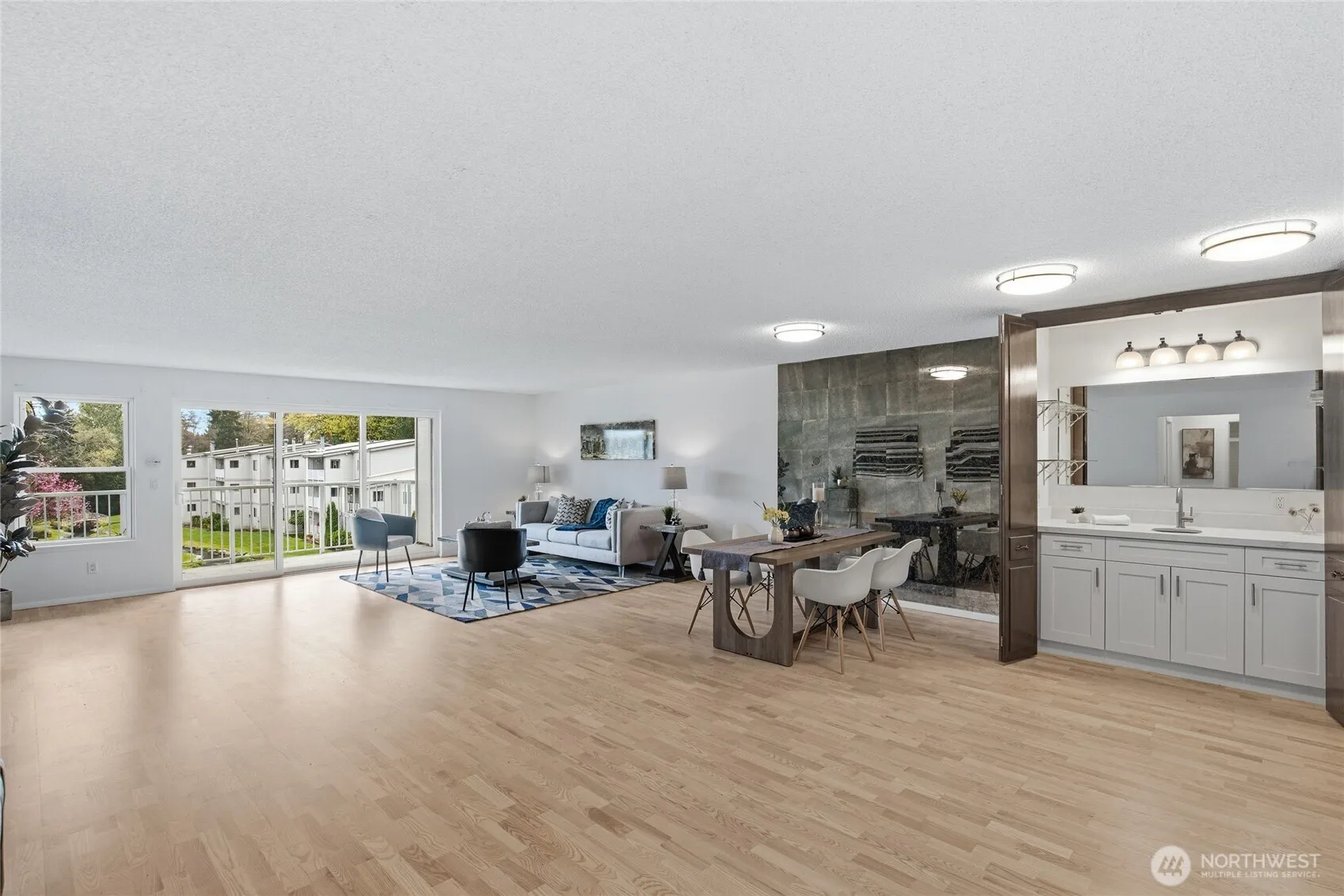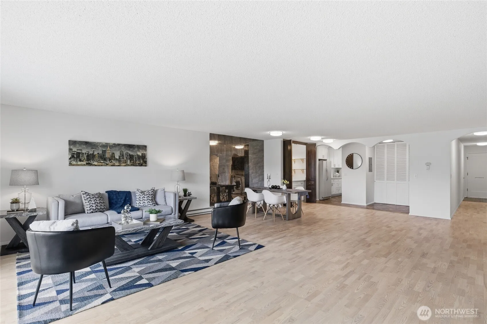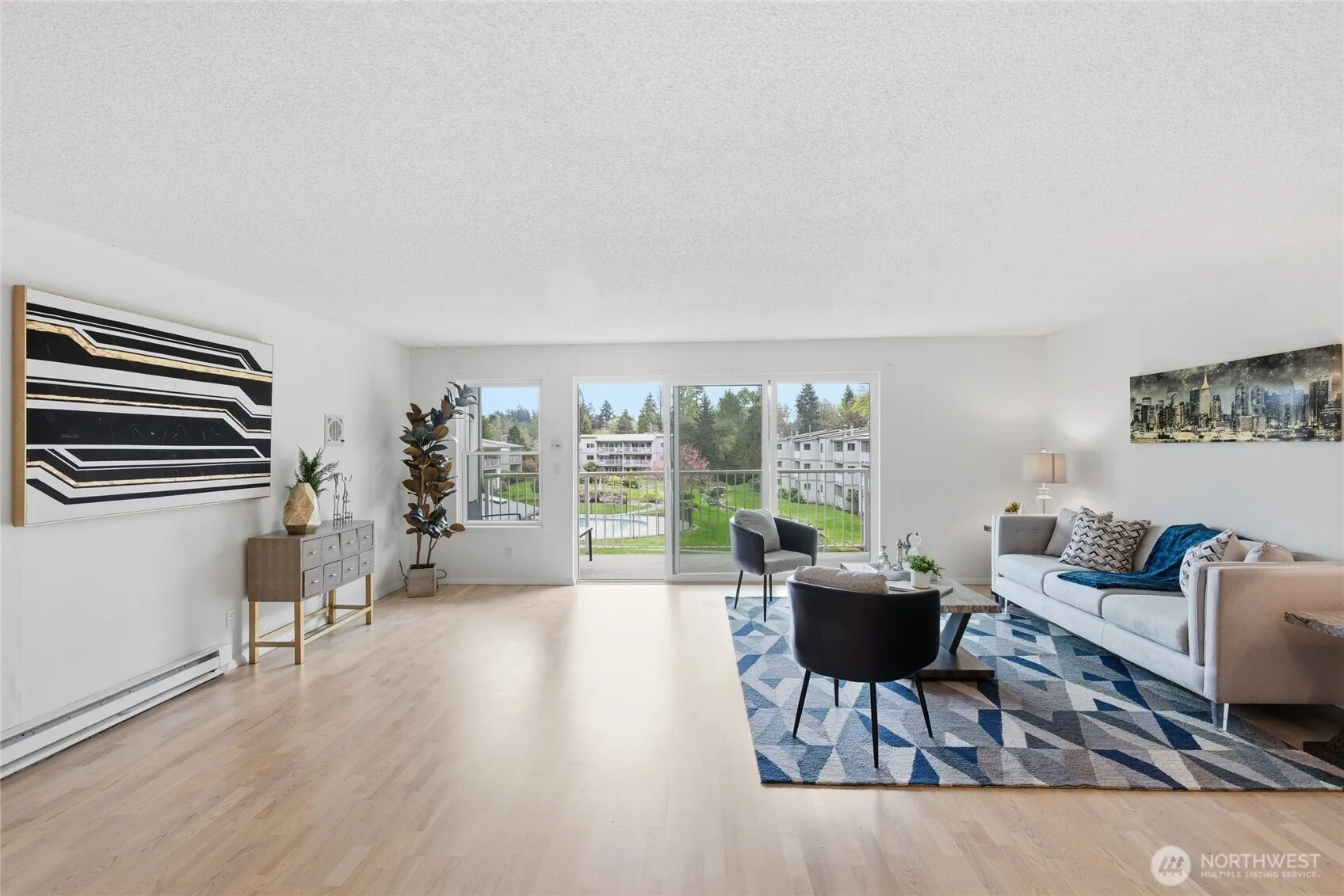 Welcome to this beautifully updated residence in the Bridgehaven community, offering a rare combination of space, comfort, and convenience. This mid level unit features ground level entry with no stairs, providing easy access. Inside, the home opens to an expansive living space rarely found in today’s market, creating flexibility for both relaxing and entertaining. The renovated kitchen features modern appliances and clean finishes, while updated bathrooms bring a cohesive feel throughout. Newer windows and a recently replaced water heater add comfort and long term value. Generously sized bedrooms with oversized closets offer exceptional storage, while an in unit washer and dryer enhances everyday functionality. A wet bar adds an ideal touch for hosting. Step out to your private balcony and enjoy the peaceful, park like setting surrounded by mature landscaping. Additional highlights include two covered parking spaces, a valuable and hard to find feature. Residents enjoy amenities including a pool, hot tub, sauna, and clubhouse, all within a well established community. Ideally located near Jackson Park Golf Course, with easy access to I 5, transit along 15th Ave NE, and the Northgate light rail for connectivity to downtown, UW, and beyond. A rare opportunity to own a spacious, updated condo in one of North Seattle’s most convenient locations.