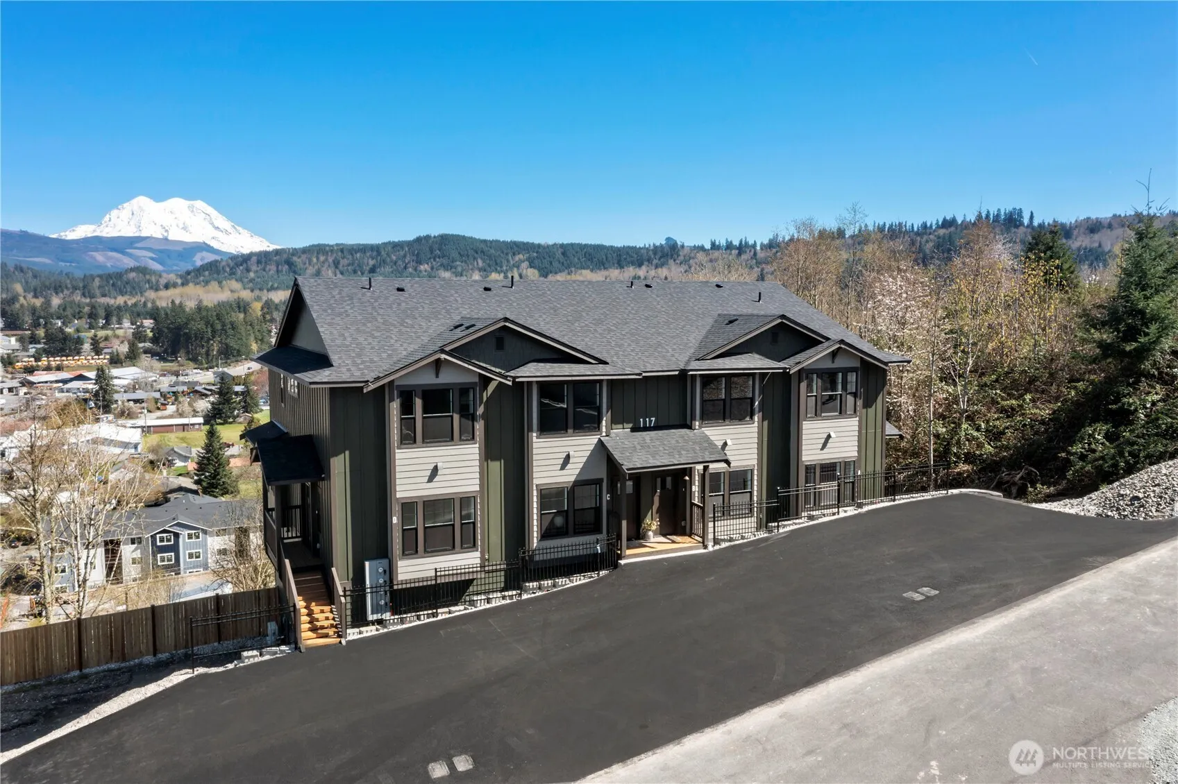Sweeping panoramic views of Mt. Rainier and sparkling Eatonville city lights greet you from every level of this brand new, never-lived-in 3-story condo in a brand-new 4-plex. This is elevated living at its finest in the gateway to Mt. Rainier National Park. The bright, light-filled main floor is perfect for entertaining, featuring tons of natural light, a huge kitchen with separate pantry, spacious dining room, and generous formal living space — all opening to dramatic mountain and city views. Exceptional upgrades include granite countertops in the kitchen and all bathrooms, custom two-tone cabinetry with a dramatic black island and crisp white upper/lower cabinets, wide white-painted trim finished on-site, and beautiful white panel doors. Luxury vinyl plank flooring covers the main floor, baths, and laundry, while plush carpet warms the rest. See photos of the condo across the street built by the same builder — it showcases many of these same high-quality finishes. The flexible floor plan offers two primary bedrooms upstairs and a third bedroom, full bath, plus bonus room downstairs. Every level captures the stunning views. Construction is 100% complete. Condo recording is near finalized, with FHA, VA, and conventional financing approvals in process. Enjoy a quiet hilltop setting above the city, close to downtown Eatonville and minutes from Mt. Rainier recreation. Don’t miss this rare opportunity for affordable home ownership with luxury finishes and million-dollar views!
