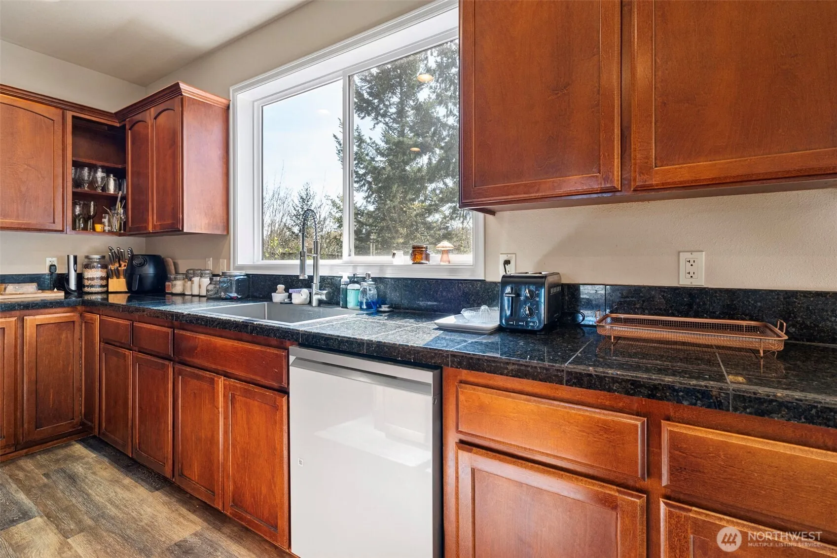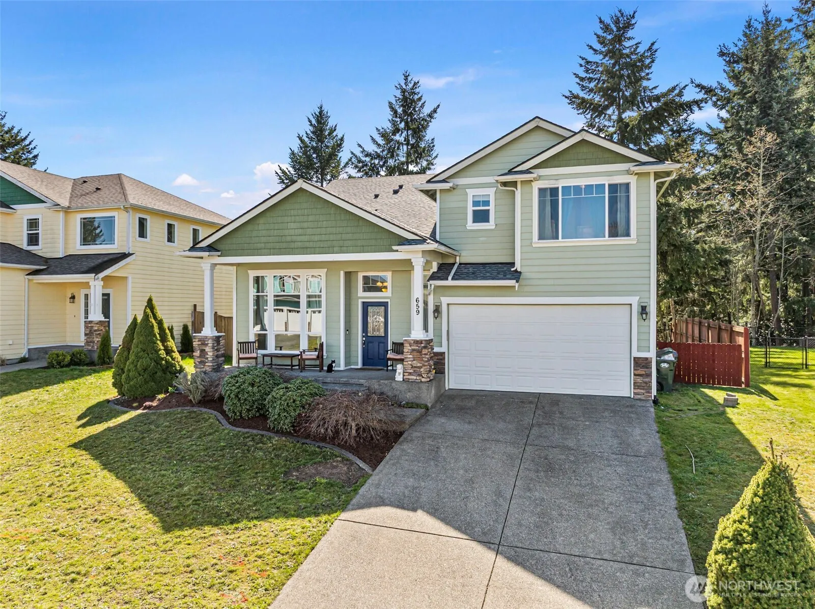 Tucked away on a quiet dead-end street and backing to a natural greenbelt, this 4-bedroom, 2.5-bath Eatonville home offers a private setting with a layout designed for everyday living. The main level features an oversized kitchen with a large island, now complemented by brand new appliances, and opens seamlessly to the dining and living areas—creating a natural flow ideal for both entertaining and daily use. A comfortable living space with a fireplace adds warmth and character to the heart of the home, while the welcoming entry with vaulted ceilings enhances the sense of space. Upstairs, you’ll find all four bedrooms, including a spacious primary suite that includes a soaking tub, separate shower, and walk-in closet. A full second bath and a conveniently located laundry room complete the upper level. The fully fenced backyard backs to a peaceful greenbelt, offering a private outdoor setting to relax or entertain, with a deck that extends your living space into the natural surroundings. Additional features include a new 30 year roof, two-car attached garage and a location that blends quiet surroundings with convenient access to nearby amenities.