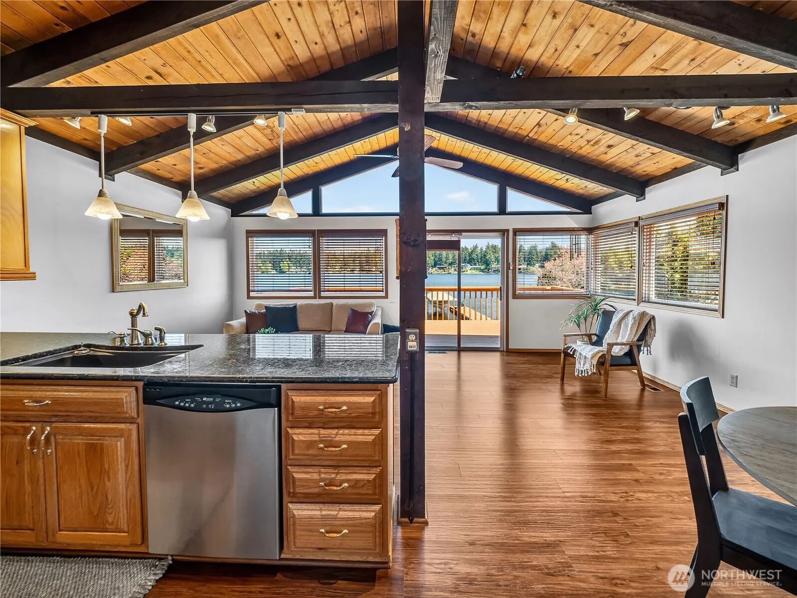 Enjoy summer on 52 feet of Lake Sawyer waterfront, featuring a dock and covered boat lift. This 2,140 sq. ft., 4-bedroom, 2-bath home sits on an 11,306 sq. ft. lot with a spacious, lake-level yard and fire pit. The open layout includes a vaulted beam kitchen, dining area, and lake-view living room with deck access. A secondary living room also opens to the deck. The updated kitchen offers stainless steel appliances, a 5-burner gas stove, and slab granite countertops. Three bedrooms and a full guest bath are located on the main floor, while the primary suite upstairs includes a walk-in closet and private bath with a jetted tub shower combo. Recent upgrades include a new 50-year PABCO Premier roof (April 2026), updated vinyl windows, and LVP flooring throughout the main level. Major addition done in 1991 included all new wiring, plumbing & windows. The home has a gas forced air furnace and gas water heater, plus over 400 sq. ft. of unfinished daylight basement. Ample off-street parking and mature garden beds complete the property. Beautifully maintained by the owners for 52 years.