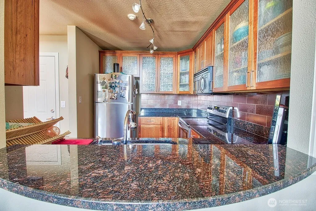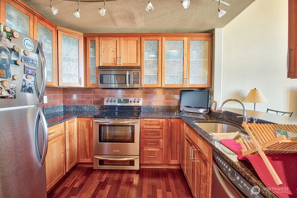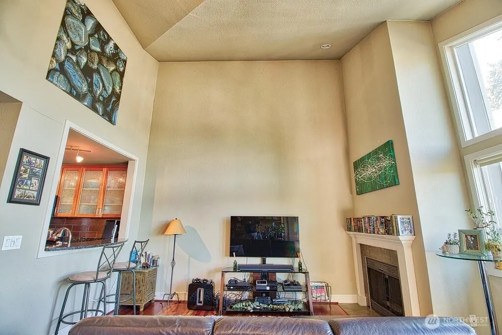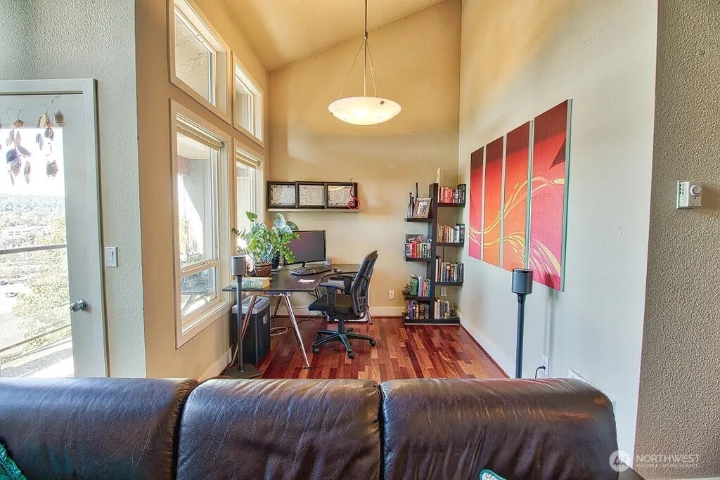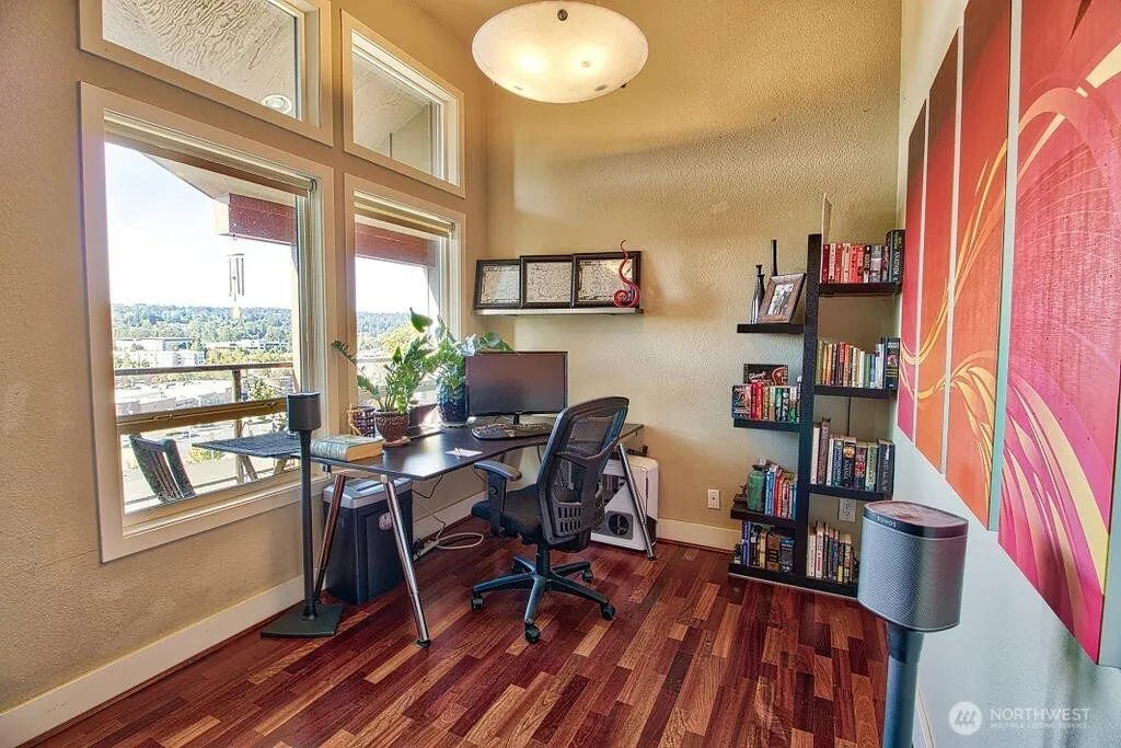Set in the heart of Redmond, this Bella Vista Condominium residence offers a peaceful, residential vantage point while staying seamlessly connected to the best of the Eastside. Surrounded by local dining, coffee shops, boutique retail & everyday conveniences, it offers a vibrant yet comfortable lifestyle. Commuting is exceptionally convenient w/ the Link light rail just a few blocks away, now fully connected across I-90, providing a direct, car free option from SeaTac Airport to North King County. Nearby access to major routes offers easy connectivity to Bellevue, Kirkland & Seattle. Close proximity to Marymoor Park & the East Lake Sammamish Trail adds year round outdoor enjoyment. Sun drenched & west facing, this 1 bedroom condo captures sweeping territorial views & abundant natural light through expansive windows & soaring 18 ft ceilings. The open concept layout lives large w/ Brazilian cherry floors, cozy fireplace & seamless flow to a spacious private balcony, perfect for morning coffee or evening sunsets. The kitchen features SS appliances, granite slab countertops, generous prep space, warm cherry cabinetry & eating bar. Versatile den offers ideal work from home, flex or dining space w/ views. Spacious bedroom, elegant full bath w/ soaking tub. Includes in unit front loading W D, great storage & 1 assigned parking space. Bright, airy & private, this home lives like a spa-like retreat!