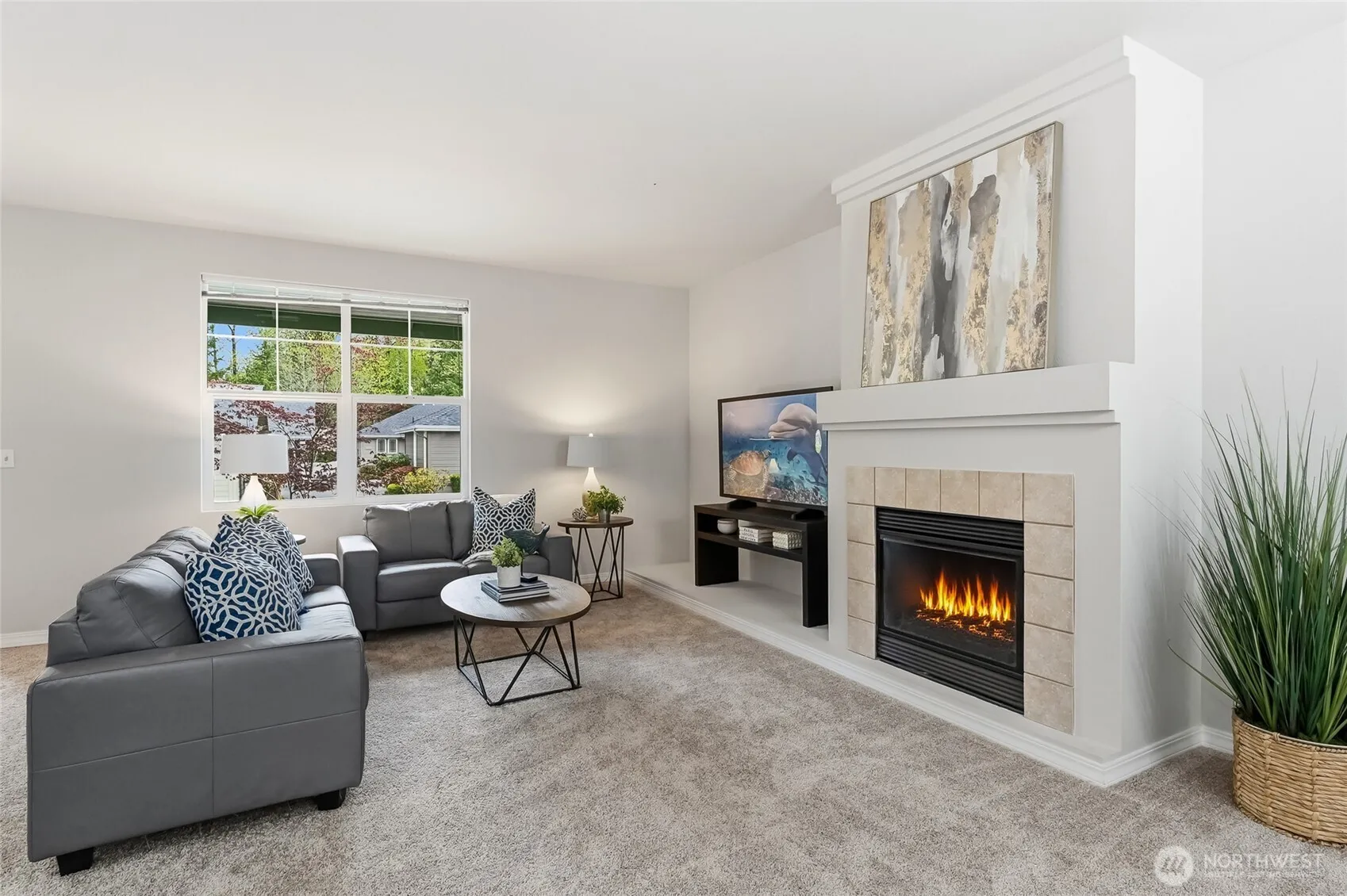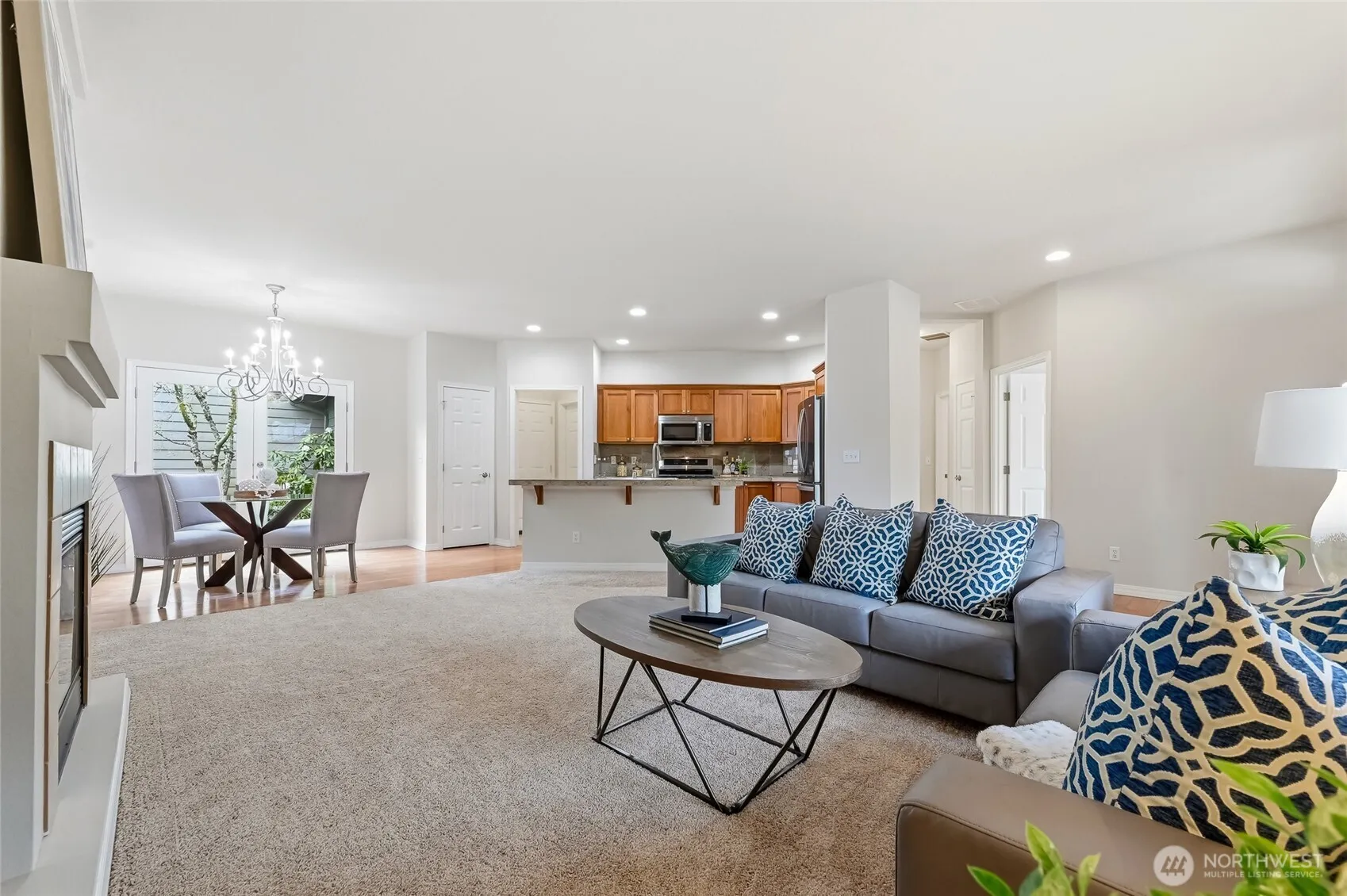 This 3 bedroom Orchard plan home has a spacious feel with high ceilings and open style concept perfect for one level living. The great room space seamlessly connects the kitchen, living and dining areas, creating an inviting space for gatherings with its cozy gas fireplace. The kitchen has ample cabinets, stainless steel appliances and a breakfast bar. Freshly painted and new carpet throughout. Generous primary with a ¾ en-suite and walk-in closet. Two additional bedrooms, one of which makes a nice office. New roof with transferrable warranty and new exterior paint in 2024. EV charger in the 2 car garage with just a gentle slope into the home, no stair entry. Private courtyard-style backyard with a patio and nice garden space. TAs the PNW’s flagship 55+ master-planned community, Trilogy offers more than just a place to live, it’s a resort lifestyle with a beautiful clubhouse, fitness center, indoor pool & walking track, pickleball & tennis courts, miles of walking trails and a true sense of community. One occupant must be age 55. No kids under age 18.