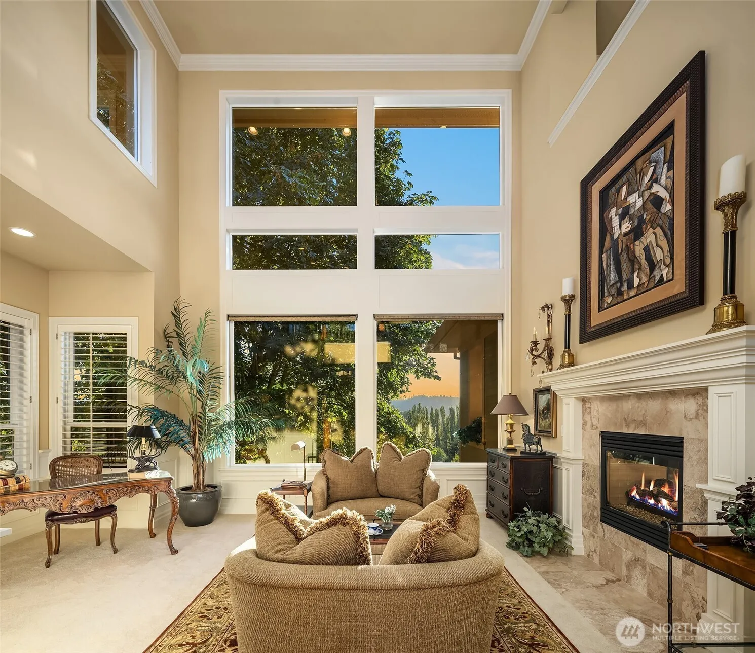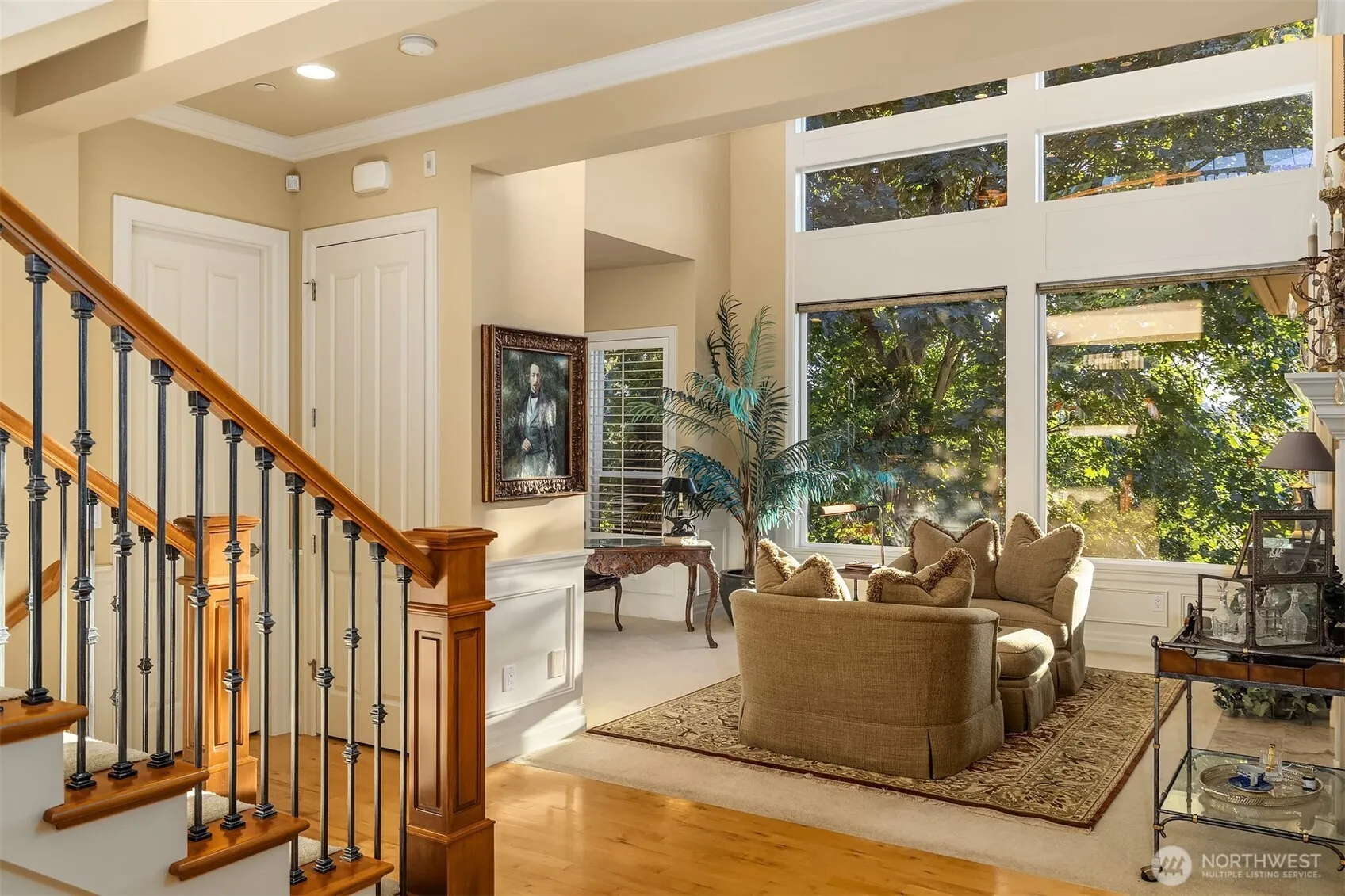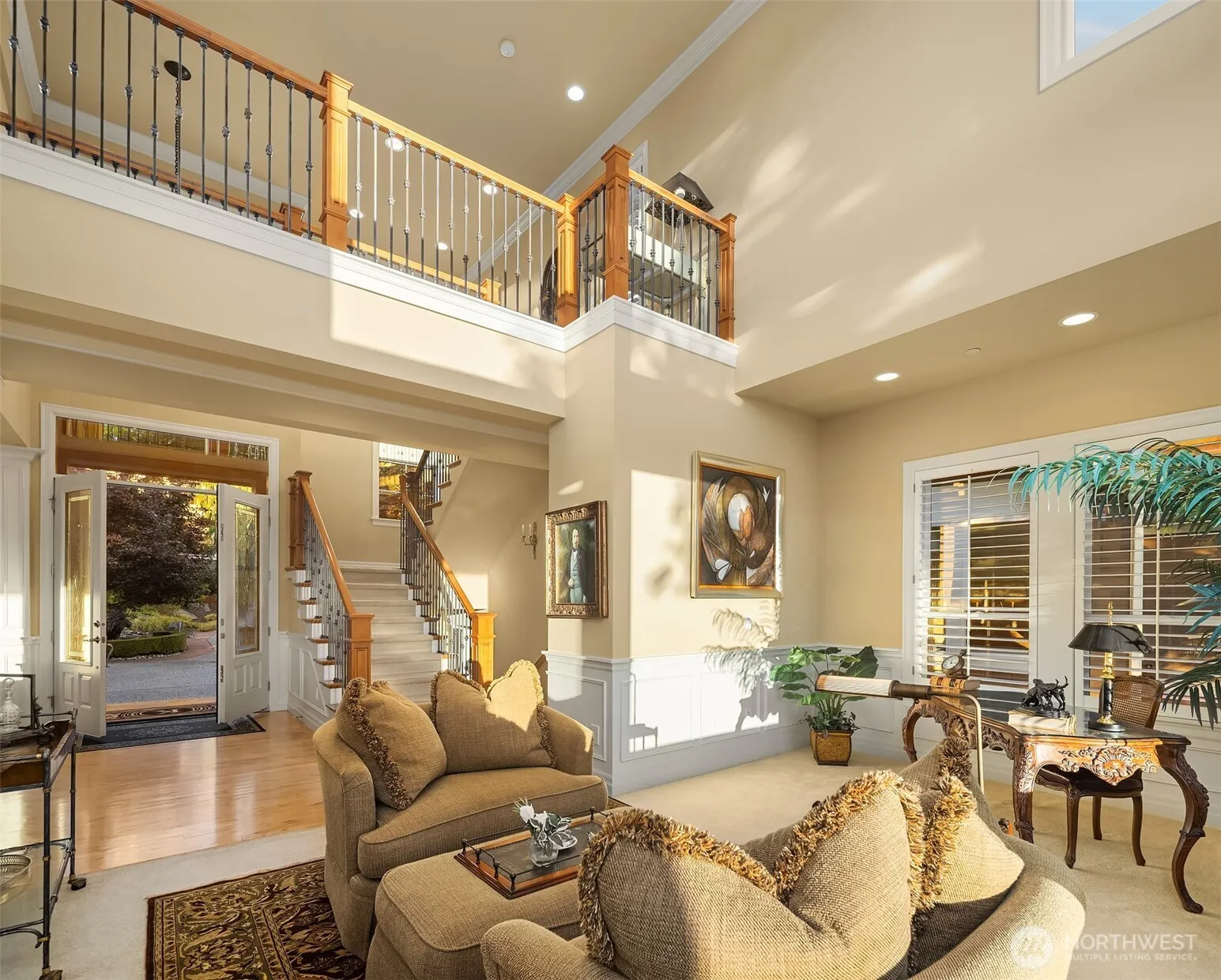 Dramatically perched on the hilltops of Mondavio with unobstructed top of the world views sprawling over the Sammamish River Valley, Willows Golf Course & beyond, this magnificent 4,790sf northwest contemporary masterpiece is the prized find of a lifetime! Elegantly finished & spectacularly overbuilt in 2008 with extraordinary architecture embracing glowing westerly vistas. Soaring ceilings & oversized windows drench the spacious layout in natural light. Stunning iron rail staircase with skybridge dazzles upon entry while ornate woodwork & extensive built-ins shine throughout. An entertainer’s delight with grand formal living spaces & pristine chef’s kitchen with commercial appliances, extended center island & butler’s pantry with wine fridge & wet bar. Family room with floor-to-ceiling stone fireplace & wall-to-wall sliders opens to generous covered balcony with slate tile, glass railing & roaring corner fireplace, seamlessly blending the outdoors in. Extravagant primary retreat with cathedral ceilings, covered balcony & gorgeous marble ensuite with jetted tub, dual walk-in closets & private laundry. Lofted upper den/office + secondary ensuite. Apartment ready daylight basement with sweeping rec room, 4th bed, tiled bath, dual offices, kitchen hookups, utility room, full-length covered patio & shaft for elevator upgrade. Peacefully tucked away in a serene nature setting with direct access to the Burke-Gilman trail, yet conveniently located just moments to downtown Redmond!