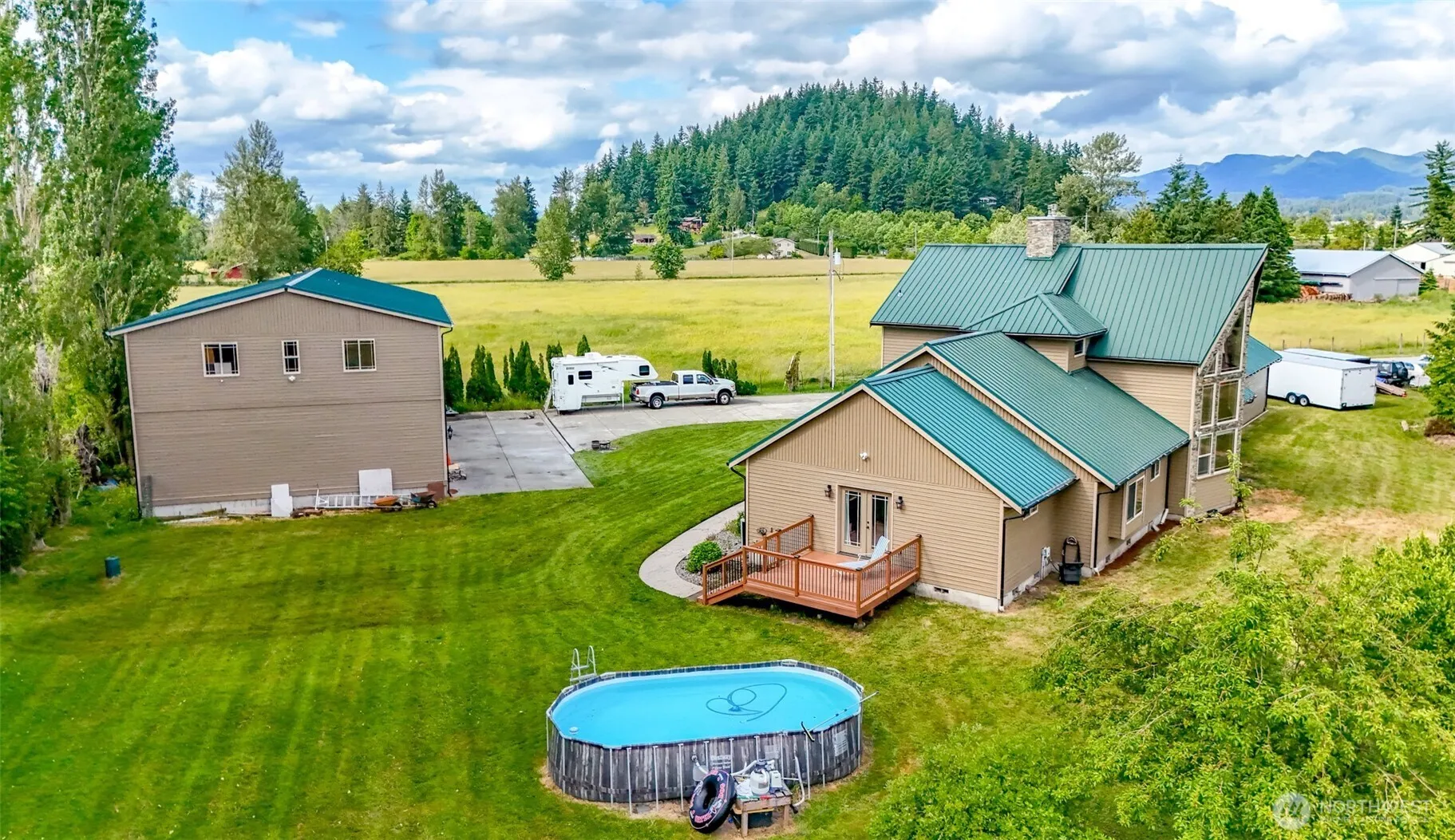 Gorgeous Custom Home on 2.66 acres +/- w/beautiful mountain views. Over 3300Sf w/3 bedrooms 2.5 bathrooms, huge gourmet kitchen w/ island. Great room concept w/ 2 story river rock fireplace, vaulted ceiling’s & floor to ceiling windows. Upstairs primary suite w/fireplace & 5 piece bath, complete w/jetted soaking tub and oversized shower. You will love the 2 large main floor bedrooms. The separate rec room leads to the side yard and has a wet bar. Huge 2 story detached shop (4300 +/-sf), with the possibility of an ADU. The attached 3 car garage (1350 +/- sf) has a hobby/storage room. Ideal for horses, mechanics, hobbyists, RV’s and more! There are many fruit trees and plenty of garden spaces! Close to 410, downtown Enumclaw and Buckley!