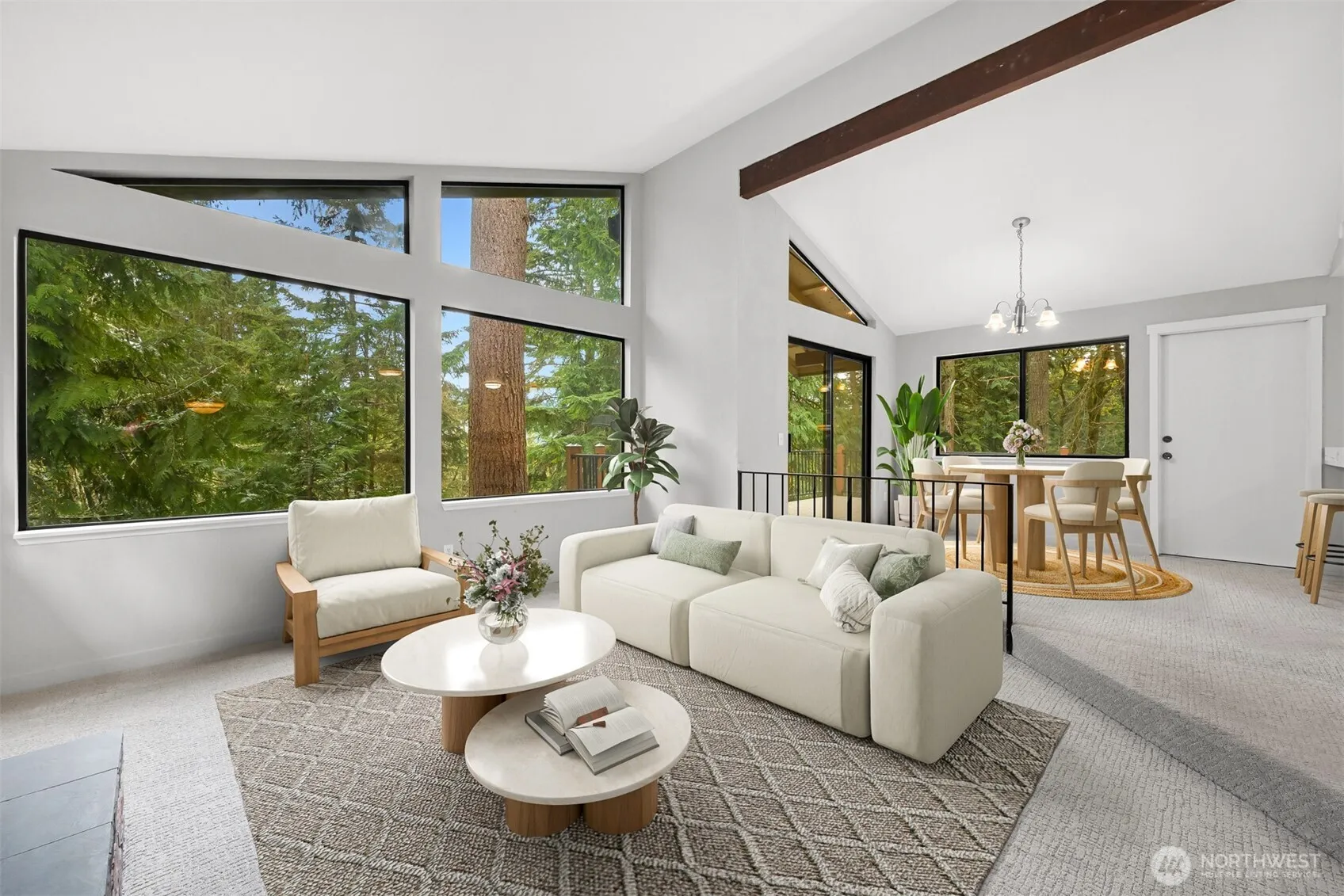 Nestled among the trees, this home offers a true sense of privacy and tranquility on a large triple lot. Spacious open-concept layout connects the living, dining, & kitchen creating a true entertainer’s dream. Soaring vaulted ceilings with exposed wood beams create a warm, inviting space, while windows on every side frame peaceful forest views. Double doors welcome you into your own private retreat, where indoor/outdoor living shines with a spacious, updated deck just off the dining room. New electric hot water heater and new mini split system on both levels installed in 2025, fresh carpet, attached garage, 3 bedrooms & 2.5 baths, this home truly has it all.