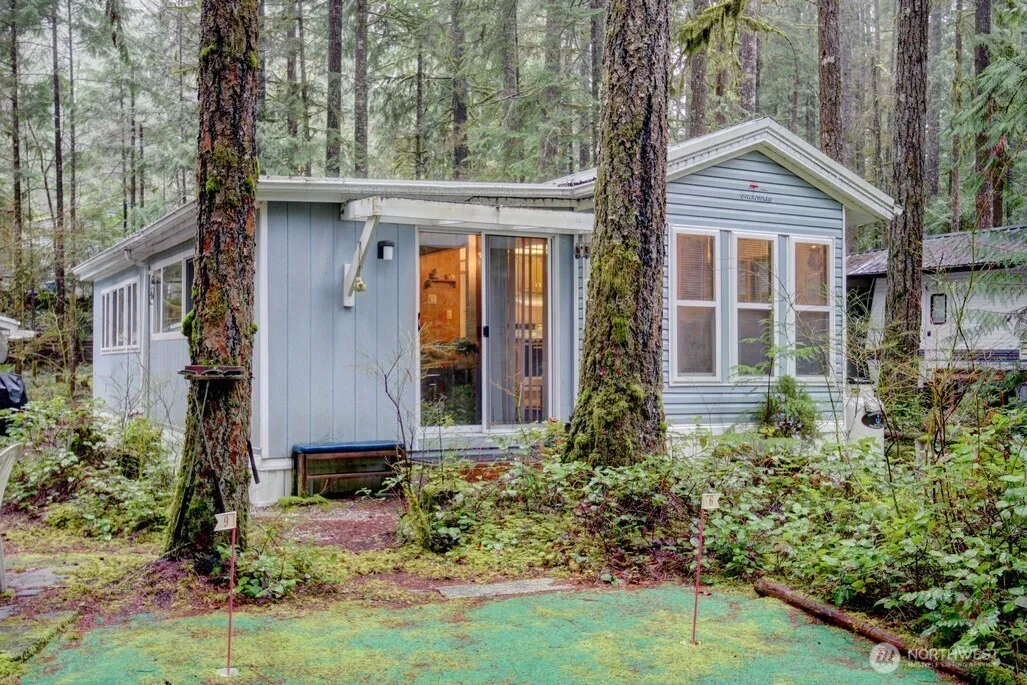 Oversized 4,792 sq ft lot at The Glen at Maple Falls on a very quiet low traffic dead end street. 1993 399 sq ft Park model with a large added insulated add-a-room for additional sleeping area and large living room. Shed also included in sale for extra dry storage. Backs up to partial greenspace with an elevation change that provides privacy. Artificial putting green in the front of the lot and private firepit area with pavers in the back of the lot. The Glen is zoned recreational for 120 days of use out of the year and has all the amenities you could want, including 2 pools, hot tub, pickleball courts, library, laundry mat, 2 clubhouse, 24 hr security, gated entry, & play areas. Conventional financing available with U.S. verified income via 21st Mortgage.