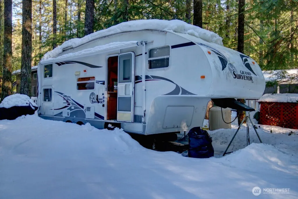 Centrally located lot near all amenities in Division 6. Lot is adjacent to a trail so there is additional privacy and gives the lot a feeling of being larger than the 3,485 sqft size. Insulated shed that can be used as a flex space and/or storage. Firewood shelter with wood will make you ready as soon as the rec fire ban is lifted. Covered firepit lets you enjoy year-round camp fires. Uncovered deck and covered picnic table. 2005 Surveyor fifth wheel is included in sale . Trailer has multiple sleeping areas inside. Trailer is currently in the Glen storage lot. The Glen is zoned recreational for 120 days of use out of the year and has all the amenities you could want, including 2 pools, hot tub, two pickleball courts, library, laundry mat, 2 clubhouses, 24 hr security, gated entry, & play areas.