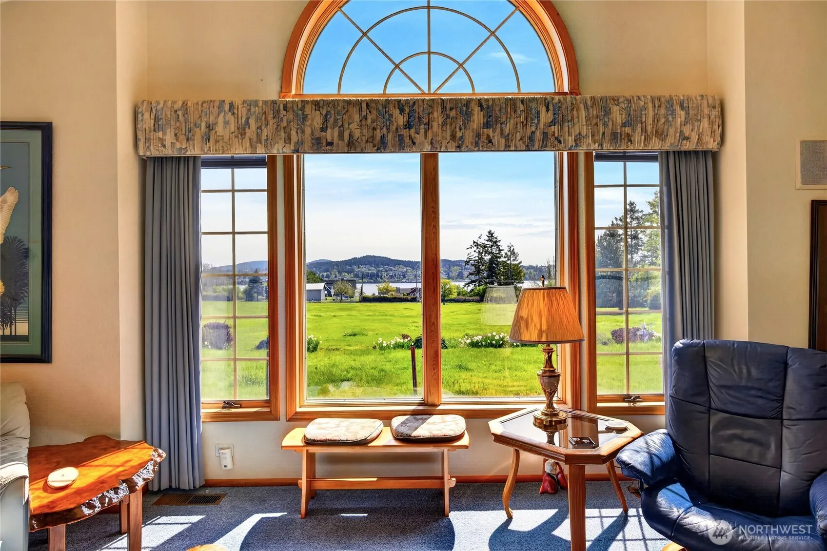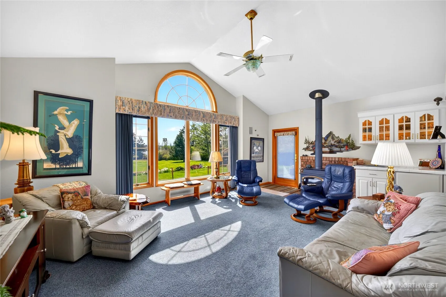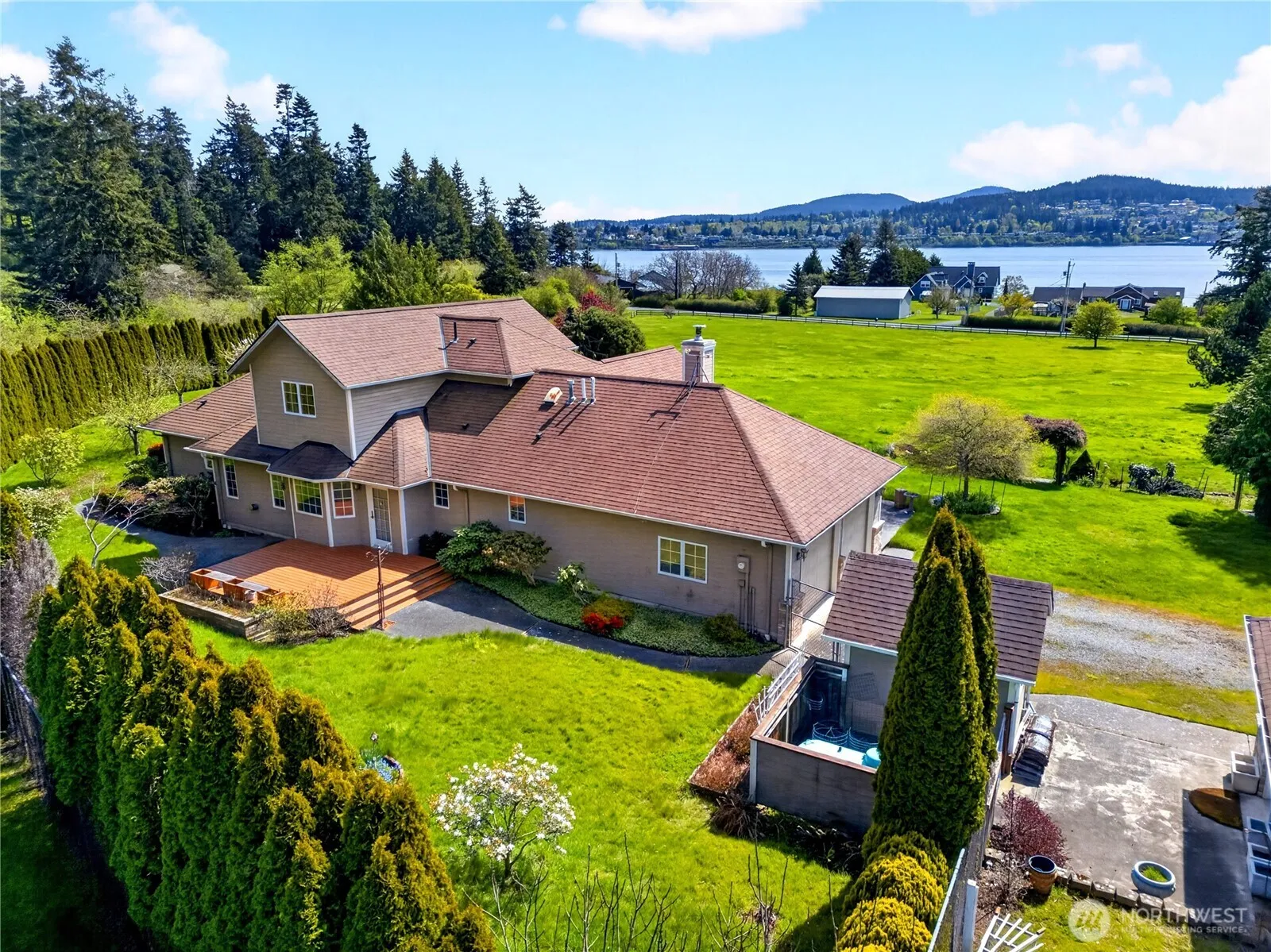 Experience refined Northwest living on 9.5 private acres with sweeping, unobstructed views of the Guemes Channel. This 2,895 SF estate captures light, space, and scenery from nearly every room, creating a setting that feels both elevated and serene. The expansive great room showcases soaring ceilings, a gas fireplace, and dramatic picture windows that frame the water and surrounding landscape. A spacious kitchen anchors the home with an oversized island, abundant cabinetry, and a sunlit breakfast nook that opens to a view deck, perfect for morning coffee or evening sunsets over the channel. Entertain with ease in the formal dining room, or unwind in multiple living spaces designed for comfort and connection, all enhanced by stunning water vistas. The primary suite is a private retreat featuring generous proportions, a walk-in closet, and a spa-inspired bath with soaking tub and peaceful garden outlooks. Outdoors, enjoy a south-facing patio, lush mature landscaping, and wide open grounds that offer both privacy and possibility. The property includes an attached 2-car garage plus a detached 3-car garage, ideal for storage, hobbies, or additional vehicles. A rare opportunity to own acreage, privacy, and commanding water views, crafted for those who value lifestyle, space, and timeless appeal.
