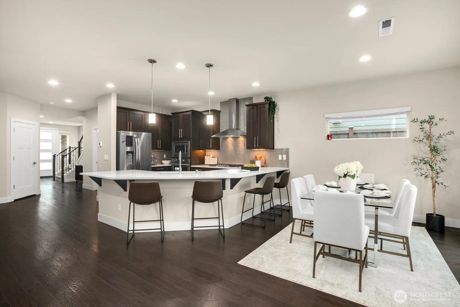 Discover elevated living in this elegantly designed, north facing home, perfectly positioned in one of Bothell’s most desirable neighborhoods within the renowned Northshore School District. Recently refreshed with tasteful paint touch-ups and meticulously maintained, this 5 bedroom, 2.75 bath residence showcases a thoughtfully planned layout that harmonizes modern comfort with understated sophistication. A main level bedroom with a ¾ bath provides flexibility for guests or multi generational living. At the heart of the home, the gourmet kitchen impresses with sleek quartz countertops, a statement 5 burner cooktop with extraction hood, soft close cabinetry, designer pendant lighting, and an expansive pantry seamlessly flowing into grand, light filled living spaces highlighted by soaring ceilings and abundant natural light. Upstairs, the serene primary suite features a private balcony, spa like 5 piece bath, and a generous walk in closet. Designed for modern living, the home also features energy efficient heating and cooling systems for year round comfort. The low maintenance backyard, enhanced with stylish pavers, offers a versatile outdoor setting perfect for entertaining in any season. Ideally located near top rated schools, parks, shopping, dining, and major tech hubs, this pre inspected home offers an exceptional blend of tranquility, convenience, and enduring appeal. Welcome Home!