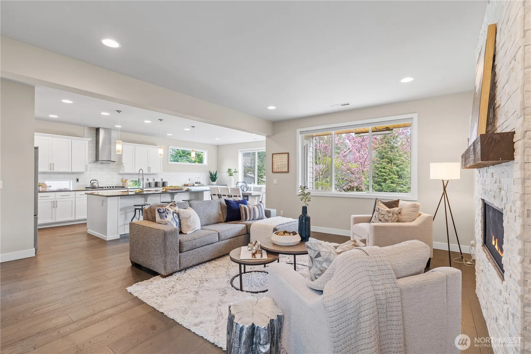 Contemporary like-new, beautifully designed home offers seamless living. The heart of the home is the spacious great room with a stacked stone accent fireplace, bathed in light with sliding doors to the rear deck and substantial yard. The chef’s kitchen features a large center island with quartz slab counters, a walk-in pantry and dining room lined with a built-in buffet. The flowing floor plan offers a main floor bedroom and bathroom as a perfect guest retreat. The upper floor includes the sumptuous primary suite with a sitting area, a generous customized walk-in closet and a luxurious spa bath with a walk-in shower and soaking tub, fit for a queen. Three guest suites, a play room/media center, open foyer for flexible spaces/office complete the upper floor. Enjoy year round entertaining on the covered patio overlooking the level, grassy backyard. A considerable driveway allows for ample parking in addition to an oversized two car garage. Minutes to downtown Bothell’s upscale restaurants, boutiques, design stores, parks, the Sammamish river, and the Burke Gilman Trail.