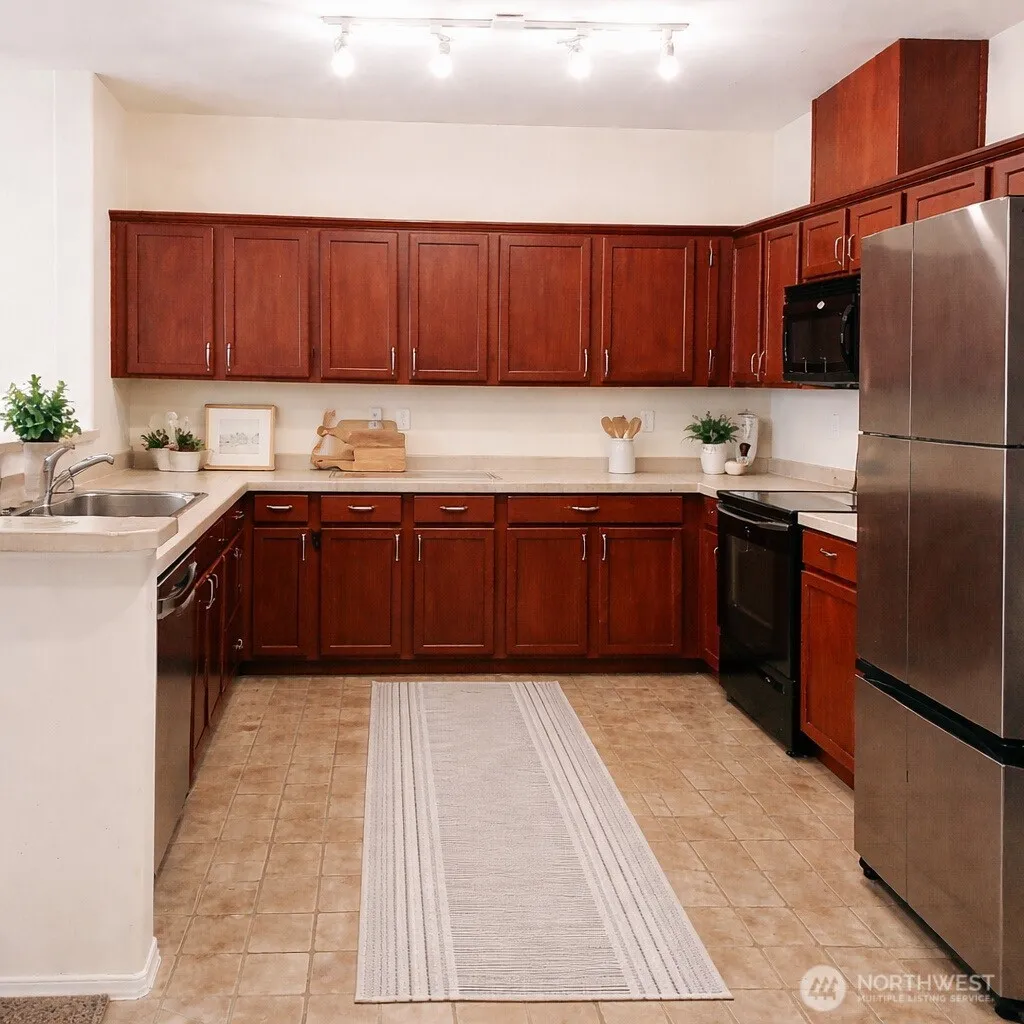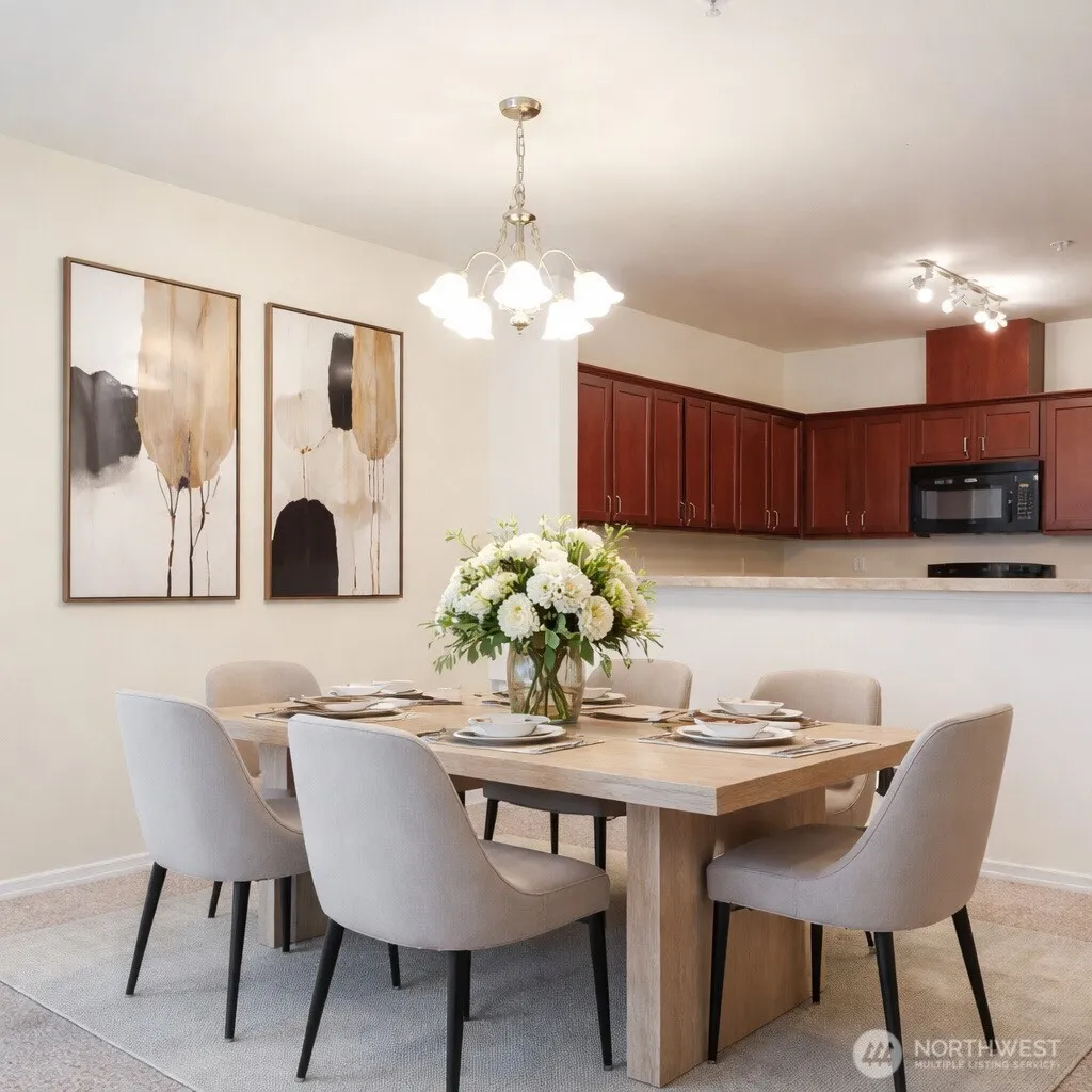Welcome to this bright, spacious top-floor 2-bed end unit with sunny exposure! Fresh paint and a large primary suite with California Closet system. Open living and dining areas feature a cozy fireplace and access to a private deck from both the living room and bedroom, offering treetop and sunset views. Generous kitchen with ample cabinetry, tile counters, and a breakfast bar. Stainless steel fridge and full-size washer/dryer included. Detached one-car garage. Access to clubhouse with 24-hour fitness center. Low HOA, minutes to Mill Creek Town Center and I-5.