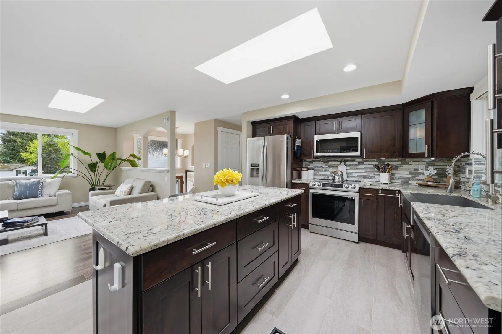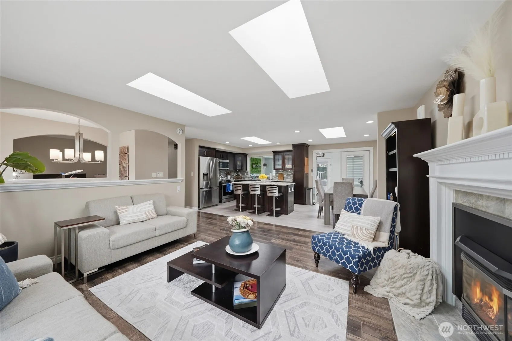 Stunning, like-new split-level home tucked into a quiet cul-de-sac just off Seattle Hill, set on a serene, park-like lot with abundant parking, including RV space and a dedicated shop area. Ideally located near schools, parks, and shopping, this fully renovated home blends timeless charm with modern elegance throughout. The beautifully updated kitchen featuring shaker-style cabinetry, granite countertops, a large center island, premium hardware, and high-end stainless-steel appliances flows seamlessly on hardwood and tile floors into the dining area and inviting living room with a fireplace featuring a tile surround and mantle, plus oversized windows that flood the space with natural light. A sunroom with a built-in BBQ and outdoor kitchen, with French doors leading out to the pool, creates the perfect setting for year-round entertaining. The spacious Primary Suite offers a luxurious en-suite bath, oversized walk-in closet, and private balcony overlooking the backyard and pool. Upstairs also includes three additional bedrooms, a versatile den or office, and an updated full bath. The lower level features a rec room with fireplace, full bath, laundry room, and a fifth bedroom with separate entry, ideal for guests or multi-generational living. Outside, enjoy a landscaped yard, heated pool, turf area, fire pit, and elevated view deck. Finished 2-car garage plus shop. Located minutes from Mill Creek and Snohomish with easy access to Hwy 9 and I-405 and Boeing.