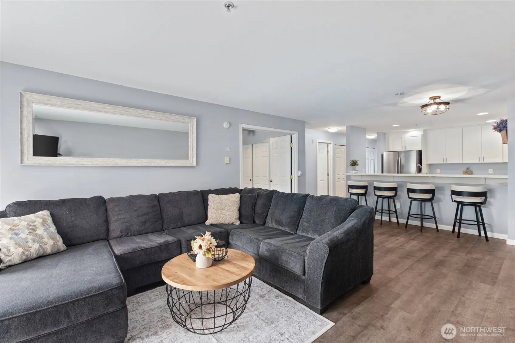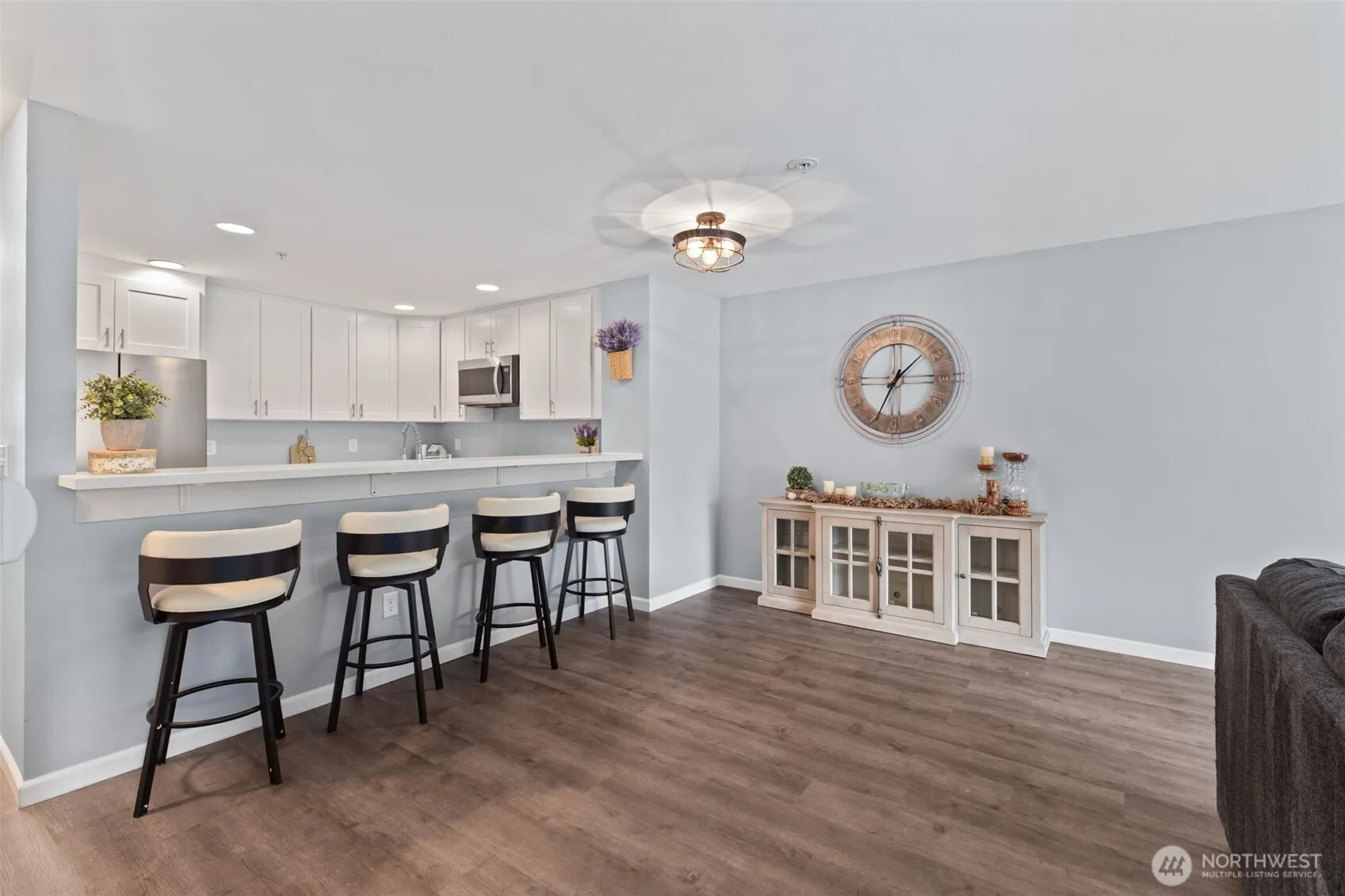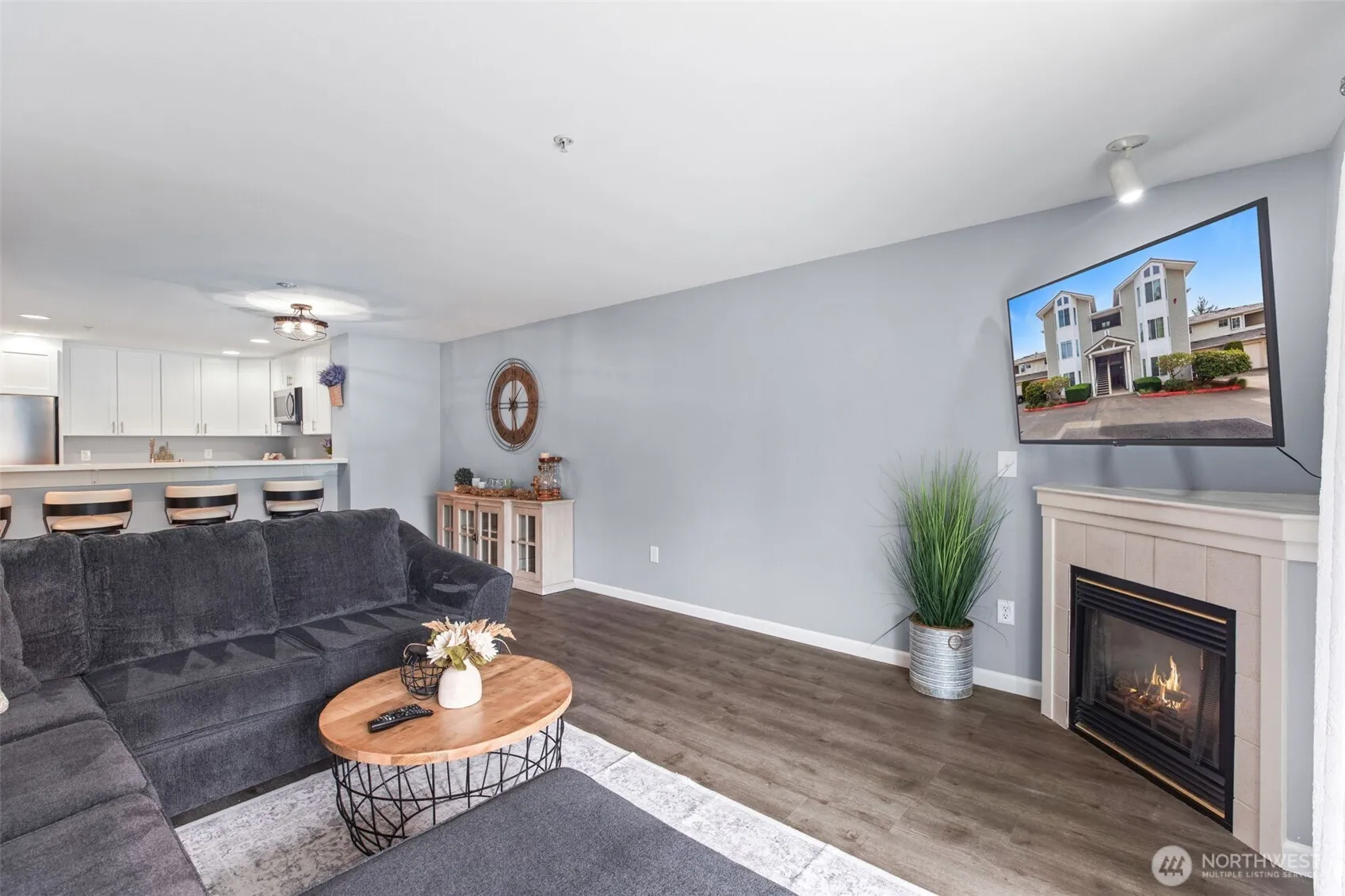 Beautifully renovated 2 bedroom Shoreside Condominium with a spacious floor plan and abundant natural light! Home offers new luxury vinyl plank flooring throughout, an inviting bright kitchen with quartz countertops, stainless steel sink and appliances, new cabinets to the ceiling, and roomy eat-in bar. Large bedrooms, including a premier primary suite with walk-in closet, bay windows, sliding barn door entrance, and newly appointed bath, including vanity, counter, hardware and lights! Nicely painted throughout. Dining space effortlessly blends with the living room with an easy step out to an expansive deck. Cozy up to the fireplace, entertain or relax on your large private deck. Enjoy a walk to Silver Lake or the many shops and restaurants nearby. With water and sewer included in the HOA dues, 2 parking spots and easy access to amenities, I-5 and Boeing, this turn-key gem is ready for its new owner! Pet friendly, NO rental cap, and VA approved!