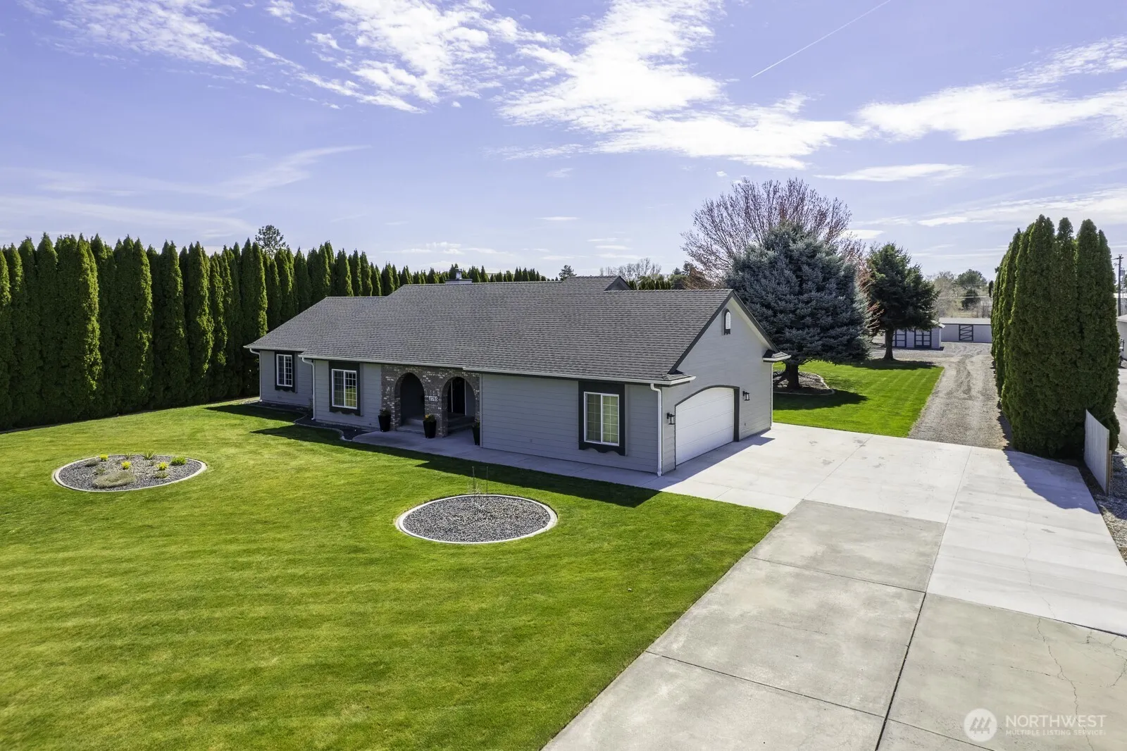 Welcome to this beautifully updated 3-bedroom, 2-bath rambler style home nestled in a highly sought-after neighborhood. Situated on 1 full acre, this property offers the perfect blend of space, comfort, and modern upgrades. Step inside to find fresh interior and exterior paint, creating a clean and inviting atmosphere throughout. The home also features a new roof, water softner, and complete HVAC system, giving you peace of mind for years to come. The spacious primary suite is a true retreat, complete with a large bedroom, an en-suite bathroom, and dual walk-in closets for ample storage. Two additional bedrooms provide flexibility for guests. Large open kitchen / dining room combo with bar seating. Don’t forget the home office space ready for your home business or remote career. Outside, enjoy the covered back patio, ideal for entertaining or relaxing year-round with hot tub hookups already in place for your future spa oasis. The property also includes a 2-car garage, several storage sheds, and plenty of room for future shop, garden, or simply enjoy the open space that comes with owning a full acre. This move-in-ready home combines modern updates with generous outdoor living in a desirable location. Don’t miss your chance to make it yours!