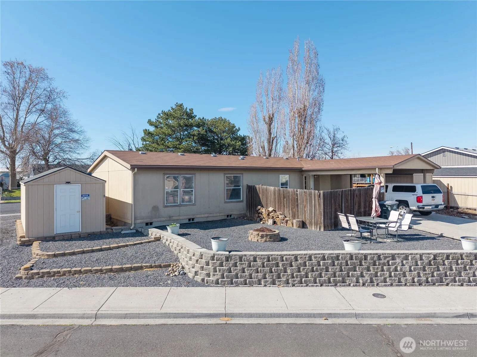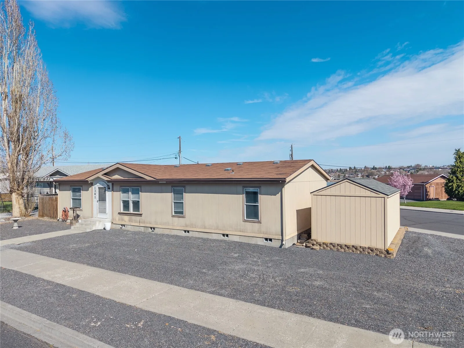 Tucked onto a quiet corner lot on Moses Lake’s sought-after Guffin-Eccles, this 3-bedroom, 2-bath home pairs a fresh, modern feel with an unbeatable location. Steps from the water and walkable to downtown shops, with Moses Lake High and Frontier Middle in-district. Inside, luxury vinyl plank flooring and fresh paint run throughout an open, light-filled floor plan. The spacious living room flows into a dining area and open kitchen featuring a center island, breakfast bar, abundant cabinetry, and vaulted ceilings that keep things bright and airy. Thoughtfully split for privacy, the primary suite offers a walk-in closet and spa-style en-suite with dual vanities and a soaking tub. Two additional bedrooms and a full bath sit on the opposite side – ideal for guests, a home office, or hobbies. A dedicated laundry room with modern washer and dryer, freezer, and extra storage adds everyday ease. Outside, enjoy a partially fenced area perfect for a hot tub, decorative pavers framing a welcoming gravel patio for evening gatherings, peek-a-boo lake views, and two storage sheds. This manufactured home is on a sturdy concrete block foundation. A covered carport plus ample off-street parking complete the package. Central A/C, electric forced-air heat, updated flooring, and fresh paint – all at an approachable price point. Schedule your showing today.