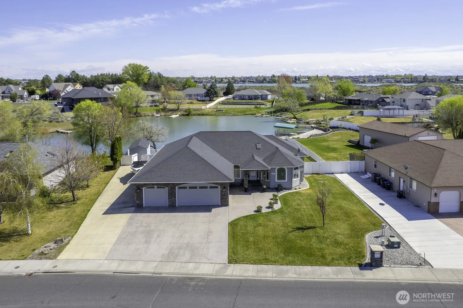 Welcome to Westlake Shores! This beautifully appointed 4 bed, 2.75 bath rambler offers over 130’ of low-bank waterfront, ideal for kayaking, canoeing & paddle boarding. Enjoy easy boat access to the main body of Moses Lake for jet skiing, water skiing & fishing from your private dock w/boat lift. Quality built with formal entry & covered front porch, this spacious home features beautiful hardwood floors, an inviting living room w/fireplace, and a gourmet kitchen with stainless steel appliances. Spacious primary suite offers a walk-in closet, dual sinks, tiled walk-in shower, and jetted tub. Thoughtful single-level layout provides comfortable living and great flow for entertaining. Enjoy the fenced backyard w/patio, plus neighborhood community park. Oversized 3-car garage and additional boat/RV parking complete this exceptional waterfront property.