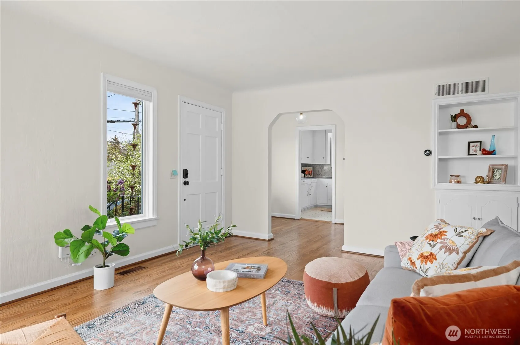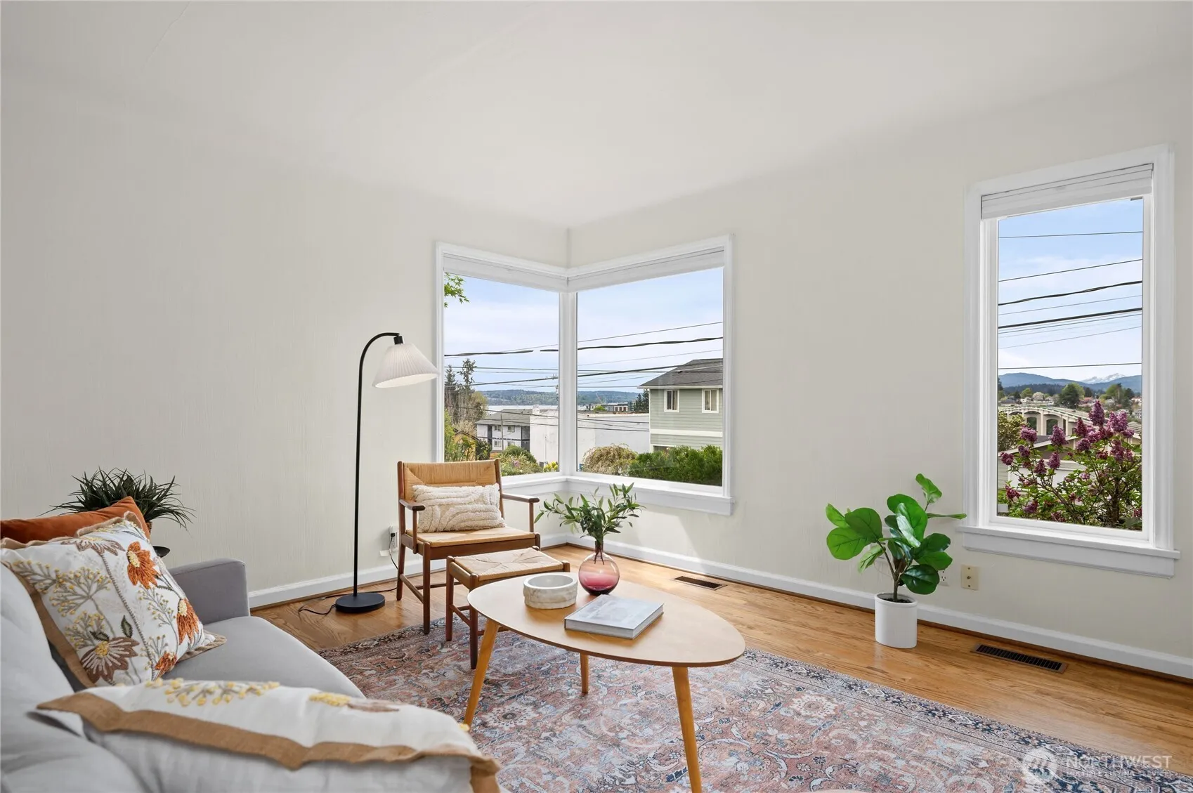 Charming Manette bungalow in a prime location, just a short stroll to neighborhood shops and restaurants. Enjoy views of the Manette bridge Puget Sound, the Olympic Mountain peaks, and the ferry. Southwest exposure beams in natural light to your main living spaces. This comfortable home features beautiful hardwood floors, coved ceilings, plaster walls, and classic built-ins; the cheerful kitchen includes appliances, and a mudroom/laundry provides extra storage. Outdoors, mature plantings and fruit trees create a gardener’s retreat, with a private, fenced backyard perfect for relaxing or entertaining. Detached one-car garage plus off-street parking. Truly a darling retreat in a neighborhood with a strong community vibe.