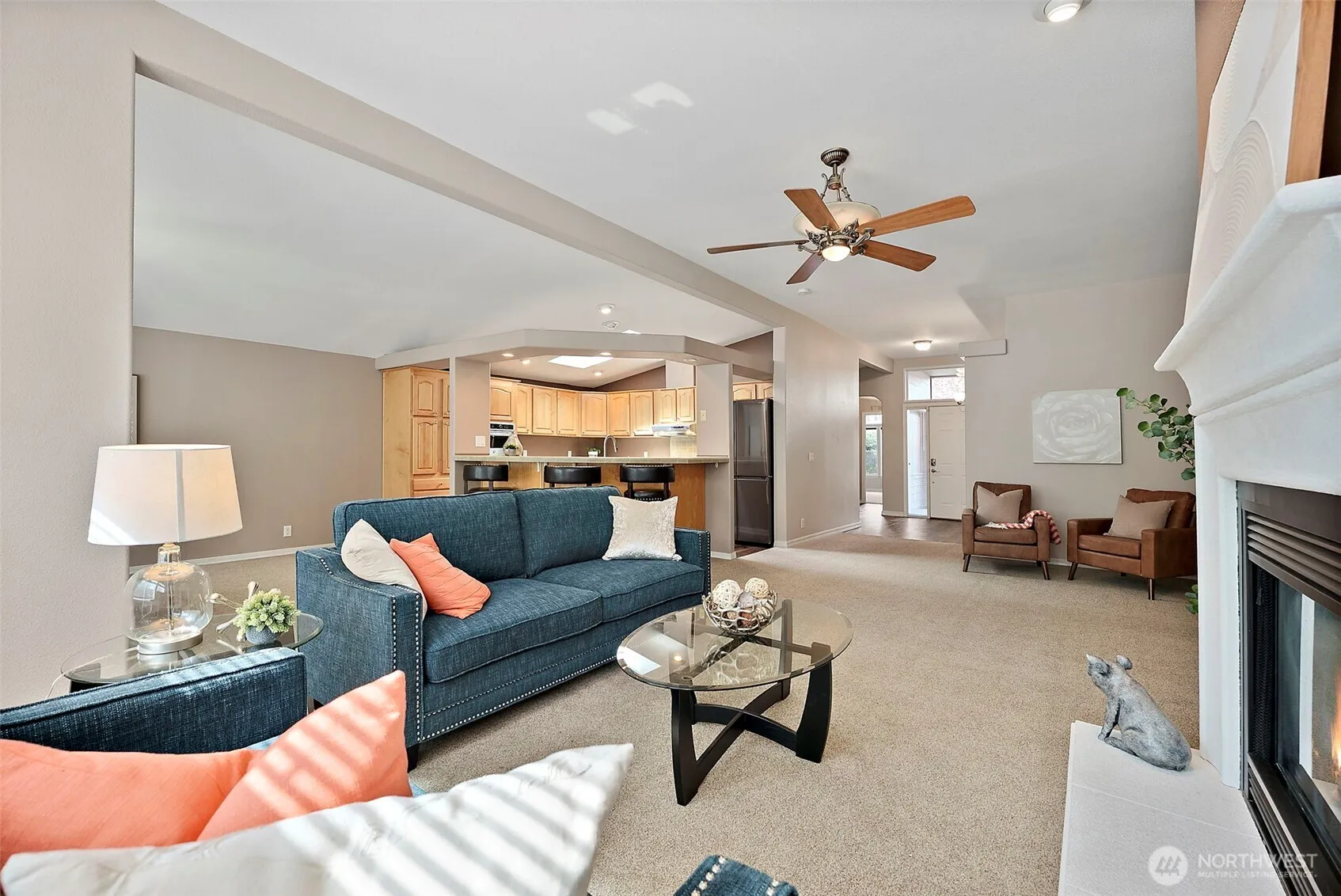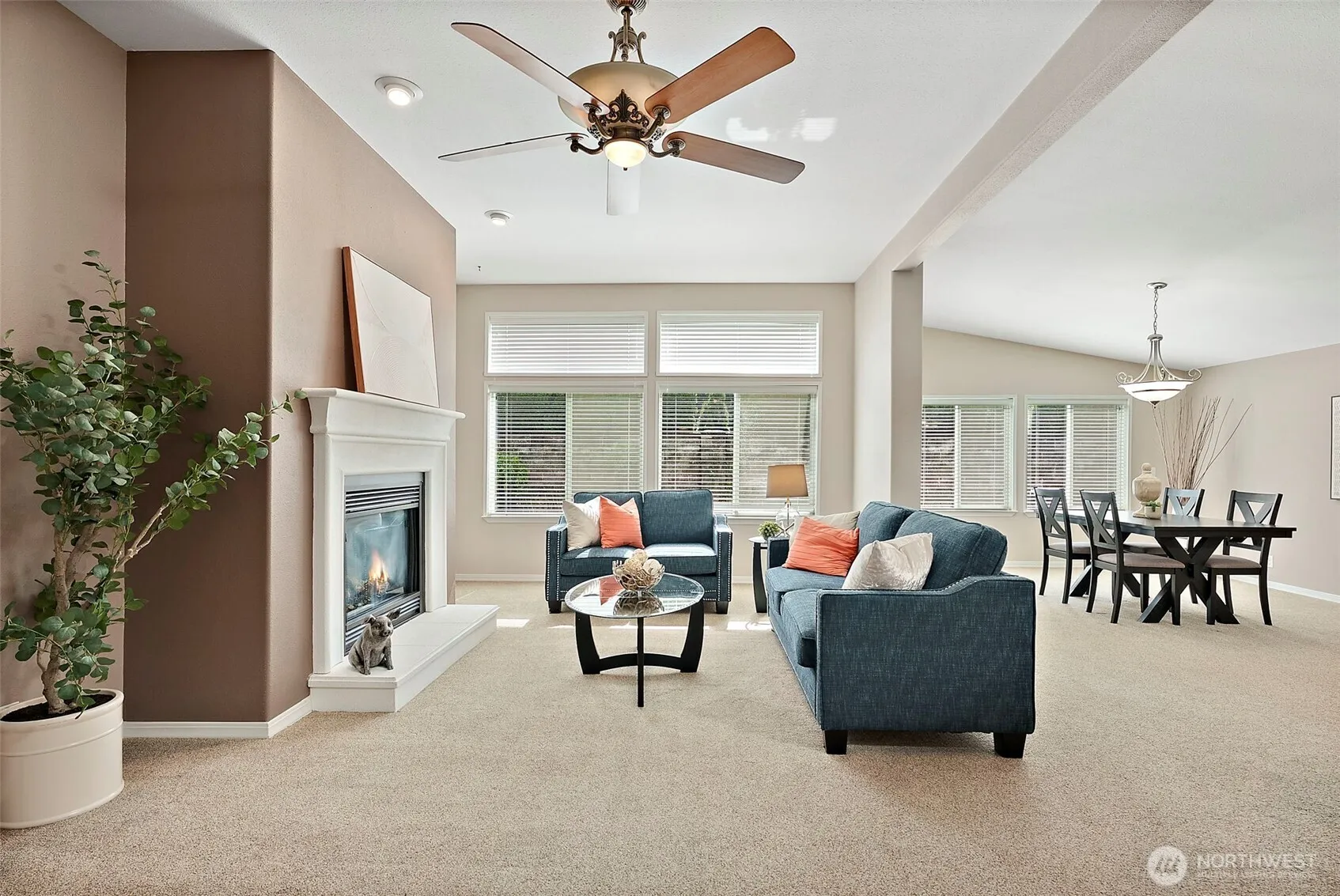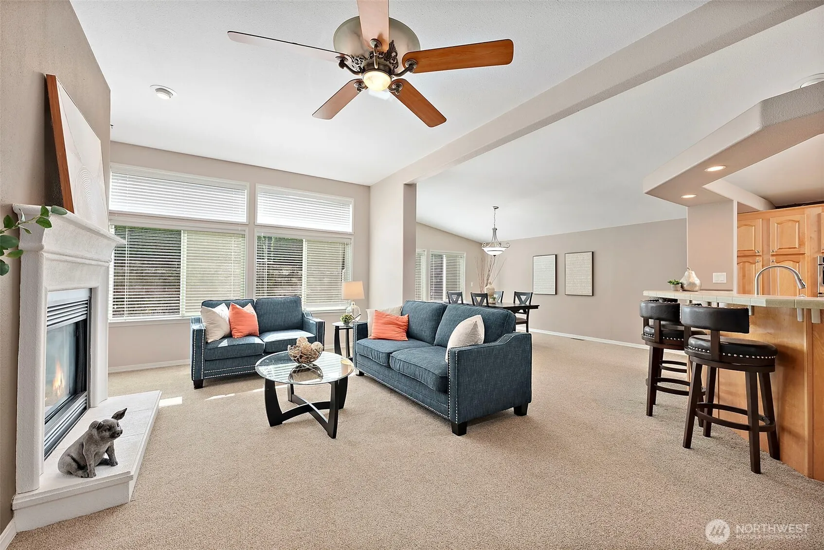 Step into refined comfort in this beautifully updated 55+ home in the gated Water Gardens community. Featuring luxury vinyl plank flooring, newer plush carpet, and a striking gas fireplace, this residence offers both style and warmth. The single-level layout includes 3 bedrooms and 2 full baths across 1,763 sq ft. The kitchen is equipped with stainless steel appliances and granite countertops, while three skylights bathe the home in natural light. Recent upgrades include a newer roof, furnace, and A/C (2018). A spacious 2-car garage offers pull-down storage and a dedicated work area. The primary suite features dual sinks, a soaking tub, and walk-in shower. Enjoy low-maintenance AstroTurf in front and a private backyard, all within a vibrant community featuring scenic grounds, waterfalls, and an active lifestyle.