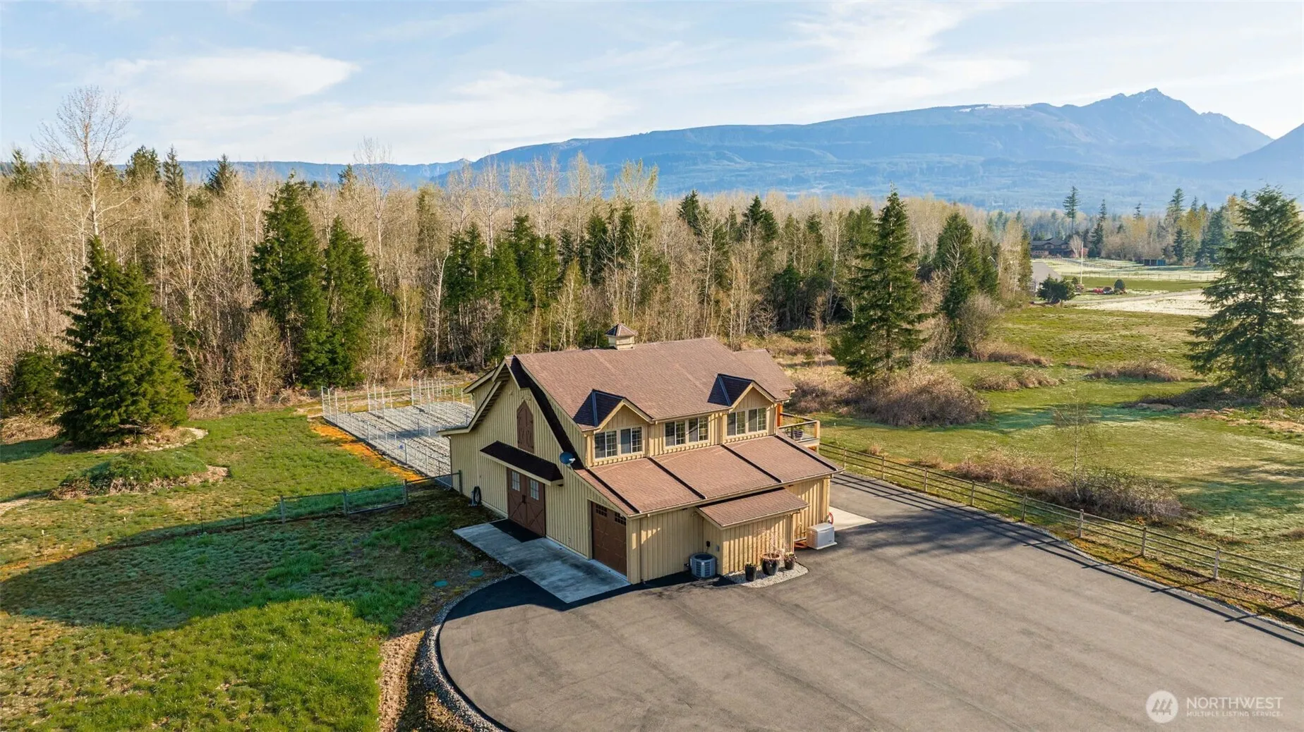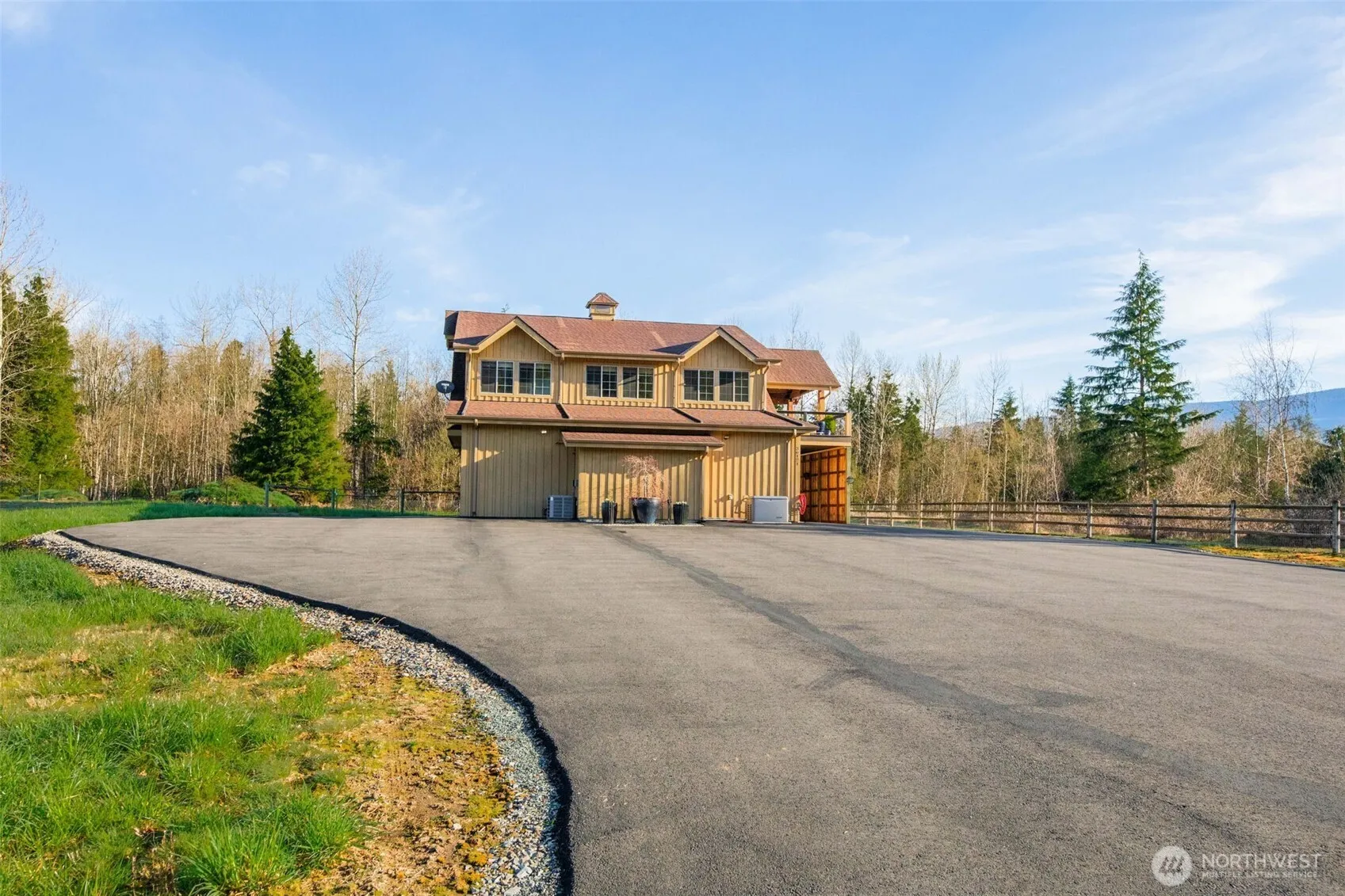 Impeccably maintained Barn Pros Barndominium on lush 10 acres with incredible Cascade Mountain views. The home incorporates a luxury living area with high-end finishes over a pristine 3-stall barn. Thoughtfully designed with horse and human in mind, every room provides a pleasing vista with the ability to monitor your horses from almost anywhere in the home. Elegance meets function with gorgeous quartz counters in the kitchen and bathrooms, high-end appliances, beautiful chrome fixtures, and no worry LVP flooring. The covered all-weather deck is plumbed with propane for BBQ and fire-pit; great for enjoying the view in all weather conditions. Center aisle barn area features heated tack room, hot/cold horse spa wash rack, fly spray system, heated waterers, 3 12×12’ stalls with 96’ gravel runs attached. Ample covered parking with a drive-through tandem 2-car garage, an attached carport, plus a detached covered trailer/RV parking structure measuring 42’ long x 12’ wide x 14’ high with both 30amp and 50amp plugs. The property features a private electronic security gate that leads to a gently curving paved driveway, ensuring privacy from the street. Near the home, a spacious turnaround provides added convenience. To complete this idyllic country retreat, you’ll find a fenced garden area with steel trough raised beds. Located in the gated equestrian community of Sky River Estates, comprised of 10-acre+ horse-friendly properties with nearby trails just down the road.
