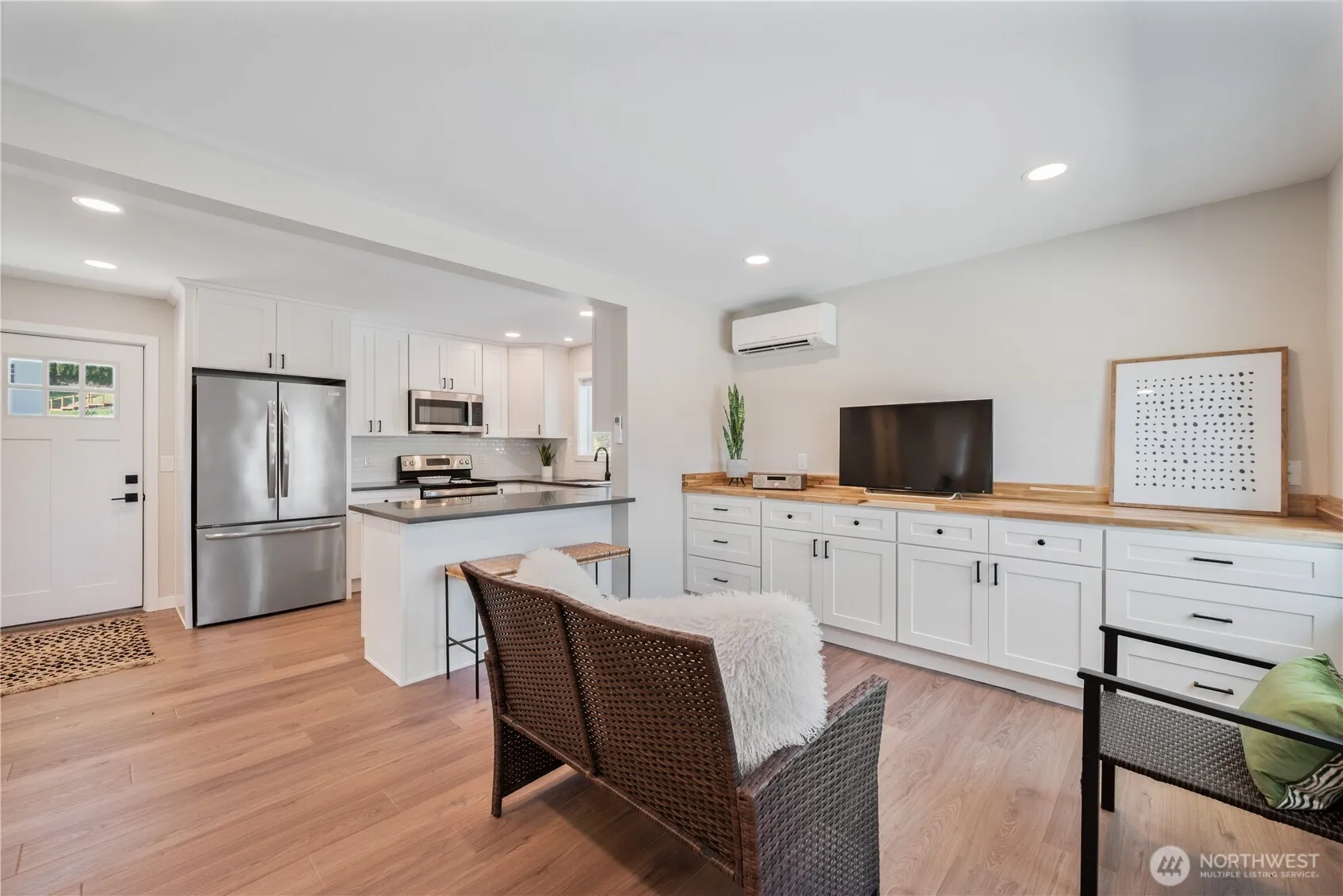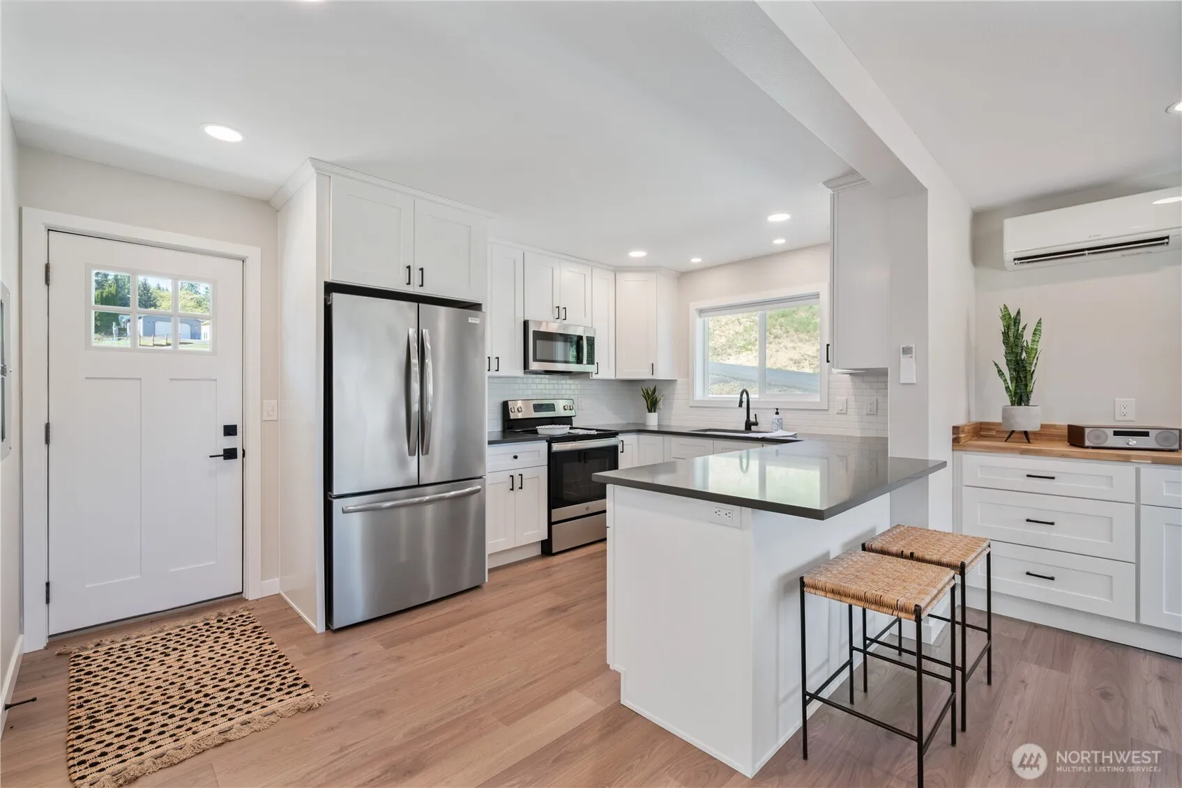 Stylish and elegant contemporary turn key home now available. This delightful two bedroom one bath home embraces easy living…. Beautiful upgrades include new kitchen featuring tile backsplash and quartz countertops. All appliances include. Gorgeous tile bathroom with built-in shelving and tile surround. The larger of the two bedrooms features a walk-in closet. Beautiful LVP flooring throughout. Keep cool in the summer and warm in the winter with ductless mini split. Outside features include patio perfect for outdoor entertaining. Brand new septic system. Oversized lot. Outdoor storage shed. Quiet private road. Make your appointment today to see this adorable home!
