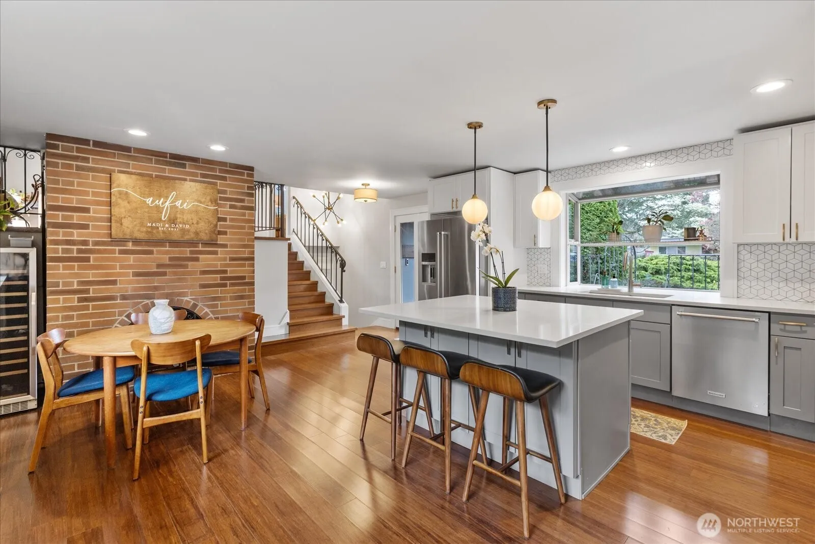 Set in a highly desirable Westgate location just minutes from Edmonds, this beautifully updated tri-level home offers both convenience and style with easy access to major thoroughfares. The thoughtfully designed kitchen features a spacious island with seating, abundant storage, and opens seamlessly to the dining area complete with a cozy fireplace and built-in wine fridge—perfect for entertaining. Expansive windows throughout invite natural light and create a seamless connection to the outdoors. Just off the kitchen, the inviting family room provides direct access to a private, fully fenced backyard with a patio and a versatile finished outbuilding—ideal for a home office, studio, or fitness space. This level also includes a half bath, laundry area, and access to the oversized two-car garage. Upstairs, a warm and welcoming living room with a wood-burning fireplace opens to a deck, offering a perfect space to relax. The primary suite serves as a luxurious retreat, featuring an oversized walk-in shower and heated floors. The lower level includes two additional bedrooms, a full bath, and a flexible adjoining space well-suited for a study area, playroom, or creative nook. Located just one block from Westgate Elementary, and with easy access to downtown Edmonds’ dining, shopping, galleries, beaches, train station, and ferry, this home truly combines comfort, functionality, and an exceptional location.