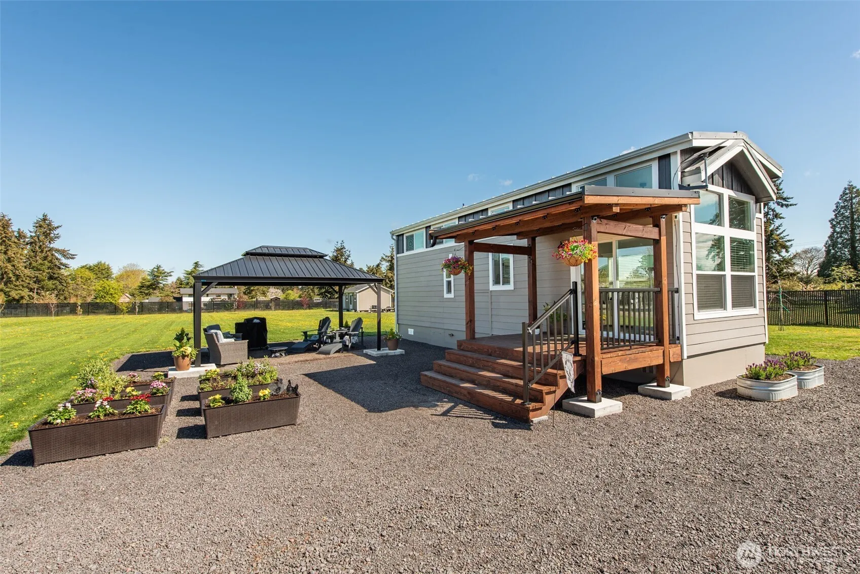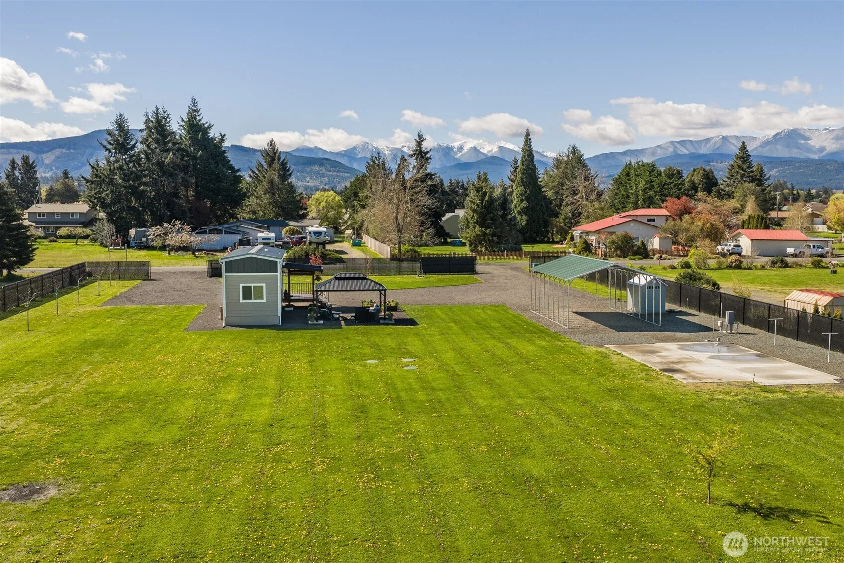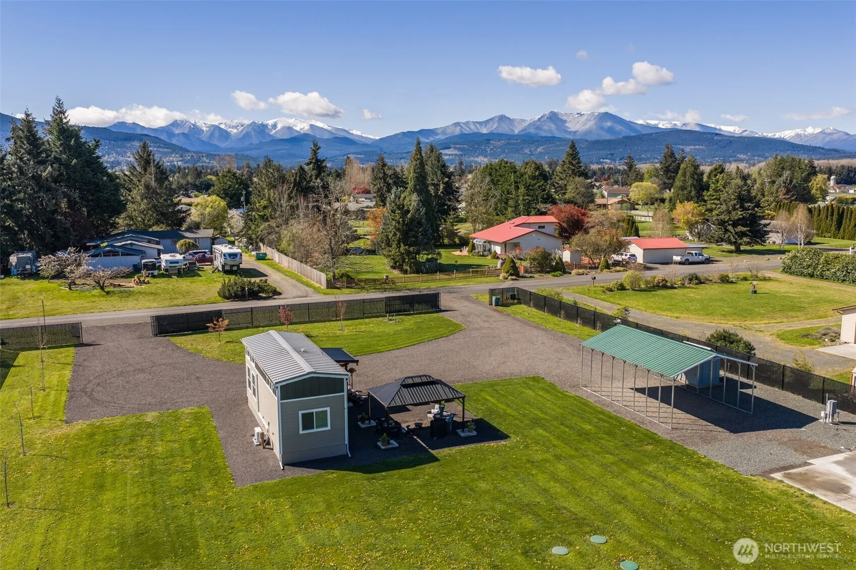 Olympic Peninsula sanctuary in the coveted rain shadow of Sequim! This exceptional property offers views of the majestic Olympic Mountains, setting the scene for your idyllic lifestyle. The heart of this retreat is a sleek, fully permitted park model/tiny home, complete with a custom-built covered deck. It’s perfect for year-round living as is, providing immediate comfort and a turn-key solution. The property’s incredible development potential is supported by a pre-installed 3-bedroom septic system, which is ready for the construction of your future dream house. Imagine keeping the tiny home as premium guest quarters or dedicated bonus living space, offering flexibility or rental income. Functionality is key; fully fenced perimeter, a circular driveway accessed by two secure gates, 400 amp power, and being wired for a generator. For RV amenities, a dedicated 24×32 concrete pad and 20×30 metal carport are equipped with full hookups, including 50 amp and 30 amp electric, water, propane, RV dump, plus EV charging. Storage and workspace are abundant with multiple outbuildings, including a large high-quality, stick-built 424 sq ft shop/storage shed. The grounds are a gardener’s delight with beautifully established landscaping, featuring raised beds, over 30 fragrant lavender plants, and over 20 fruit and flowering trees. Enjoy outdoor entertaining on the dedicated patio with a gazebo and firepit. You are moments from the renowned Olympic Discovery Trail and ALL Sequim amenities!