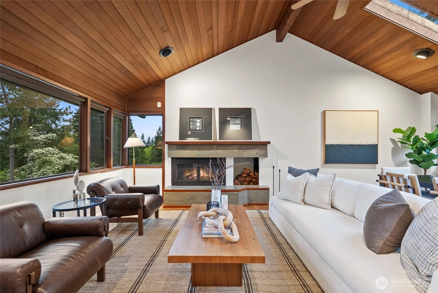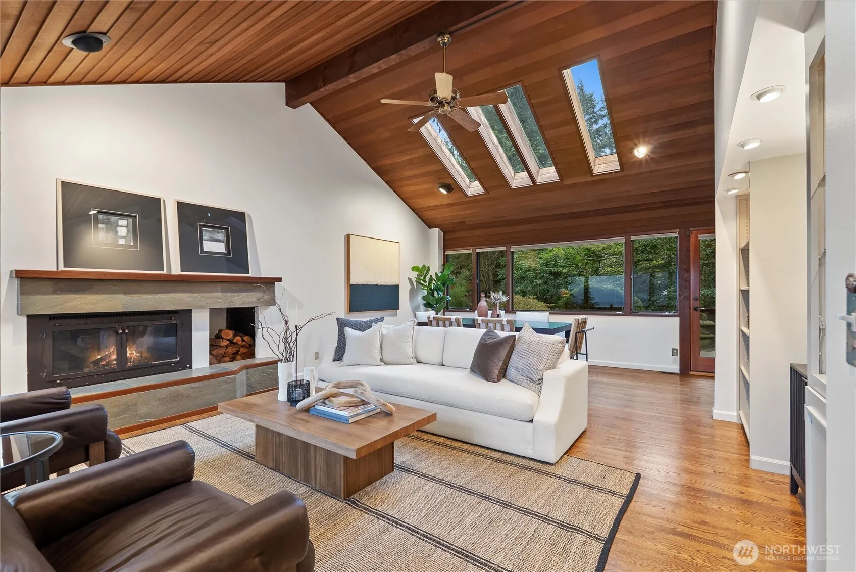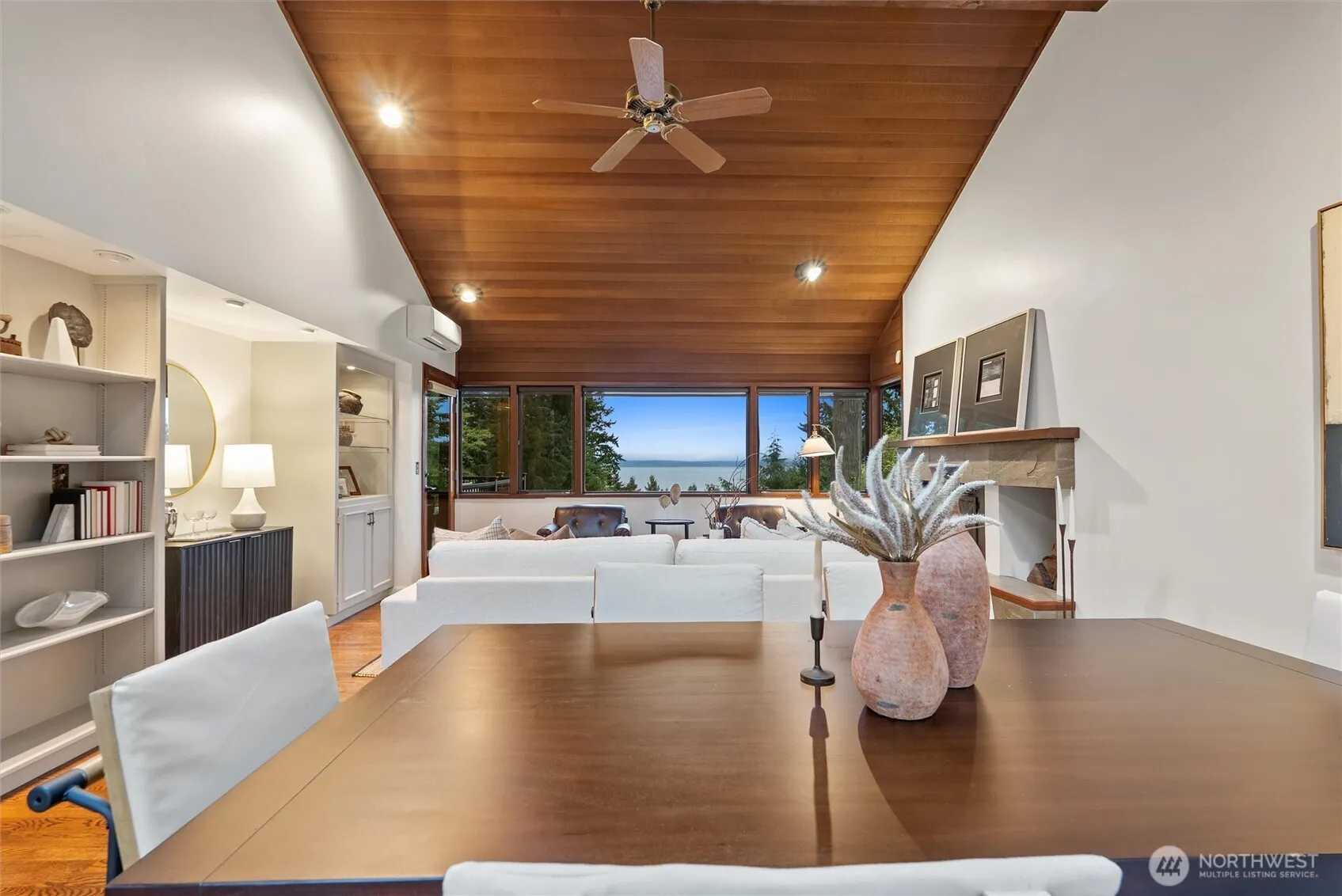 Enjoy privacy and Puget Sound views from every living space of this handsome home in the trees. A natural setting and quiet neighborhood provides the backdrop for connection to the outdoors and thoughtfully designed Northwest mid-century architecture. Vaulted, wood-lined ceilings and exposed beams & trim, built-ins, hardwood floors and brick accents are all featured prominently, adding character and warmth. Floor to ceiling windows and skylights complement with ample natural light. Updates include efficient kitchen with granite counters, Stainless Steel appliances and gas cooking; expanded primary ensuite; and fresh interior paint. Functional, flexible floorplan with separate entrances on main and lower levels. Bonus eagles nest loft offers an idyllic getaway space or 4th BR/den/office. Generous deck overlooks both territorial and water views; charming patio is wrapped in mature landscaping and backyard birdsongs. Three fireplaces for cozy options everywhere. Split A/C system and back-up generator provide for comfort year-round and peace of mind. Hot tub-ready pad + electrical. Home sits atop a private driveway, with ample turnaround and extra dedicated parking areas. Wine cellar and heated shop/studio complete the ambiance of peaceful living. Top-rated Edmonds school district. Downtown Edmonds, Perrinville shops, Meadowdale Community Center, Beach Park & Playfields all nearby. Easy commute to Boeing, I5/405/99. Lynnwood light rail station apprx 4 miles away.
