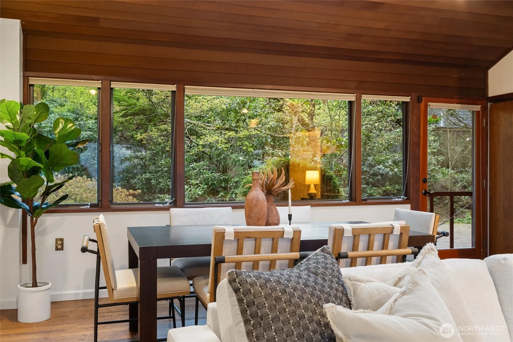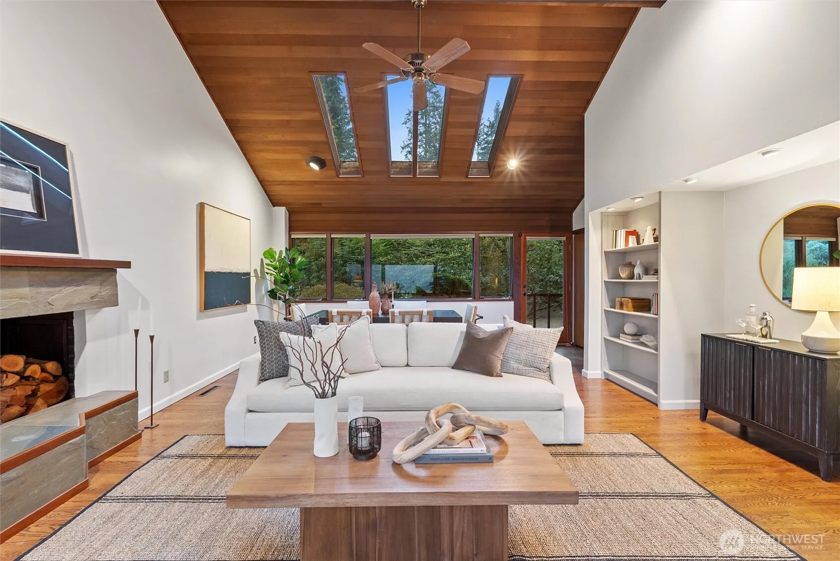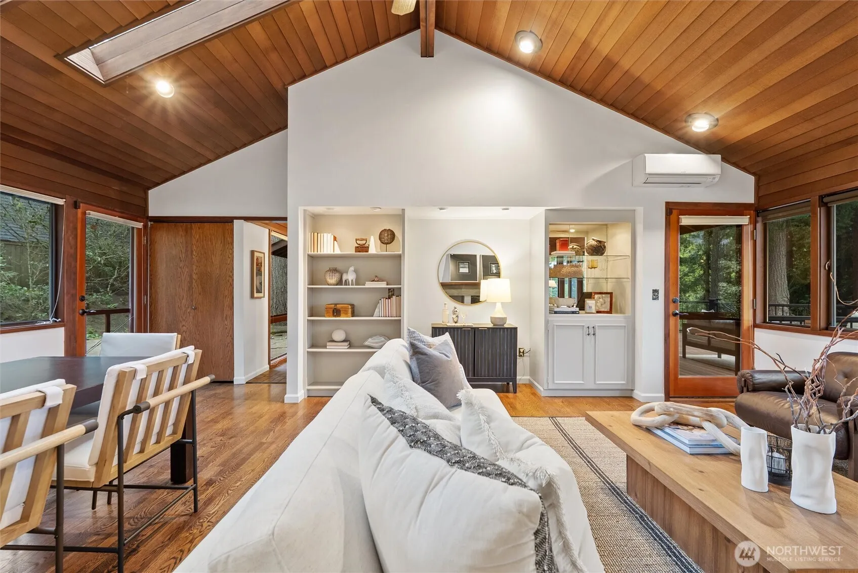 Enjoy privacy and Puget Sound views from every living space of this handsome home in the trees. A natural setting and quiet neighborhood provides the backdrop for connection to the outdoors and thoughtfully designed Northwest mid-century architecture. Vaulted, wood-lined ceilings and exposed beams & trim, built-ins, hardwood floors and brick accents are all featured prominently, adding character and warmth. Floor to ceiling windows and skylights complement with ample natural light. Updates include efficient kitchen with granite counters, Stainless Steel appliances and gas cooking; expanded primary ensuite; and fresh interior paint. Functional, flexible floorplan with separate entrances on main and lower levels. Bonus eagles nest loft offers an idyllic getaway space or 4th BR/den/office. Generous deck overlooks both territorial and water views; charming patio is wrapped in mature landscaping and backyard birdsongs. Three fireplaces for cozy options everywhere. Split A/C system and back-up generator provide for comfort year-round and peace of mind. Hot tub-ready pad + electrical. Home sits atop a private driveway, with ample turnaround and extra dedicated parking areas. Wine cellar and heated shop/studio complete the ambiance of peaceful living. Top-rated Edmonds school district. Downtown Edmonds, Perrinville shops, Meadowdale Community Center, Beach Park & Playfields all nearby. Easy commute to Boeing, I5/405/99. Lynnwood light rail station apprx 4 miles away.