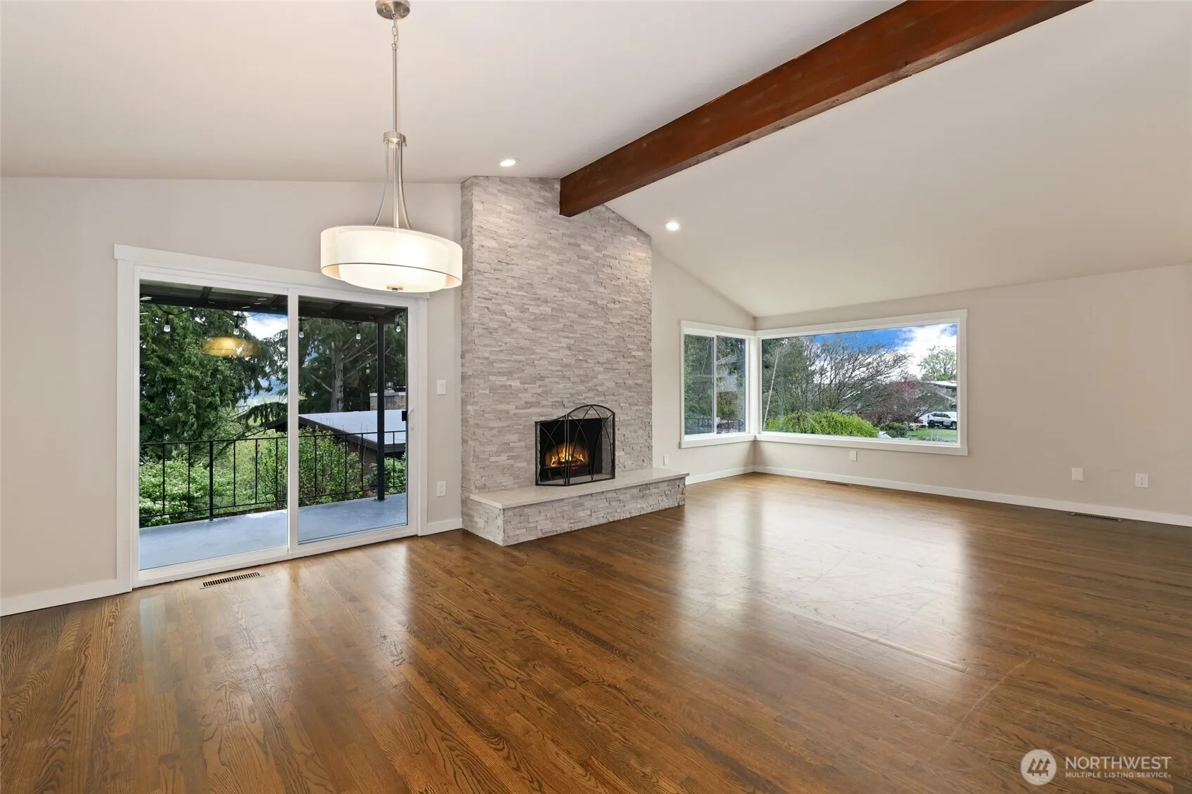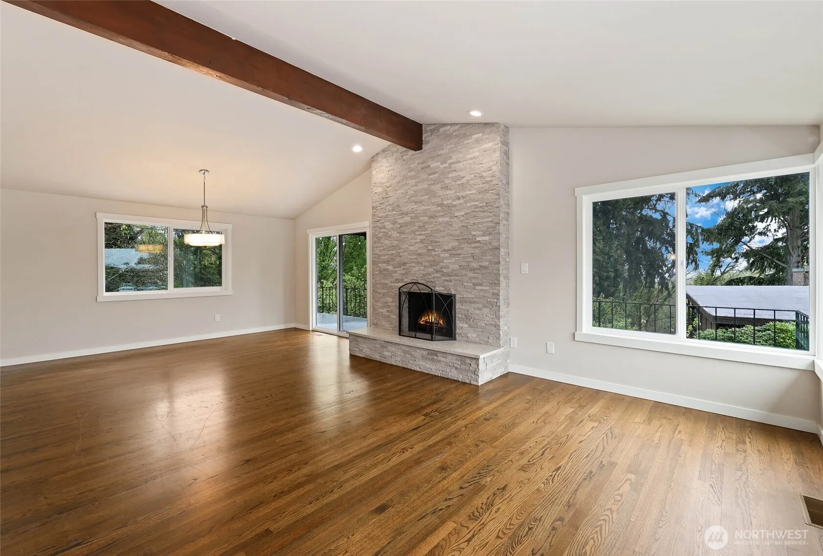 Timeless mid-century style, thoughtfully refreshed for modern living, awaits in this beautifully updated Tukwila retreat. A striking double-door entry with custom iron railings welcomes you into a light-filled great room where vaulted beamed ceilings soar above gleaming hardwoods and a floor-to-ceiling stacked-stone fireplace. The open-concept layout flows into a stunning remodeled kitchen with quartz counters, white shaker cabinetry, designer tile backsplash, and full stainless appliances. Oversized windows frame lush greenbelt views. Downstairs, a spacious second living room is a perfect retreat for movie nights, or guest space. Step outside for true Pacific Northwest indoor-outdoor living: relax on the upper deck with built-in outdoor fireplace, gather on the covered patio below, and explore a fully fenced backyard transformed into an edible garden oasis — mature fruit trees, fresh herbs, and even green tea plants invite year-round harvests. Unwind after a long day in your own private sauna — a rare and luxurious bonus. Off the attached two-car garage — with a brand-new garage door — discover a massive storage/utility room that doubles as an incredible hobby or workshop space. Energy-efficient solar panels help keep utility costs low year-round. Commuters will love the unbeatable location — minutes to Sea-Tac International Airport with quick access to I-5, I-405, and Hwy 518, plus nearby light rail to downtown Seattle and Bellevue. Truly move-in ready!
