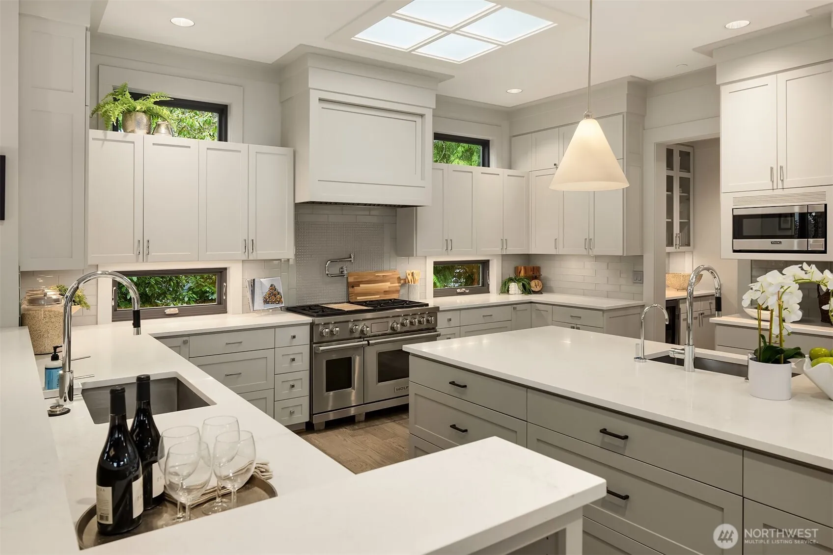 Overbrook North. This custom residence is a study in refined design—where soaring ceilings, skylights, and thoughtfully placed windows create interiors that are both luminous and private. A seamless integration of home and grounds offers a rare sense of privacy, achieved through intentional design. Set on a large, flat lot, bespoke gardens and hardscapes by Mark Garff showcase flagstone paths, curated plantings, and exceptional outdoor living. The chef’s kitchen is beautifully appointed with Wolf, Sub-Zero and Bosch appliances, dual sinks and dishwashers, an expansive island, butler’s pantry plus walk-in pantry. Walls of windows and an elegant flow connect to the family room, where custom built-ins, a fireplace, and NanaWall doors extend living to a covered, heated outdoor retreat with Wolf BBQ, integrated heaters, and built-in sound. Upstairs features four ensuite bedrooms, including a serene primary suite with lake glimpses, private deck, fireplace, and spa-inspired bath with heated floors. The lower level offers an incredible entertainment lounge, 2nd kitchen, 375 bottle wine cellar, and private guest suite with kitchenette. Loaded with so many extra features — new carpet, custom window coverings, built-in Sonos sound system, epoxy garage floors, and serviced HVAC….nothing to do except move in! Ideally located in the coveted Clyde Hill neighborhood near Bellevue, Seattle, and top-rated schools. This isn’t just a home—it’s a lifestyle.