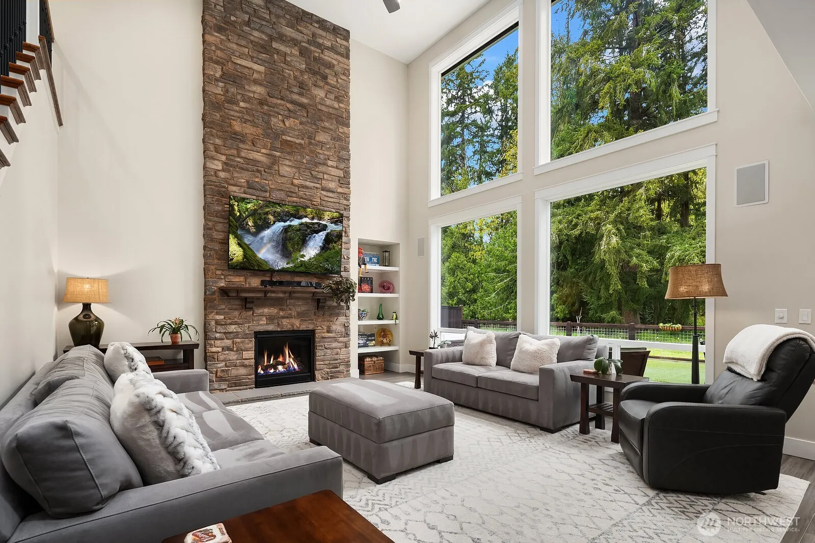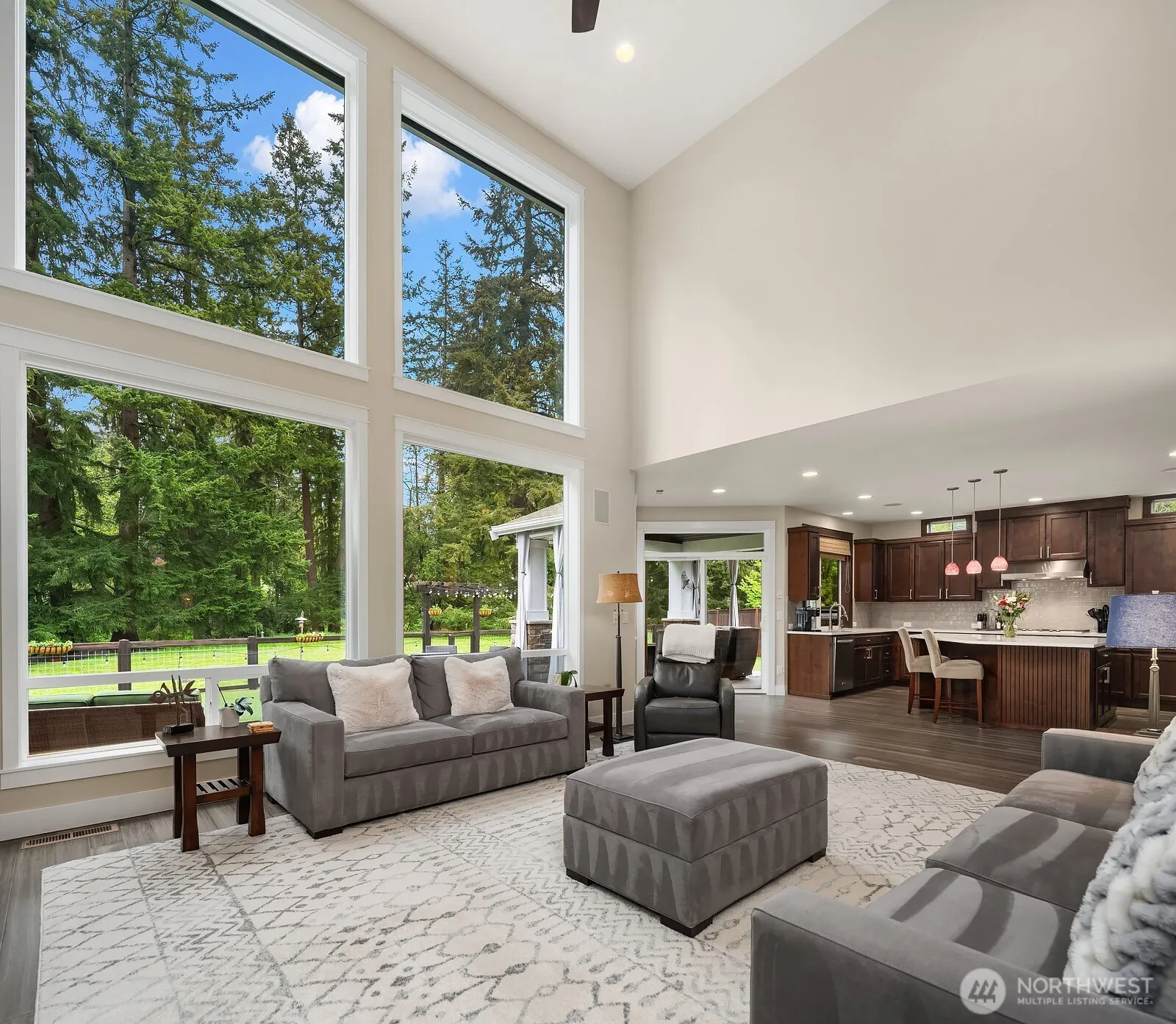 Impeccably maintained and thoughtfully designed, this is Pine Creek living at its finest. Murray Franklyn’s coveted Huntington plan delivers 5 beds, 4 baths, and 4,250 sqft of refined comfort. Inside, a two-story stone fireplace commands the great room beneath soaring vaulted ceilings. The gourmet kitchen features double ovens, quartz counters, custom tile backsplash, and a butler’s pantry. The breakfast nook opens to a covered patio with a full outdoor kitchen, heater, and sun shades. The formal dining room is perfectly suited for gatherings, while a sunlit office, private ensuite guest bedroom, and custom wine cellar with built-in racks round out the main floor. Upstairs, the expansive primary suite offers a spa-inspired 5-piece ensuite, custom closet system, and generous walk-in closet, joined by three additional bedrooms, a large bonus room, and utility room. Fresh interior paint, new bamboo flooring on the main level, and new carpet upstairs elevate the space throughout. The oversized 3-car garage offers built-in storage, and a whole-house generator provides peace of mind. Designed for effortless, year-round enjoyment, the level yard features premium artificial turf in both the patio and play areas, opening to a serene natural area with a maintained trail leading directly to the shores of Pine Lake. All within the award-winning Issaquah School District.