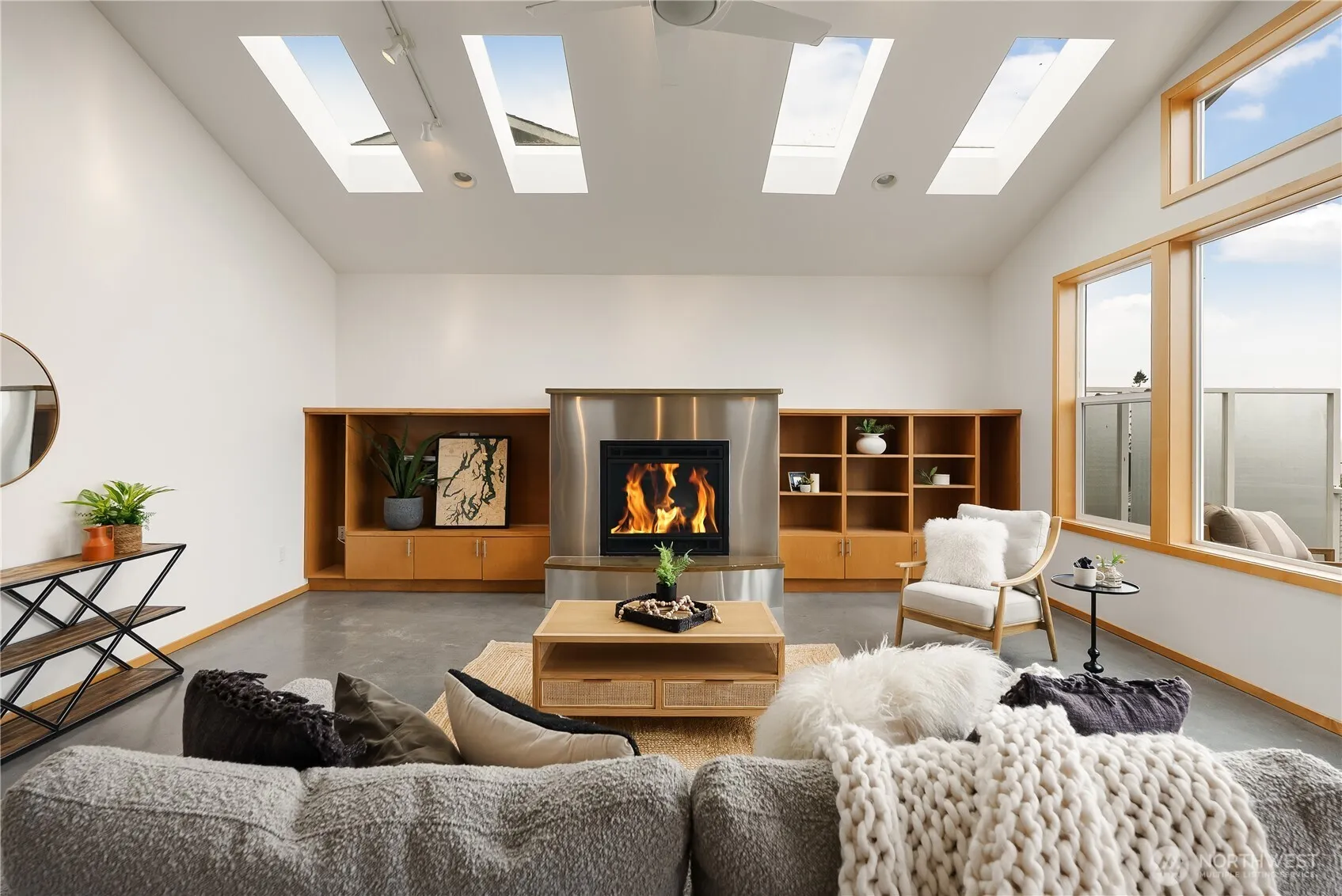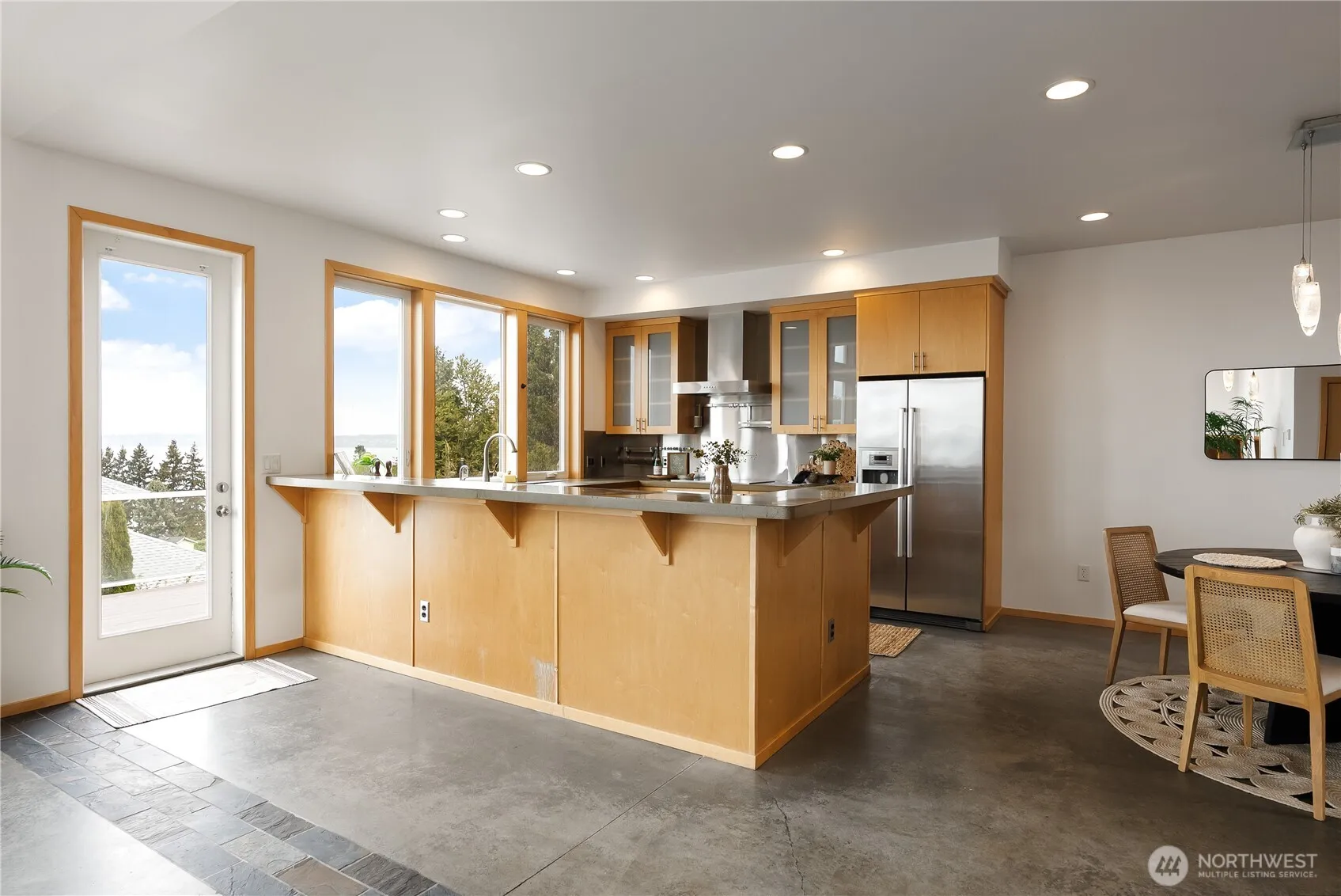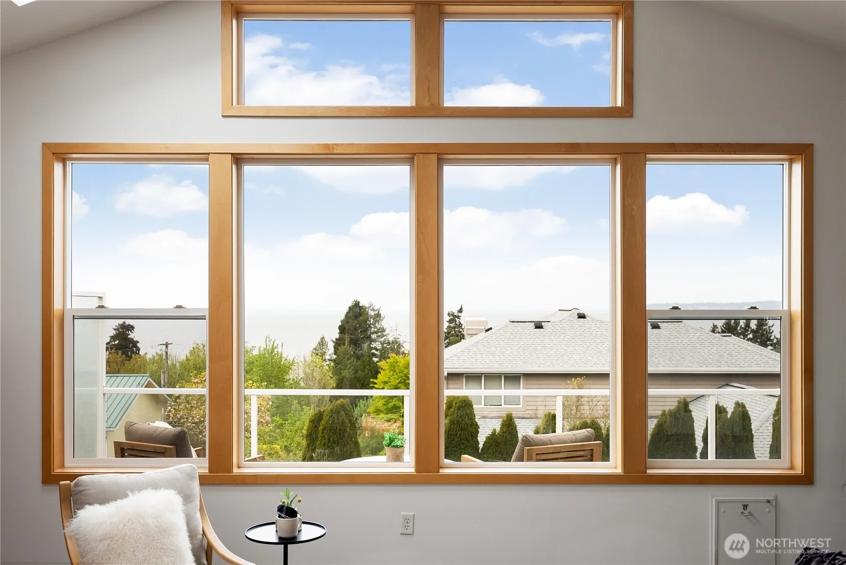 From the street, you wouldn’t expect what opens up inside. This two-story home with basement takes full advantage of its position with sweeping views of Semiahmoo Bay. The main level centers around a vaulted living area with a fireplace, large windows, and skylights that bring in natural light throughout the day, along with direct access to the wraparound deck, making it easy to take in the view from inside or out. Concrete floors and counters give the space a modern feel and a look that stands apart from more traditional homes, while radiant floor heating provides steady, comfortable warmth throughout. Upstairs, the primary suite is set up to capture even more of the view, with its own private deck, walk-in closet, and a five-piece bath with a soaking tub positioned to enjoy it. The basement includes a mix of finished and unfinished space, with the finished area working well for a rec room, game room, or home office. The home offers a great opportunity to bring your own updates and make it your own in a setting where the views do most of the work.