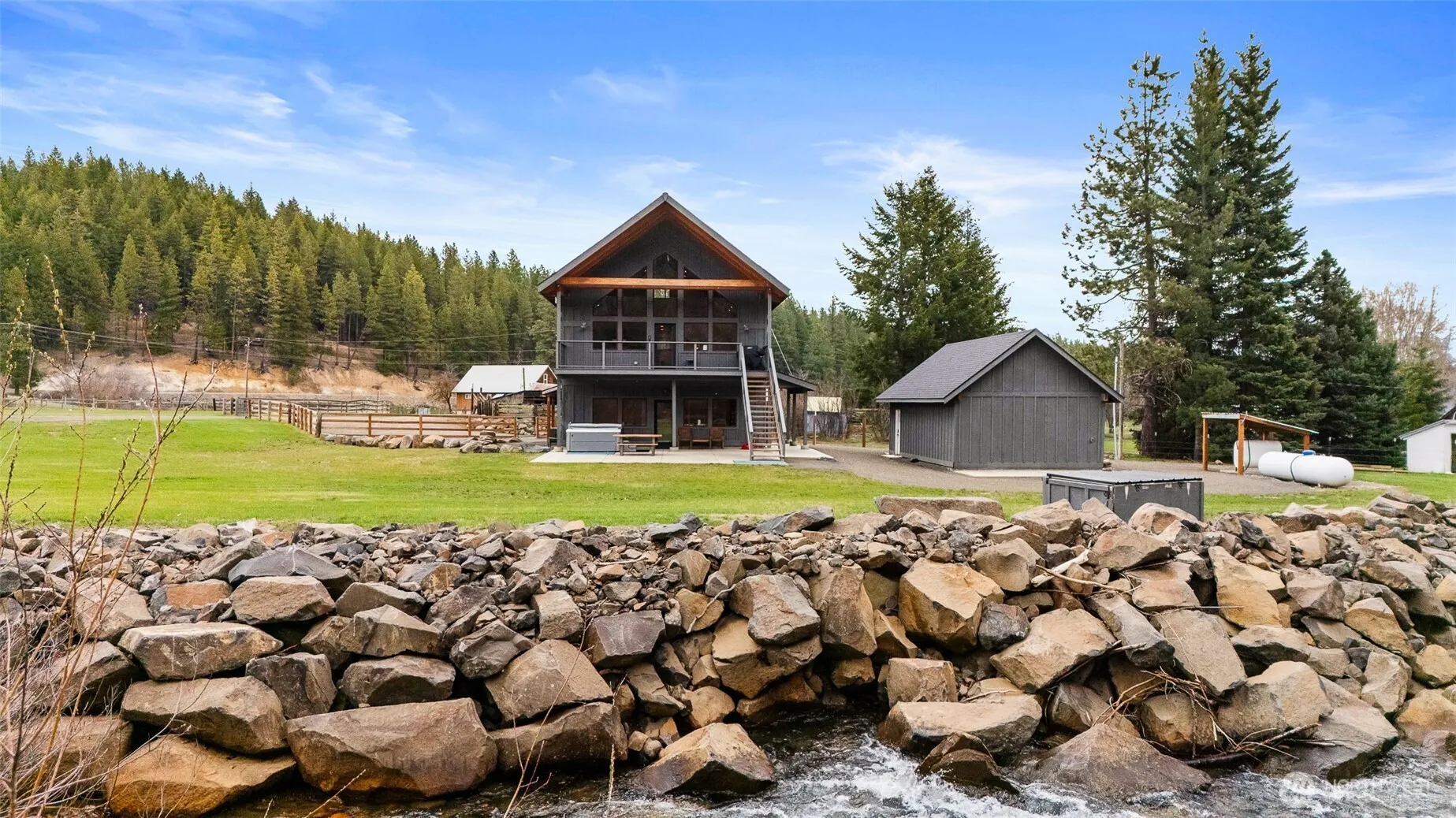 Welcome to the Teanaway Rivera retreat with 4 acres, 2 tax parcels, and approx. Aproximently 430 feet of Teanaway River frontage along sought after Teanaway Middle Fork Road. This rare property offers direct river access, privacy, and year round recreation in the heart of the Teanaway Valley. The move-in-ready home is positioned to capture river and territorial views, with large windows bringing in natural light and connecting indoor living to the surrounding landscape. Comfortable, functional layout designed for full time living or a vacation retreat. Property features include a 70×36 shop for storage, projects, or recreational equipment, plus a 28×66 tennis court for additional outdoor enjoyment. Irrigation system and sprinkler system support the usable acreage, and a private well provides water for both parcels. Private Teanaway River frontage, ideal for fishing, relaxing by the water, or exploring nearby trails. Immediate access to snowmobiling, ATV/ORV riding, hiking, and hunting, with close proximity to the Teanaway Community Forest and Cascade recreation. The additional parcel provides flexibility for future building, guest home, or investment potential. Located within easy reach of Cle Elum, Roslyn, and Suncadia Resort for dining, golf, and amenities, while maintaining a peaceful, secluded setting. Properties offering riverfront, acreage, outbuildings, and expansion potential in the Teanaway are increasingly rare. Schedule your showing today!