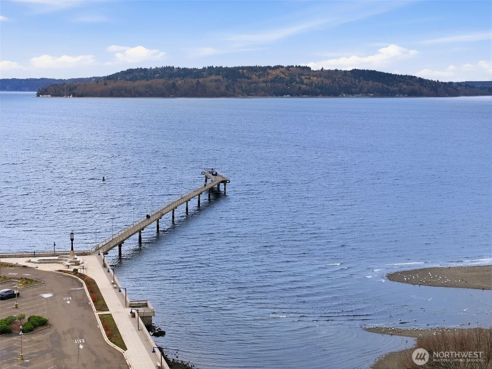 180° Views of the Puget Sound and the Olympic Mountains define this exceptional one-level waterfront condo, steps from the Des Moines Marina and Des Moines Beach Park. Front-row seat to sailboat races from the nearby yacht club and spectacular sunsets over the Sound and Olympics from your private view deck. Spacious floor plan features an open living area with fireplace and expansive windows designed to showcase the water and mountain views. Kitchen is finished with crisp white millwork, rich granite countertops, mosaic tile backsplash, stainless steel appliances, double-basin sink, and abundant cabinet storage. Primary suite with a full bathroom with jetted tub and walk-in closet with organizer. Additional bedroom and full guest bathroom and in unit laundry (W/D stay!) .Secure building with elevator access and no stairs required to reach the unit. Two covered garage parking spaces plus abundant guest parking available at the adjacent park. Highly walkable location near the marina, waterfront trails, markets, coffee shops, and dining, including Anthony’s HomePort, Des Moines. A rare opportunity to enjoy refined, low-maintenance waterfront living in one of the marina district’s most sought-after settings.