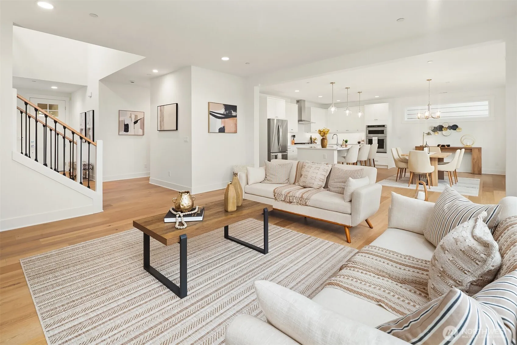 Select Homes’ new construction residence is nestled in Edmonds’ desirable Westgate neighborhood. This 5-bedroom, 3-bath home showcases elevated craftsmanship and a welcoming open-concept design throughout. Wide-plank oak hardwood floors span the main living areas, while the living room offers a cozy gas fireplace for year-round comfort. The staircase displays thoughtful detailing with a built-in bookcase and shiplap design. The entertainer’s kitchen is thoughtfully appointed with Mistério quartz countertops, a large island with seating, five-burner gas cooktop, and double oven perfect for both everyday living and hosting. A walk-in pantry provides ample storage. Just off the kitchen, the dining area is ideally situated for effortless gatherings. The first floor is complete with a main floor bedroom. Upstairs, the primary suite provides a spa-like retreat complete with a soaking tub and walk-in closet. Three additional spacious bedrooms, a full bathroom with a forest-green vanity, a roomy bonus room, and a laundry room complete the upper level. Also featured upstairs, a peekaboo view of the Olympics and Puget Sound. Step outside to a fully fenced, beautifully landscaped backyard with plenty of space for summer entertaining and play. A 3-car garage with EV charging readiness and a built-in mudroom right off the garage rounds out this exceptional home.