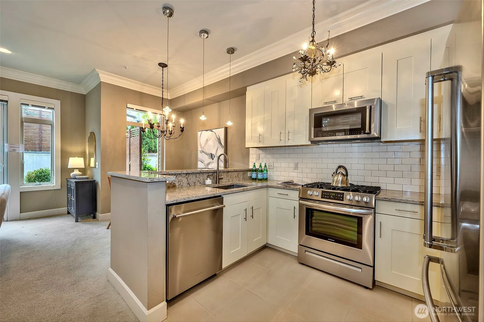 Welcome to resort-style living at coveted Point Edwards! This elegant home blends refined luxury with everyday comfort—and offers the privacy of no neighbors above or below. Soaring 12’ ceilings with custom crown moldings create an airy sense of grandeur, while built-in bookshelves frame the cozy gas fireplace and walls of windows bathe the home in natural light. A mini-split A/C system ensures year-round comfort. The chef’s kitchen shines with slab quartz countertops, tile backsplash, stainless appliances, and two large storage closets—providing pantry and utility space. A full bath on the main adds flexibility for guests. Designed for effortless entertaining, the living and dining areas flow seamlessly through French doors onto your expansive, south-facing sun-drenched patio—an inviting private garden oasis perfect for relaxing, dining al fresco, and gathering with friends. Upstairs, retreat to your luxurious primary suite featuring soaring ceilings, skylights, plantation shutters, and generous walk-in closet. The spa-inspired bath offers double vanity, slab granite counters and a spacious walk-in shower. Versatile flex room easily converts to a guest suite or home office to suit your lifestyle needs. Convenient upper-level laundry with side-by-side W/D plus additional storage enhances everyday ease. NO RENTAL CAP! Two parking spaces and additional storage are included. Resort Amenities: Pools, Hot Tubs, Exercise Facilities, 3 guest suites and more. Easy stroll to Edmonds!