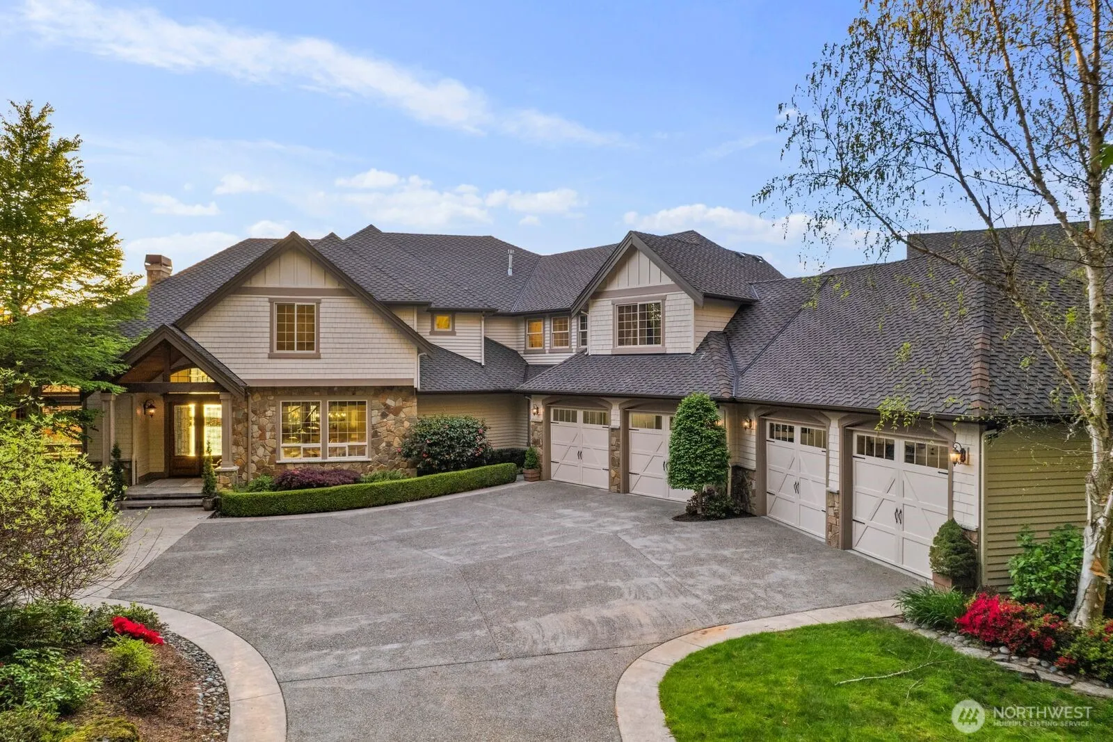 Perched on a quiet cul-de-sac, this nearly 6,000 sq ft west-facing estate captures breathtaking views of Puget Sound, Olympic Mountains, & Whidbey Island. Enjoy incredible sunsets from nearly every room in the house. A grand staircase entry makes a striking first impression, leading into an expansive great room with soaring 30-foot ceilings, exposed wood beams, & walls of windows that flood the home with natural light. Designed for effortless living & entertaining, the open-concept main floor features a chef’s kitchen seamlessly connected to inviting gathering spaces, including a covered deck with fireplace and panoramic views. A gorgeous office, walk-in pantry, large laundry room, and two powder baths complete this floor. Upstairs, three bedrooms are thoughtfully positioned on one level, each with their own ensuite bathroom. The primary suite offers a private retreat with stunning views, a fireplace, spa-like 5 piece bath, & an expansive walk-in closet. The lower level is an entertainer’s dream, complete with a 104” HD theater with 7.1 Dolby sound, wine cellar, game room, and guest suite. Multiple outdoor living areas, include a patio for dining and lounging, garden beds, and flat grassy lawns in both the front and back—an ideal blend of beauty and functionality Additional features include an elevator, whole-home sound system, and a 4-car garage with ample additional parking—offering a rare combination of scale, function, and Northwest luxury living.