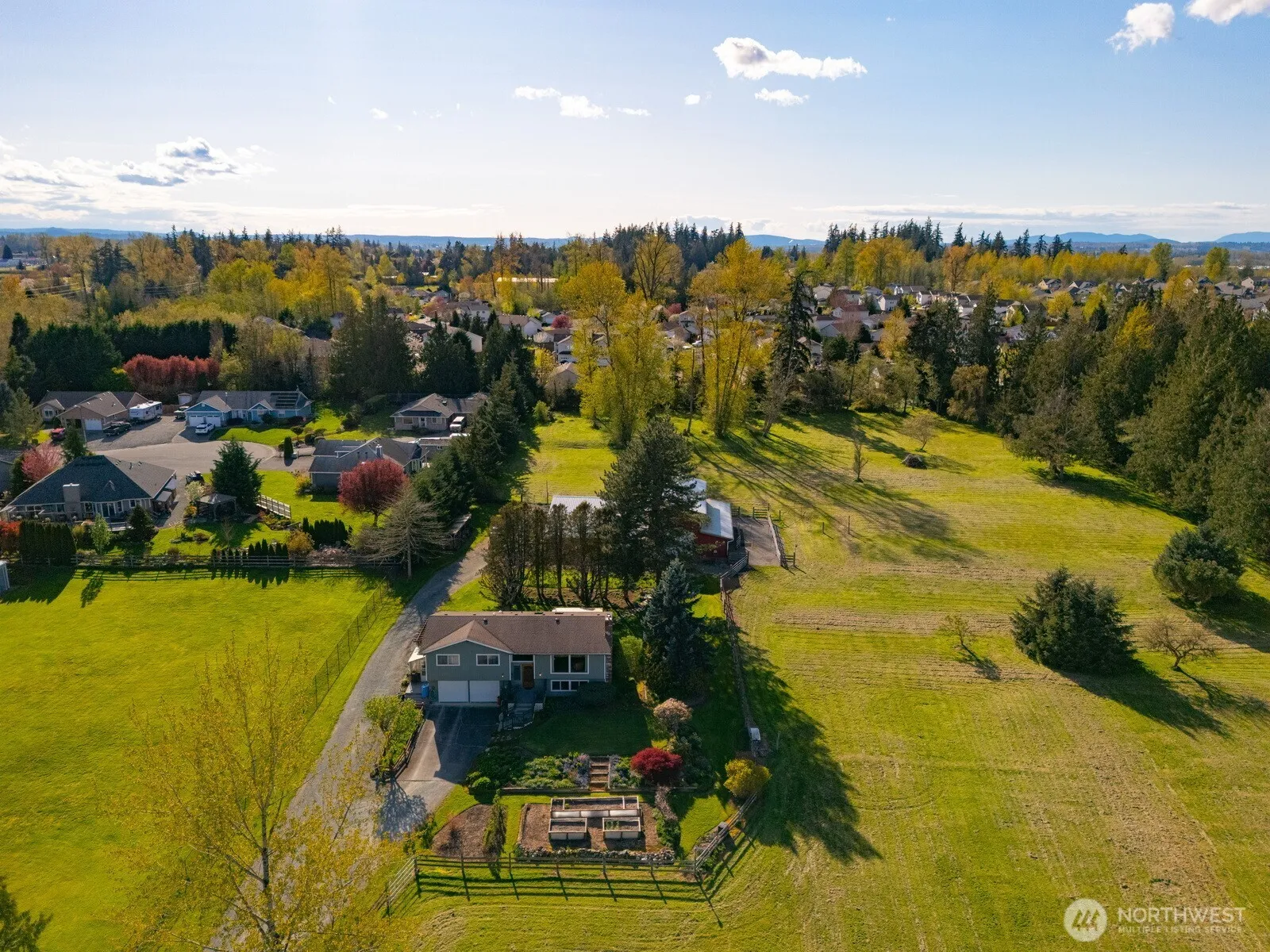 Welcome to your private 5-acre retreat, ideally situated on a highly sought after dead end lane bordering city limits, offering rare privacy with the convenience of nearby amenities and sweeping views of Mt. Baker and the Barney Lake Preserve. Just blocks from the local elementary school and minutes to town, this property blends peaceful country living with everyday accessibility. The standout feature is the impressive 3,000 sq ft shop, complete with a new roof, insulation, and full electrical, perfect for hobbies, storage, or business use, plus two enclosed side sheds for added versatility. Equestrian and hobby farm enthusiasts will appreciate the 550 sq ft barn with a 3-horse stable, full tack room, hay loft with elevator, and dedicated paddock. Both pasture areas are fully fenced with electric fencing and include water access, ready for livestock. Designed with sustainability in mind, the property also features EV charging and 3 rain catchment systems for gardening and livestock needs. Garden lovers will be drawn to the immaculate flower and vegetable garden with an automated watering system, along with a greenhouse for year-round growing. The 3-bedroom, 1.75-bath home offers 1,840 sq ft with an open-concept kitchen, updated cabinetry, and a brand-new convection stove. Hardwood floors, two fireplaces, a new furnace, and a recently updated lower-level bathroom with a walk-in shower. A rare opportunity to own a versatile property with a prime, private location!