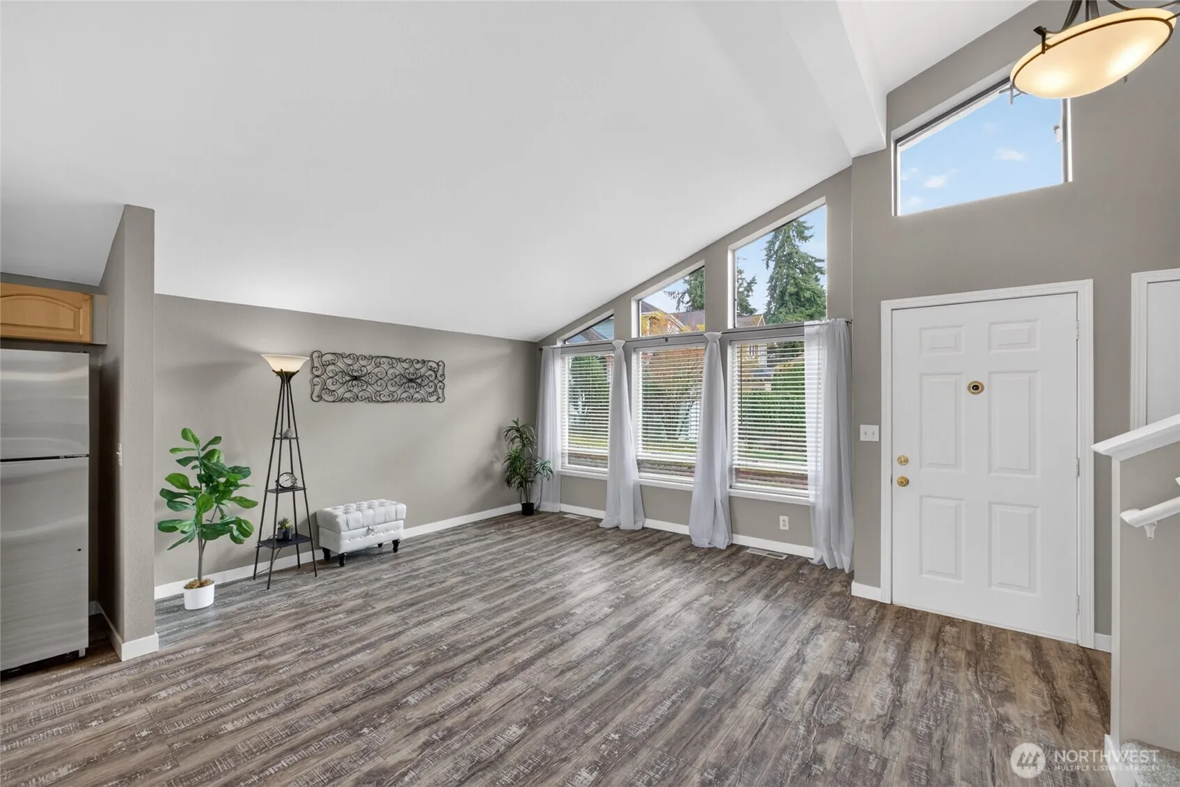 Welcome to this beautifully maintained 3 Bedroom, 2.5 Bath tri-level home offering 1,450 sq ft of thoughtfully designed living space. Featuring luxury flooring in the main living areas, hallway, and primary bath, along with brand new carpet throughout, this move-in ready home perfectly blends comfort, style, and modern updates. The bright, updated kitchen is a true standout, showcasing granite countertops, a gas stove, ample cabinetry, and sleek stainless-steel appliances- ideal for both everyday living and entertaining. The refreshed bathrooms feature elegant quartz countertops with tile flooring in the upstairs main bath and durable vinyl in the downstairs bath/ laundry room. Relax by the cozy gas fireplace or host gatherings in the inviting open-concept living and dining areas filled with abundant natural light. The home is also hardwired for a generator, offering added convenience and peace of mind year-round. A generously sized garage provides ample storage and workspace options. Step outside to a fully fenced backyard with a spacious deck- perfect for entertaining, outdoor dining, or simply unwinding- along with a sprinkler system to keep the yard lush and a garden shed for additional storage. Ideally situated on a quiet cul-de-sac in a desirable neighborhood between Seattle and Tacoma, this home offers easy access to major commuting routes, shopping, dining, parks, and everyday conveniences.