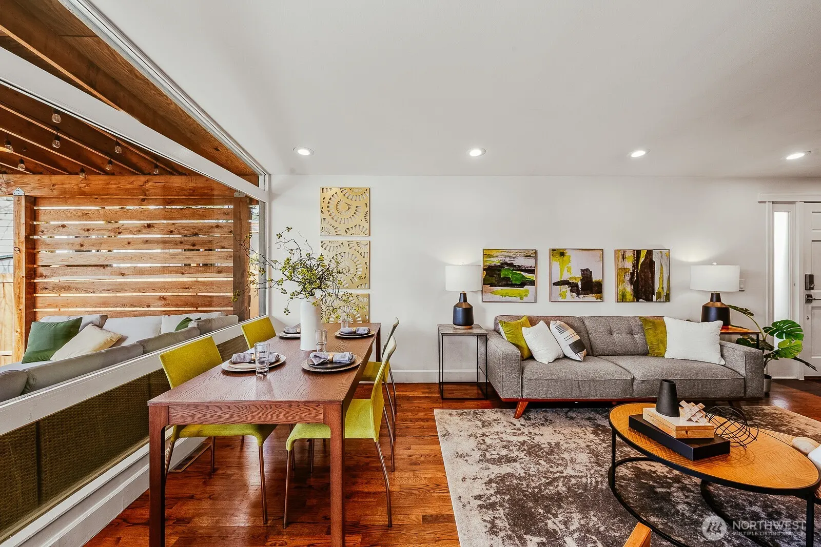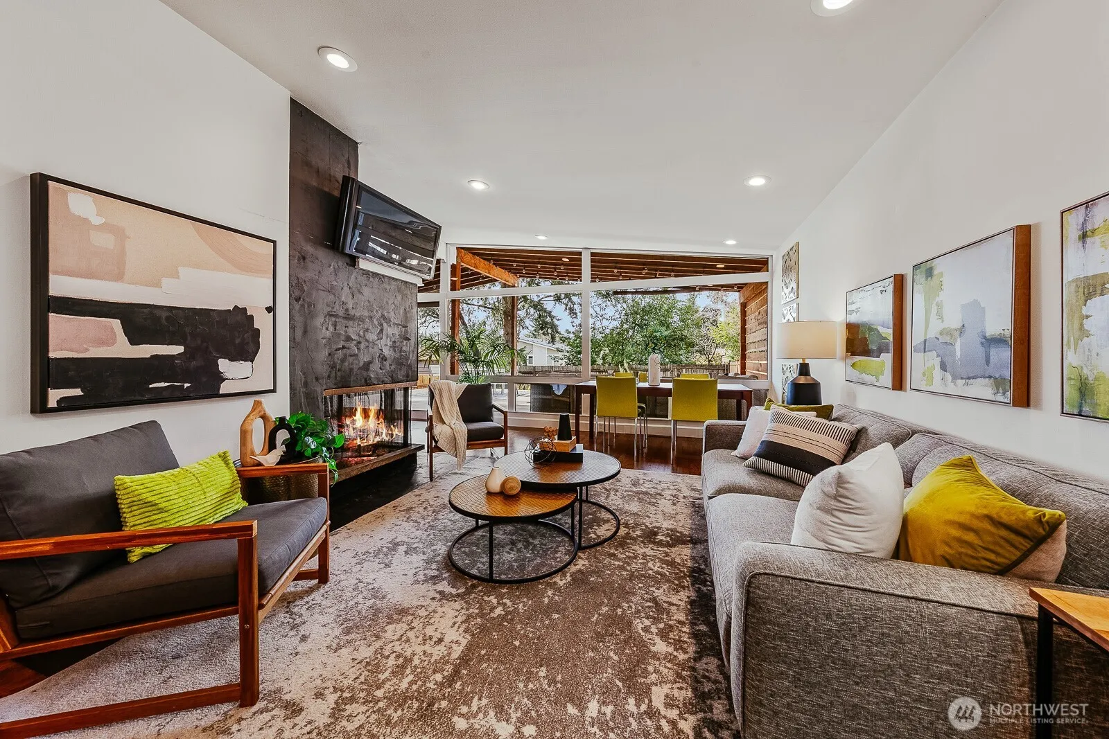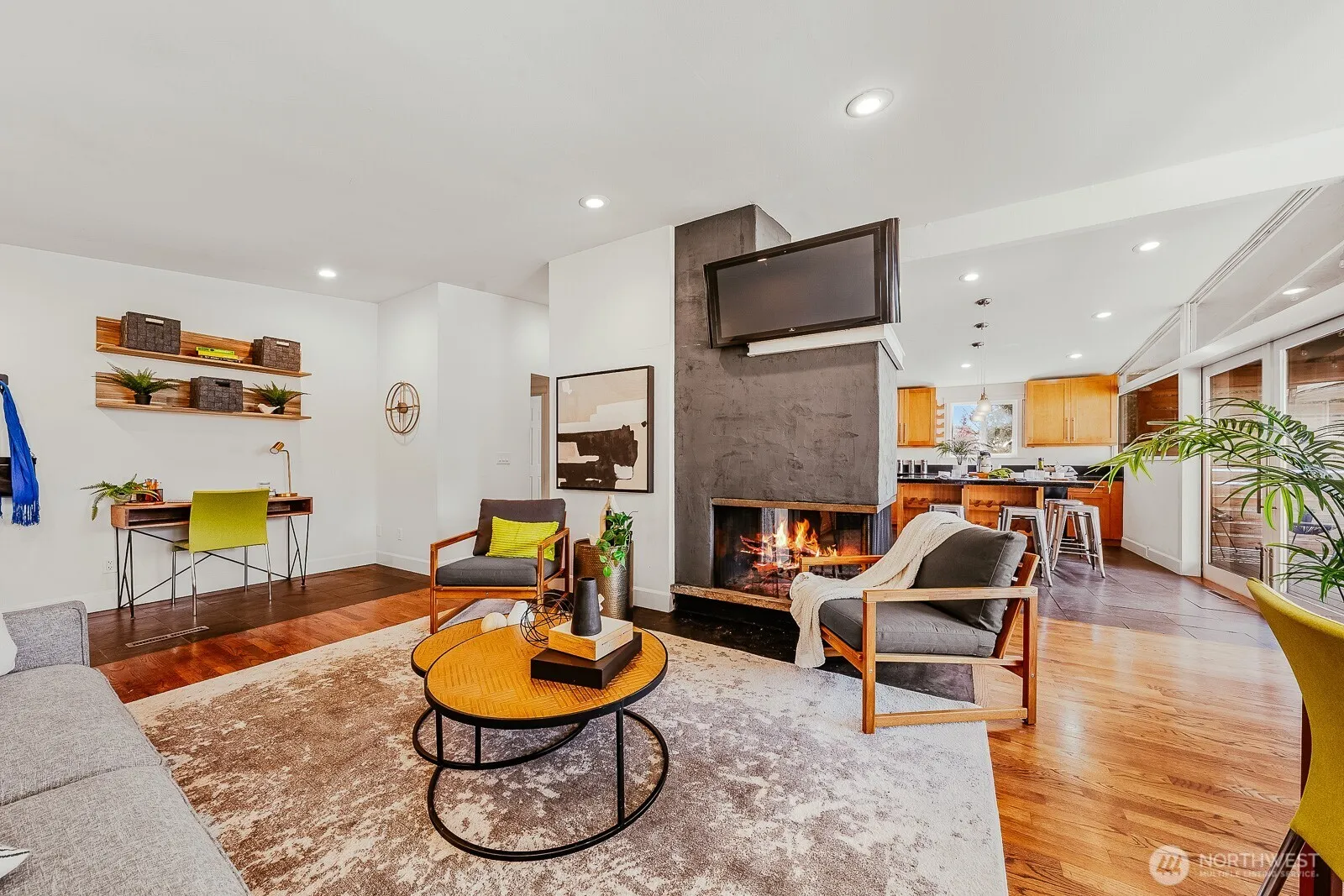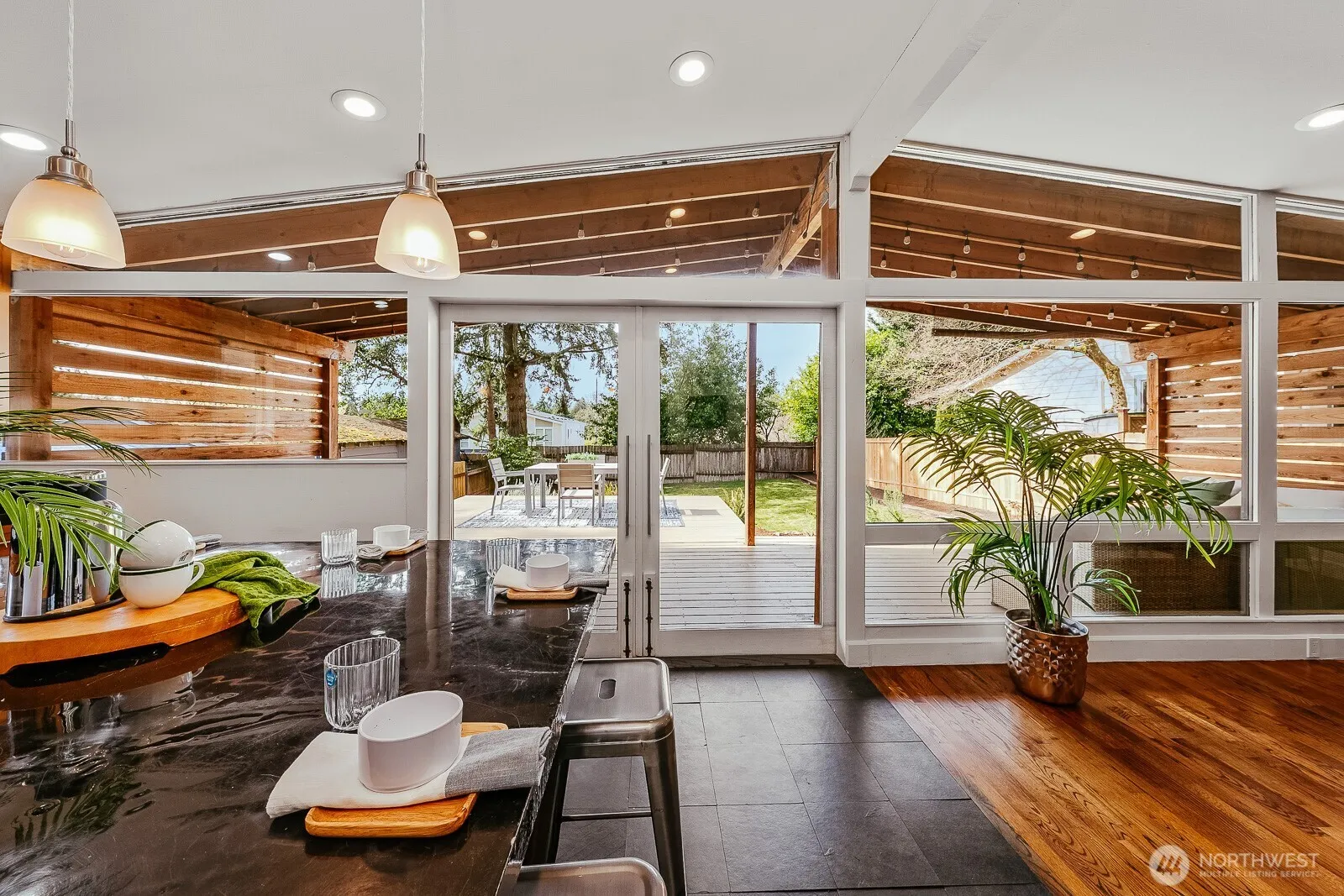 Welcome to this quintessential Ridgecrest midcentury modern, where soaring ceilings and a wall of glass create a light-filled living space anchored by a central fireplace. Double sliding doors open wide to a massive covered deck—perfect for year-round entertaining—flowing effortlessly into the expansive, fenced backyard. The kitchen is made for hosting, with plenty of storage, concrete countertops and a huge island where everyone naturally gathers. Hardwood and stone floors add warmth and texture, while the decadent bath invites you to unwind with a walk-in two-headed shower, tub-for-two and separate water closet. The primary bedroom offers two closets plus extra space for a home office, workout area, or quiet retreat. Great off-street parking plus a generous one-car garage/workshop. You’re just across from Hamlin Park, with The Ridgecrest Public House and everything in North City and at 145th an easy stroll away, not to mention easy access to light rail.