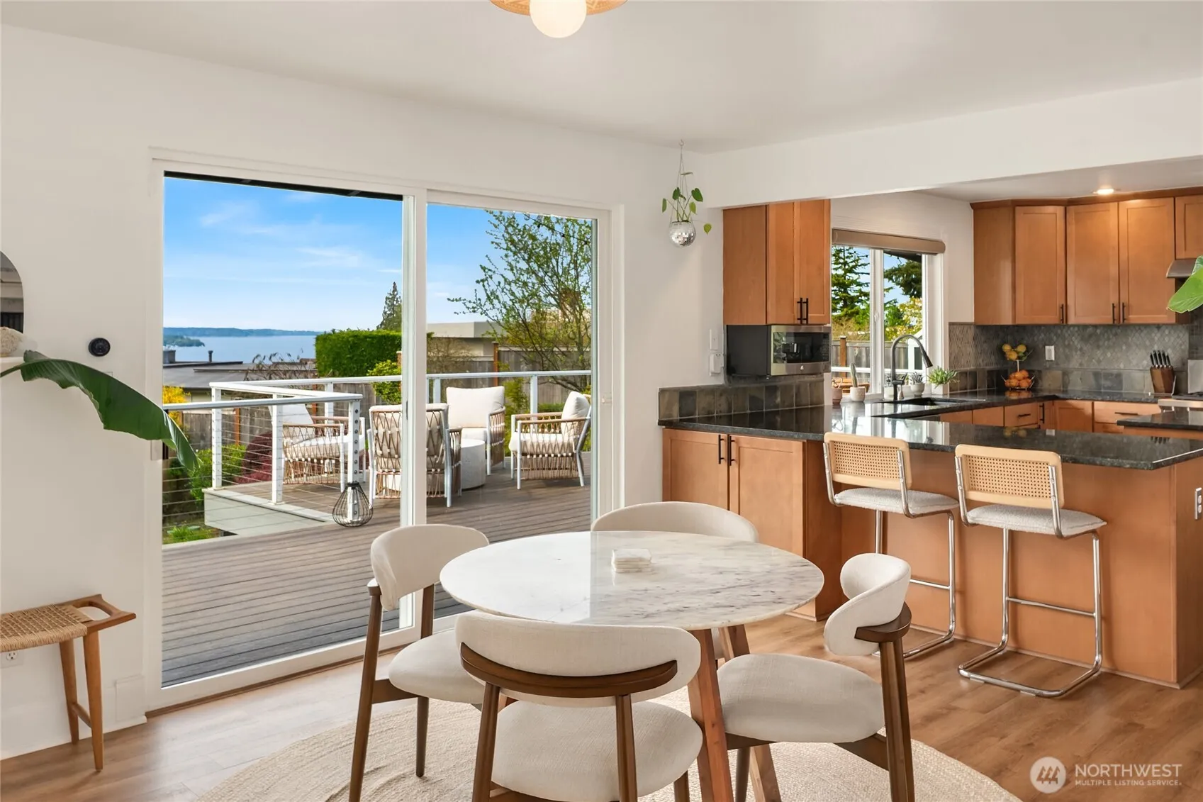 A true mid-century modern retreat, thoughtfully updated and quietly set on a private view-lot in Marine Hills. This light-filled, level-entry home blends clean design with natural beauty, offering sweeping Puget Sound and Olympic Mountain views from nearly every angle. The heart of the home is an open-concept living space and expansive, chef’s kitchen with contemporary finishes, Wolf range, & seamless access to the view deck & patio—ideal for everyday living & effortless entertaining. Spot wildlife & ships passing through the channel, & unforgettable sunsets from your own backyard. The serene primary suite is reimagined with a spa-inspired en suite bathroom complete with freestanding soaking tub, walk-in shower, and refined finishes. Lush, curated landscaping surrounds the home, highlighted by a tranquil rock waterfall, fully fenced yard, greenhouse & planting beds. A composite deck with powder-coated stainless cable railing system provides the perfect perch for relaxation. The lower level offers exceptional flexibility: separate entrance, kitchenette, & direct access to patios & walkways—ideal for guests or multi-gen living. Dual-zone HVAC, 2 water heaters, loop driveway, ample parking, & neighborhood pool, pickle-ball courts & buried power lines, add everyday convenience. Located just minutes from Redondo Beach, Des Moines Marina, Saltwater State Park, & shopping. A rare opportunity to own a private, view-driven home with timeless design & modern livability in Marine Hills.