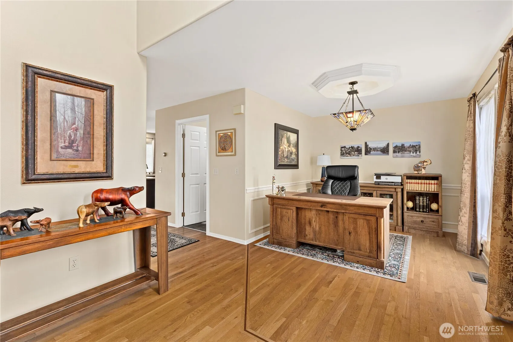 Lovely, well-cared-for 4-bedroom home featuring a spacious primary suite with a beautifully renovated bath—heated tile floors, dual shower heads with body spray, quartz counters, and a custom closet. Bright, cheerful interiors with designer colors, gleaming hardwoods, and elegant details like tray ceilings and chair rail accents. Updated kitchen with new cabinets, quartz countertops, and a new range & dishwasher (Nov 2025). Renovated laundry room and refreshed secondary bath. A private backyard sanctuary, great for entertaining. Additional perks: tankless water heater and abundant storage throughout.
