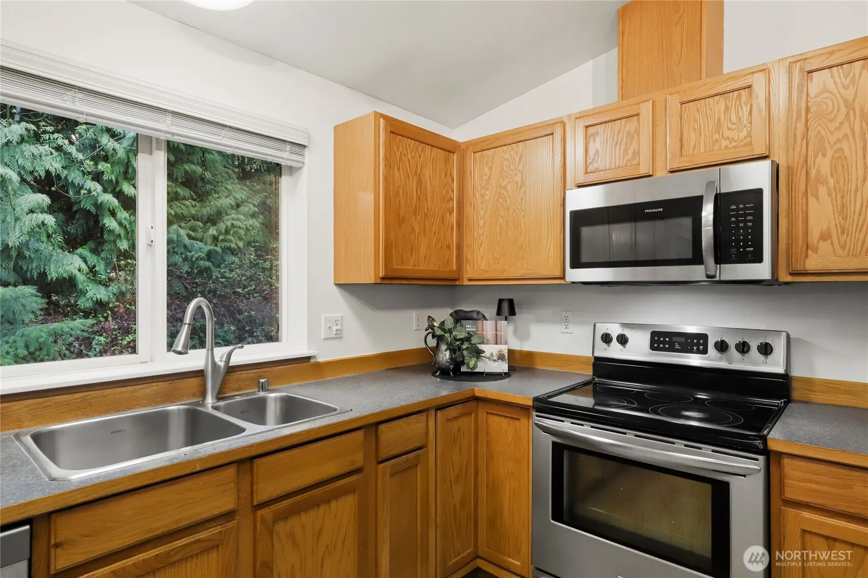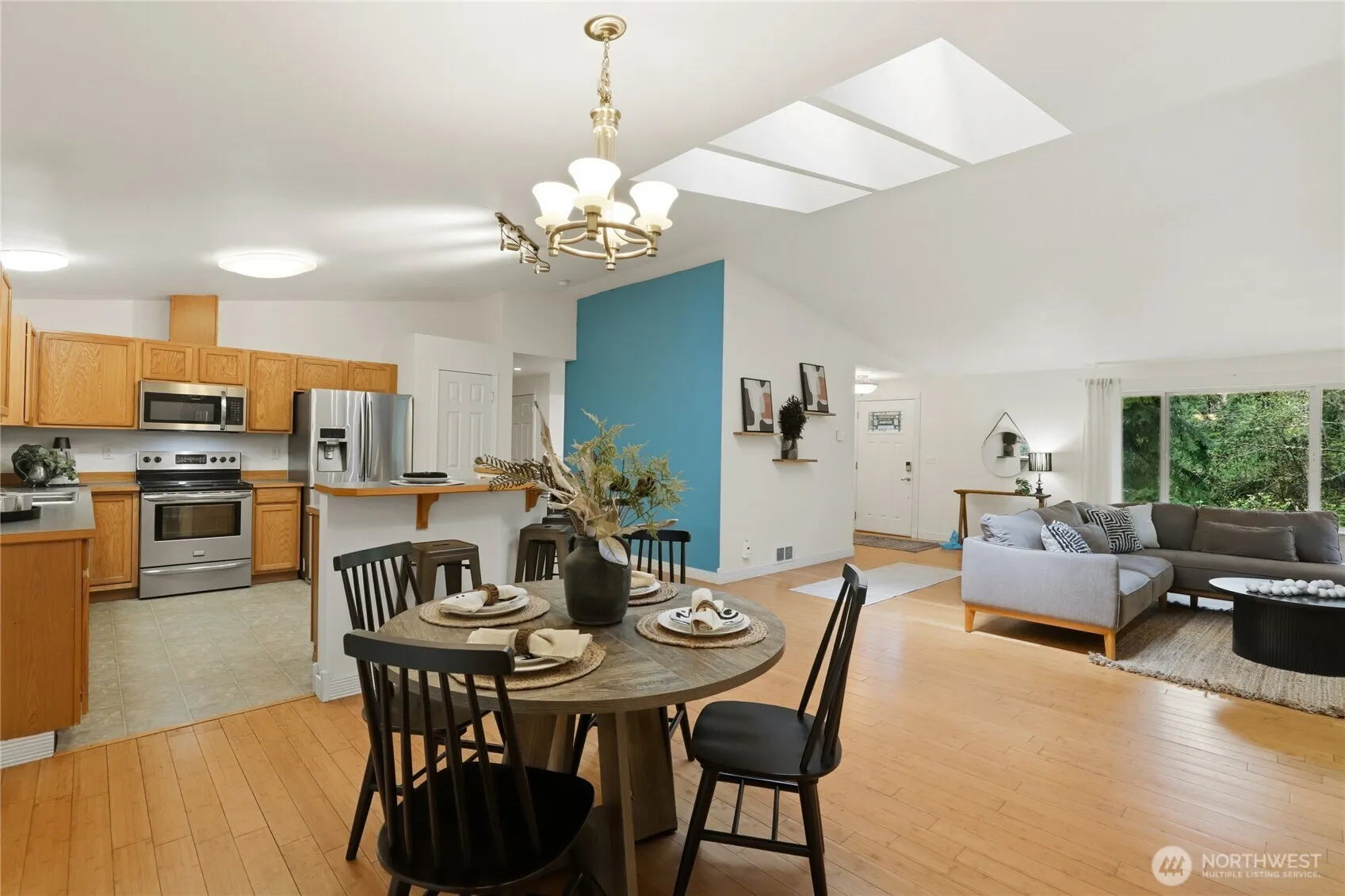 Quiet and welcoming rambler nestled among evergreens, where birdsong and serenity surround you. This charming 3-bedroom, 2-bath home is perched above the street, offering privacy and a peaceful setting accessed by a slightly steep driveway. Enjoy beautiful west-facing sunsets filtering through the trees and unwind in the shaded backyard on warm summer days. Inside, bamboo flooring flows through the great room, kitchen, dining area, and primary closet, adding warmth and continuity to the open living spaces. The spacious primary suite features a walk-in closet with custom organizer and a thoughtfully designed layout. The open-concept kitchen offers abundant counter space, ample cabinetry, and a lovely view of the backyard—perfect for both everyday living and entertaining. Sliding glass doors off the dining area lead to your private, wooded retreat, ideal for relaxing or hosting gatherings. Situated on 2.5+ acres, this property provides the best of quiet country living while remaining just minutes from the amenities, shopping, and dining of Silverdale and Poulsbo.