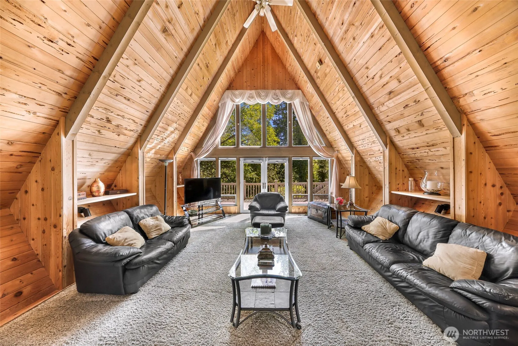 This stunning three-story retreat offers the perfect balance of privacy, character, and everyday comfort. With 3,430 sq ft of thoughtfully designed living space, this 4-bedroom, 2.5-bath home invites you to live in a woodland hideaway on 5+ acres in the heart of Mount Vernon. The main floor features a breathtaking living room with vaulted A-frame ceilings, a floor-to-ceiling fireplace, and dramatic windows overlooking the backyard, along with a dining room, kitchen, bedroom, and ¾ bath. Upstairs offers two bedrooms, a full bath, and laundry. The lower level includes a second fireplace, a bedroom, ¾ bath, private sauna, and additional living/recreation spaces. Warm knotty pine interiors create an inviting, lodge-like feel, while expansive windows fill the home with natural light and showcase the peaceful surroundings. The spacious layout flows across multiple levels, ideal for gatherings, quiet retreats, or working from home. Enjoy the full wrap around deck through all four seasons and watch the wildlife frolic in your backyard. The basement provides its own entrance appealing to multi-generational living situation. Outside, enjoy open acreage, a multi-use outbuilding, and a long private driveway, just minutes from I-5, shopping, schools, and medical facilities. It’s more than a home – it’s a lifestyle.
