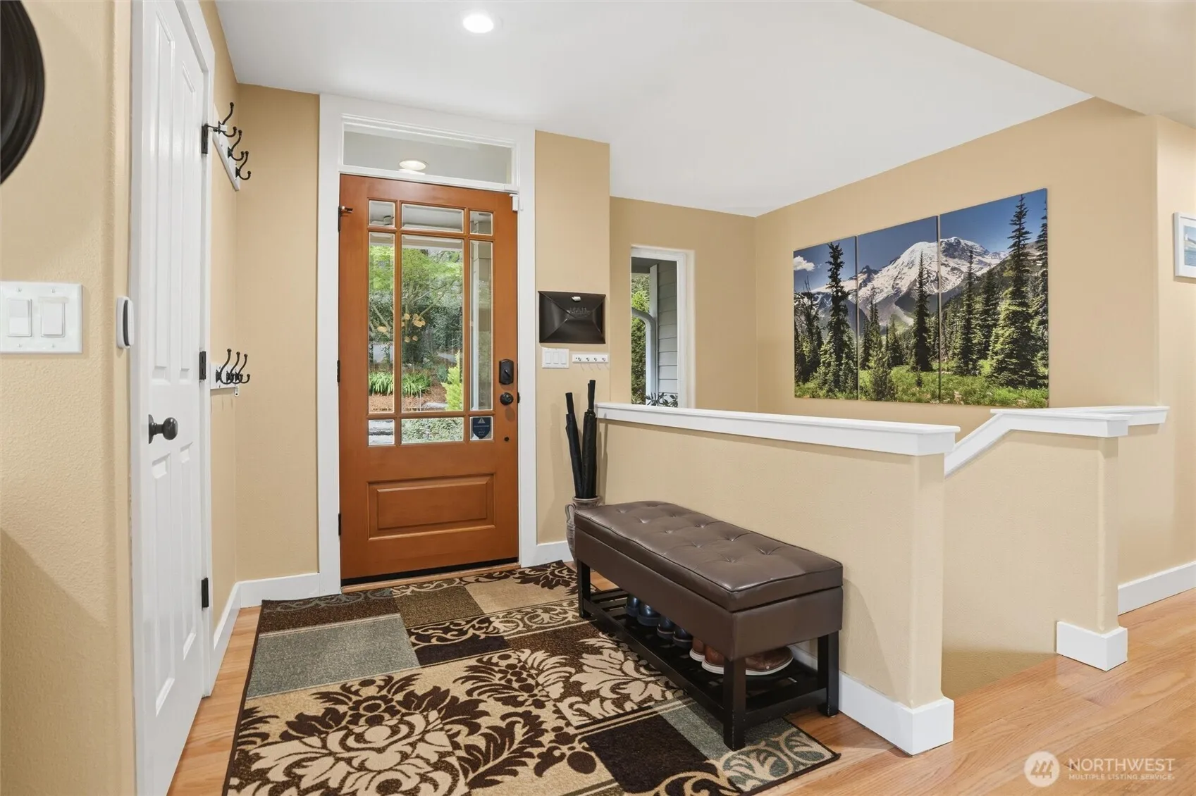 A truly special setting unfolds on 1.33 acres where this beautifully updated home feels like a peaceful retreat. Nestled among the trees with natural light streaming through skylights and windows provides an appealing and welcoming scene of privacy and tranquility. Designed with main floor living, this home offers a chef-style kitchen featuring rich cherry cabinets, granite countertops, stainless steel Jenn-air appliances, and an island bar ideal for eating and entertaining. Warm oak hardwood floors flow throughout the kitchen, dining room, and living room. The beautiful living room fireplace creates depth and warmth that can be viewed from the kitchen and dining area. Step onto the private low maintenance composite deck from the kitchen, living room, or primary suite and enjoy the serene, towering tree-lined setting. The primary suite includes a 5-piece deluxe bath. The 3-bedroom home with an additional versatile room offers excellent flexibility. The spacious versatile room on the lower level can serve as an exercise room or a bedroom. The lower level also includes a bonus room with a modern Jotul gas fireplace, wet bar, cherry cabinets and granite countertops. Complete with a security system, adjustable lighting, picturesque landscaping, and a 2-car garage with glass panel garage doors that deliver natural light to the space, this peaceful setting is minutes from Highway 16, downtown Gig Harbor, restaurants, parks, and outdoor adventures.