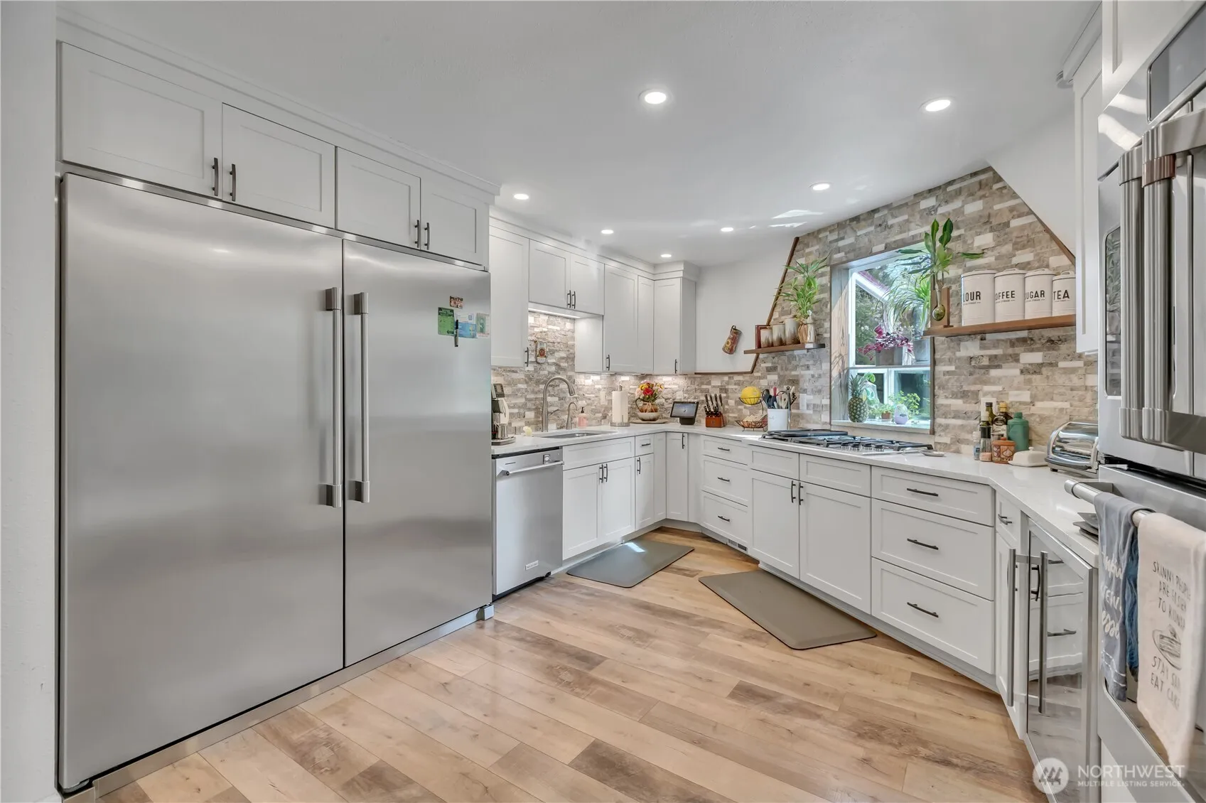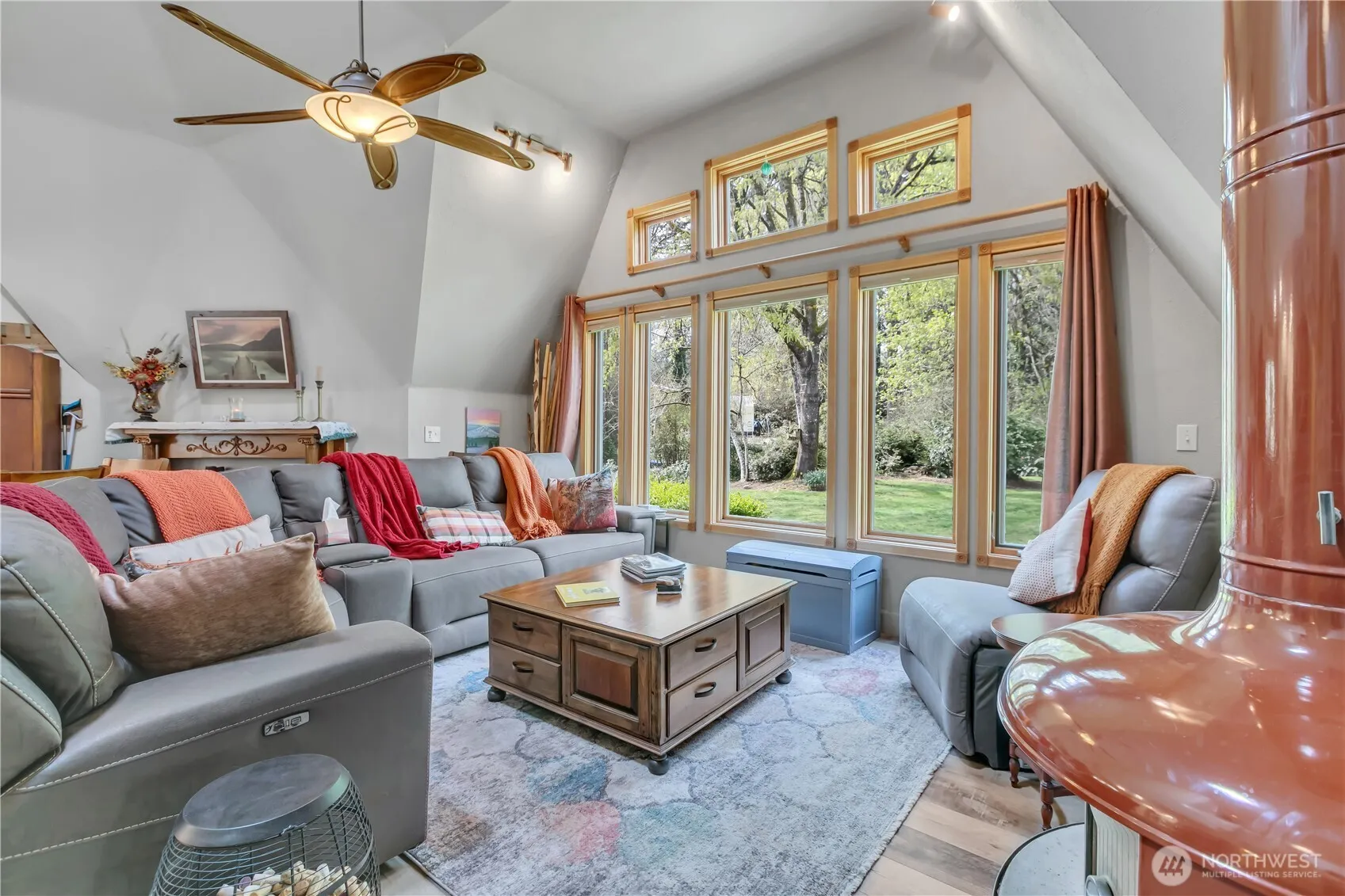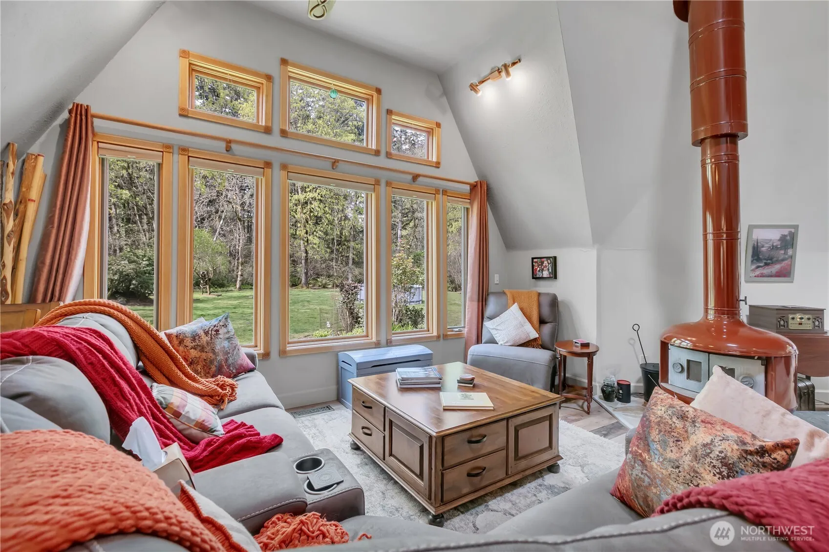 Charming Geodesic Retreat on 1.75 Park-Like Acres! Discover timeless character & unique architectural appeal in this one-of-a-kind home set on beautifully maintained, park-like grounds. Filled with old-world charm, the home features beautiful flooring, cozy alcoves, and walls of windows that bring in abundant natural light. The updated kitchen offers quartz counters, a garden/herb window, stainless steel appliances, full-size side-by-side refrigerator/freezer, double ovens, and a 5-burner propane cooktop. Recent updates include luxury vinyl plank flooring, exterior paint, bath remodels, kitchen remodel & more. With 3 spacious bedrooms & 3 baths (1 full, 2 three-quarter), including a large primary suite w/updated bath, the flexible layout provides excellent separation w/2 upstairs areas & a lower level—ideal for privacy or multi-use living. The great room features a woodstove, plus a gas fireplace for added warmth & ambiance. Outside, enjoy meticulously maintained grounds with mature rhododendrons, azaleas, garden beds, and abundant plantings. Two “fruit cocktail” trees produce peaches, cherries, apricots, and plums, plus additional fruit trees, along with raspberries, blueberries, and even artichokes. Large container pots with butterfly-friendly plants are included. A rare opportunity—move in and enjoy!