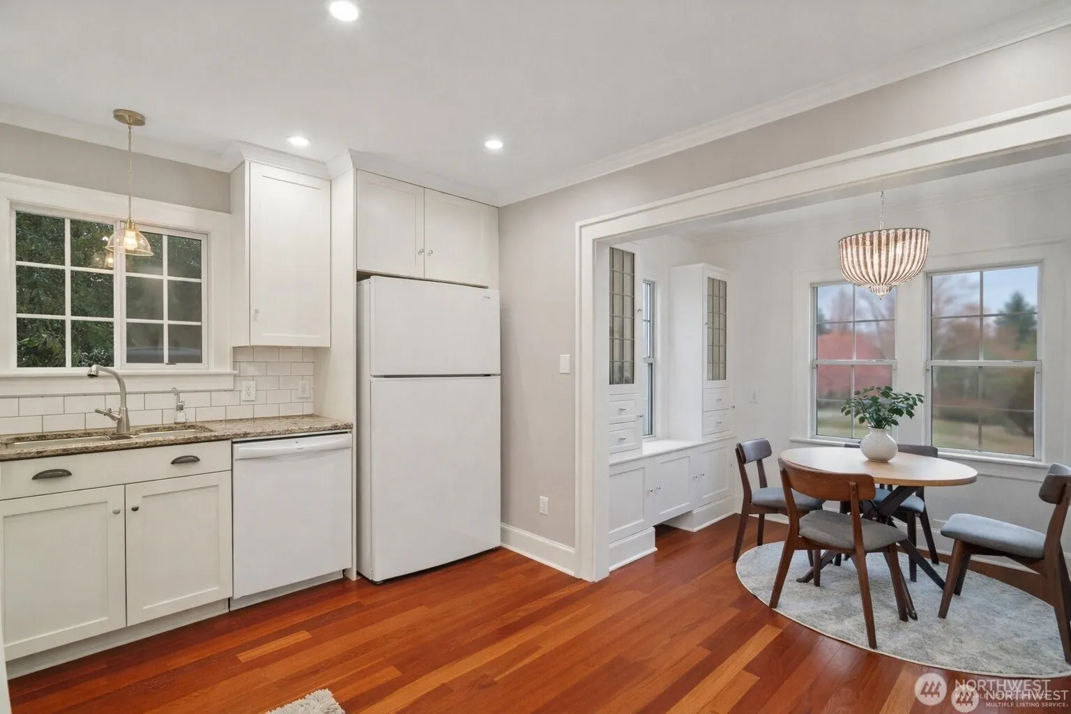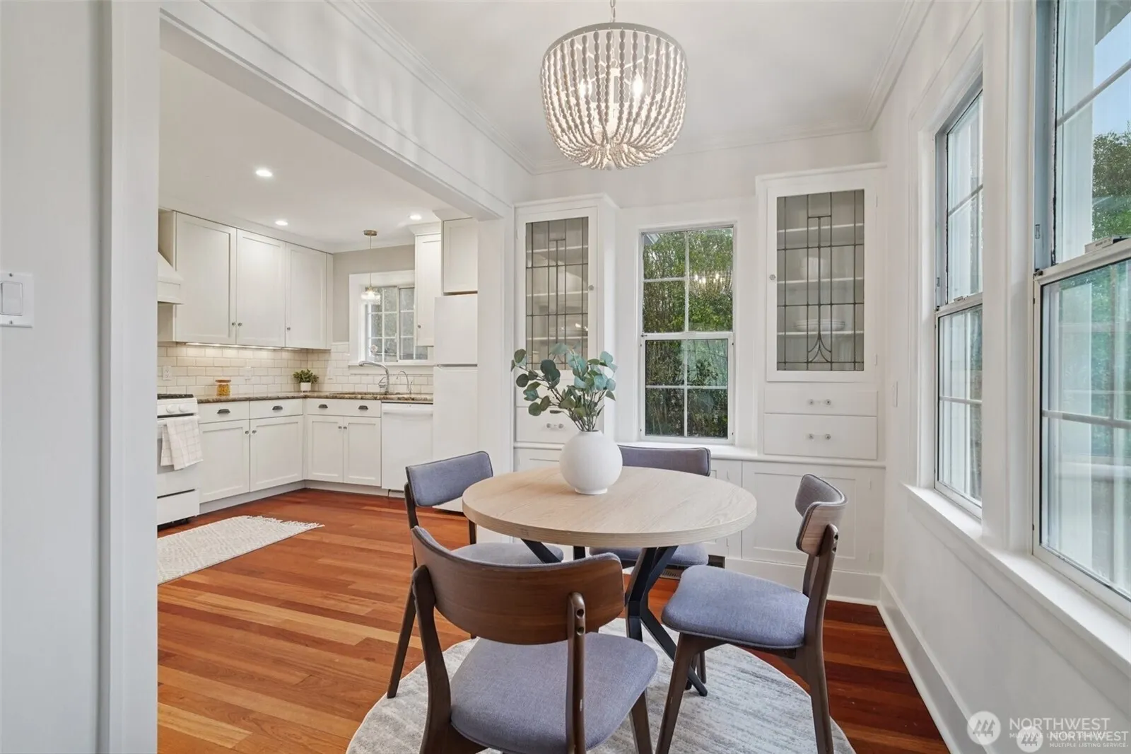 Classic 1923 Craftsman refreshed with thoughtful updates while maintaining its original character. Main floor features a primary bedroom and an updated bathroom with heated floors. Exceptionally spacious kitchen offers generous room to cook and gather, complete with granite counters and cherry wood flooring. Newly refinished hardwood floors run throughout. Lower level includes a generous family room with second gas fireplace, along with an additional bedroom and full bathroom—ideal for guests or flexible living. Conveniently located with easy access to transit and downtown Seattle.