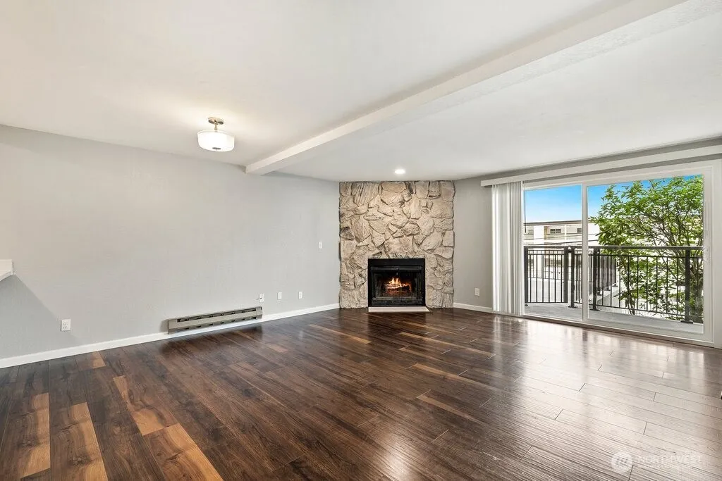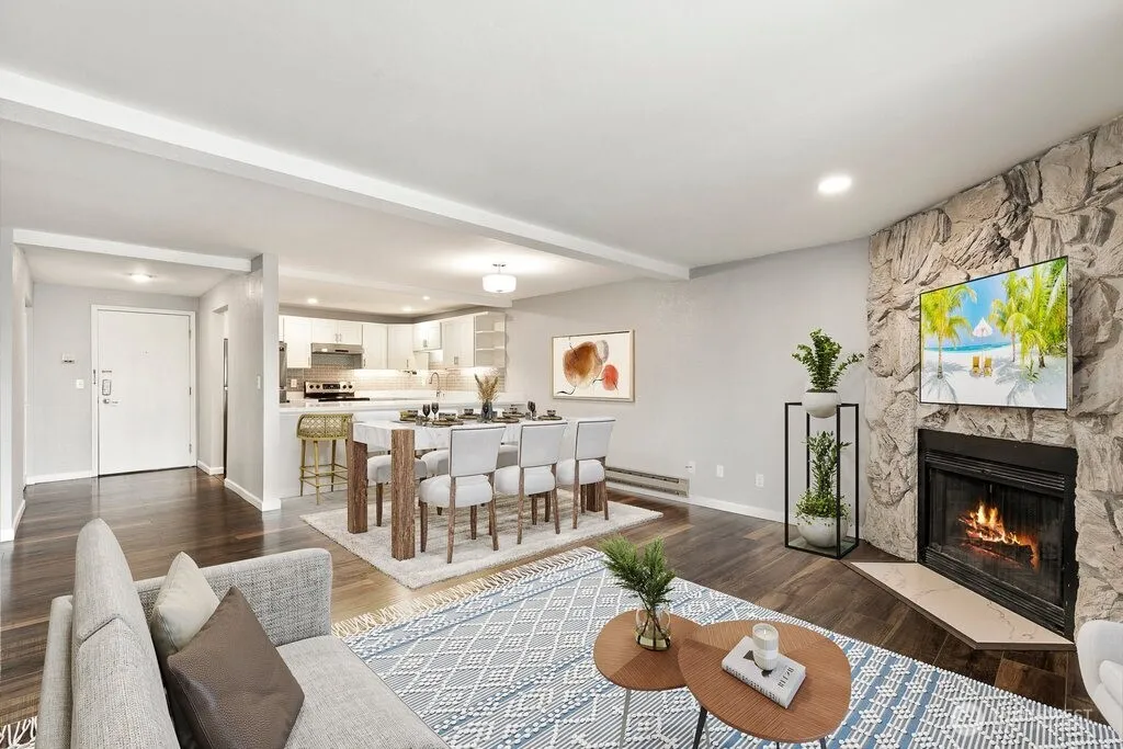 Experience modern urban living at its finest in this fully renovated gem at South Terrace! This bright and airy 2-bedroom, 1.75-bath condo blends effortless style with complete comfort, boasting a high-end transformation from top to bottom. Step inside to discover stunning new engineered hardwood flooring, fresh recessed lighting, and crisp, updated blinds throughout. The kitchen is a true centerpiece, featuring sleek quartz countertops, a large breakfast bar for casual dining, and a suite of newer appliances. The open-concept living area flows beautifully, anchored by a cozy wood-burning fireplace, perfect for quiet Seattle evenings. Retreat to the private primary suite, complete with its own 3/4 bathroom and seamless access to your personal deck. Peace of mind comes standard; the complex has recently undergone a major exterior refresh, featuring all-new siding and windows. You’ll enjoy the perks of a premier location with incredible walkability to the neighborhood’s best cafes, parks, and local amenities, all while benefiting from some of the lowest HOA dues in the area. This turn-key home also includes a private storage unit and assigned covered garage parking. Discover the perfect blend of value, convenience, and sophisticated style in one of Seattle’s most sought-after pockets!